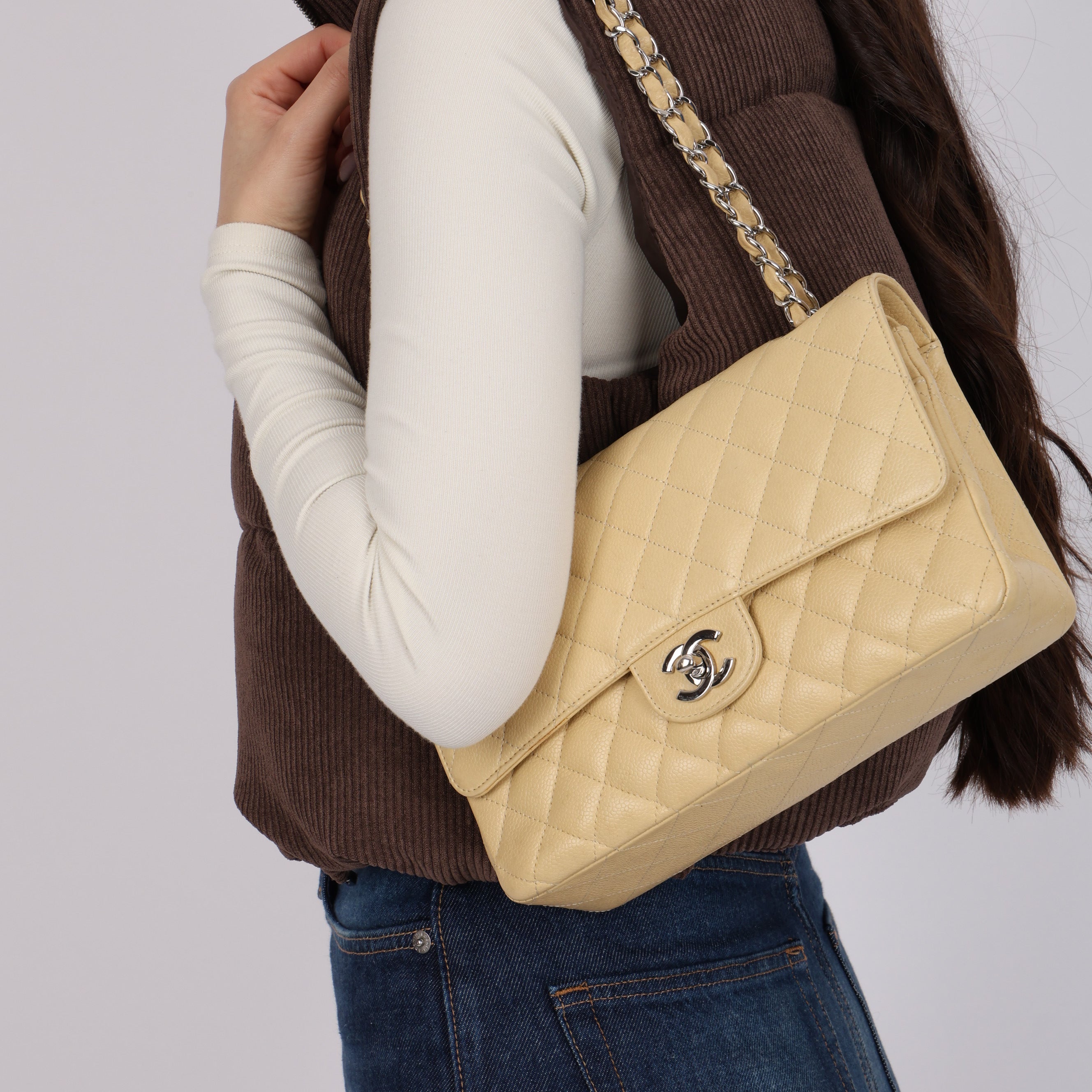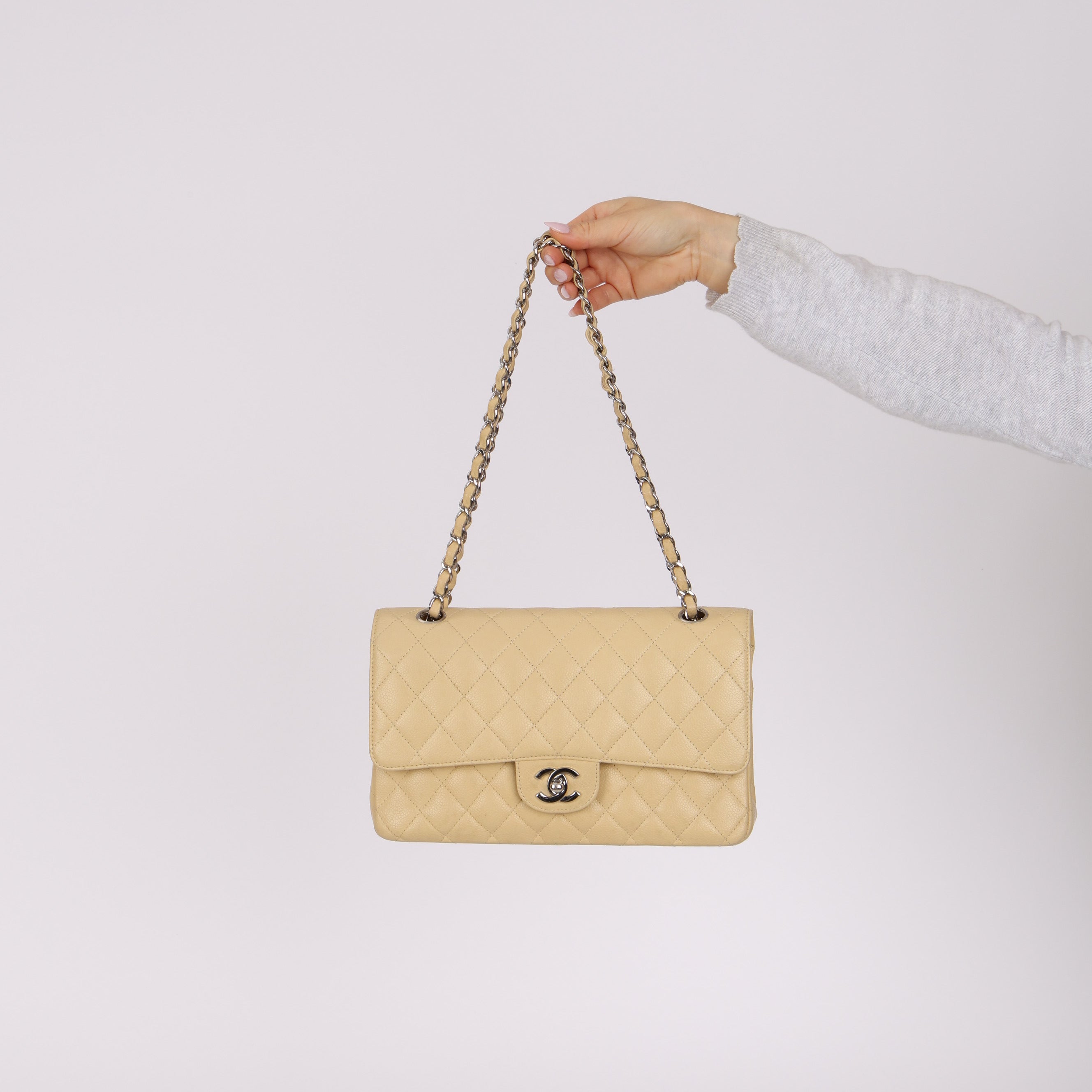 Chanel 2007 Light Beige Quilted Caviar Medium Double Flap SHW