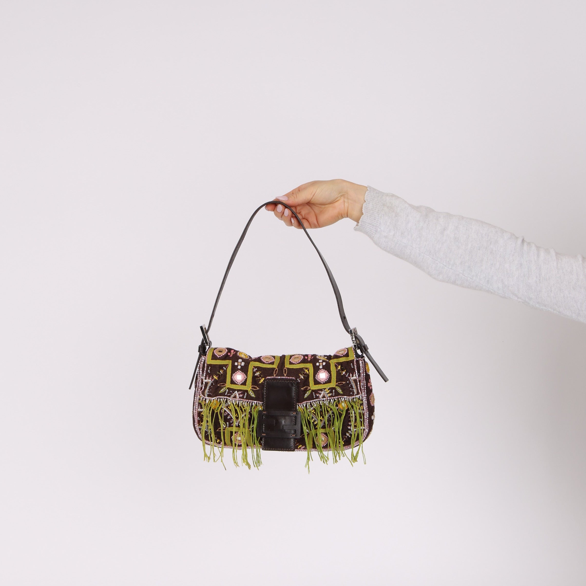 Limited Edition Fendi Brown Embroidered Fringe Beads Baguette Bag
