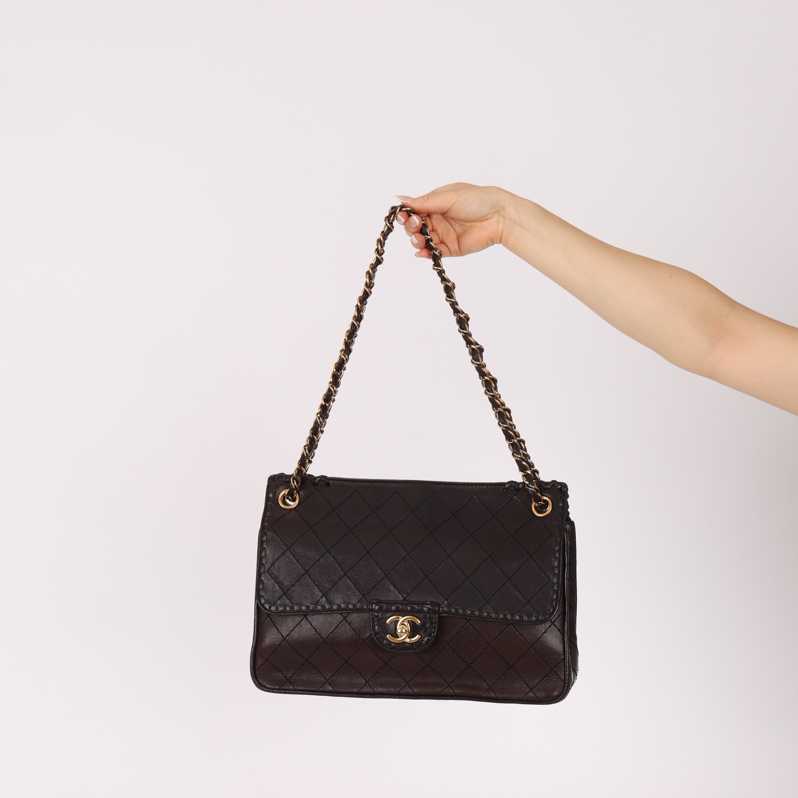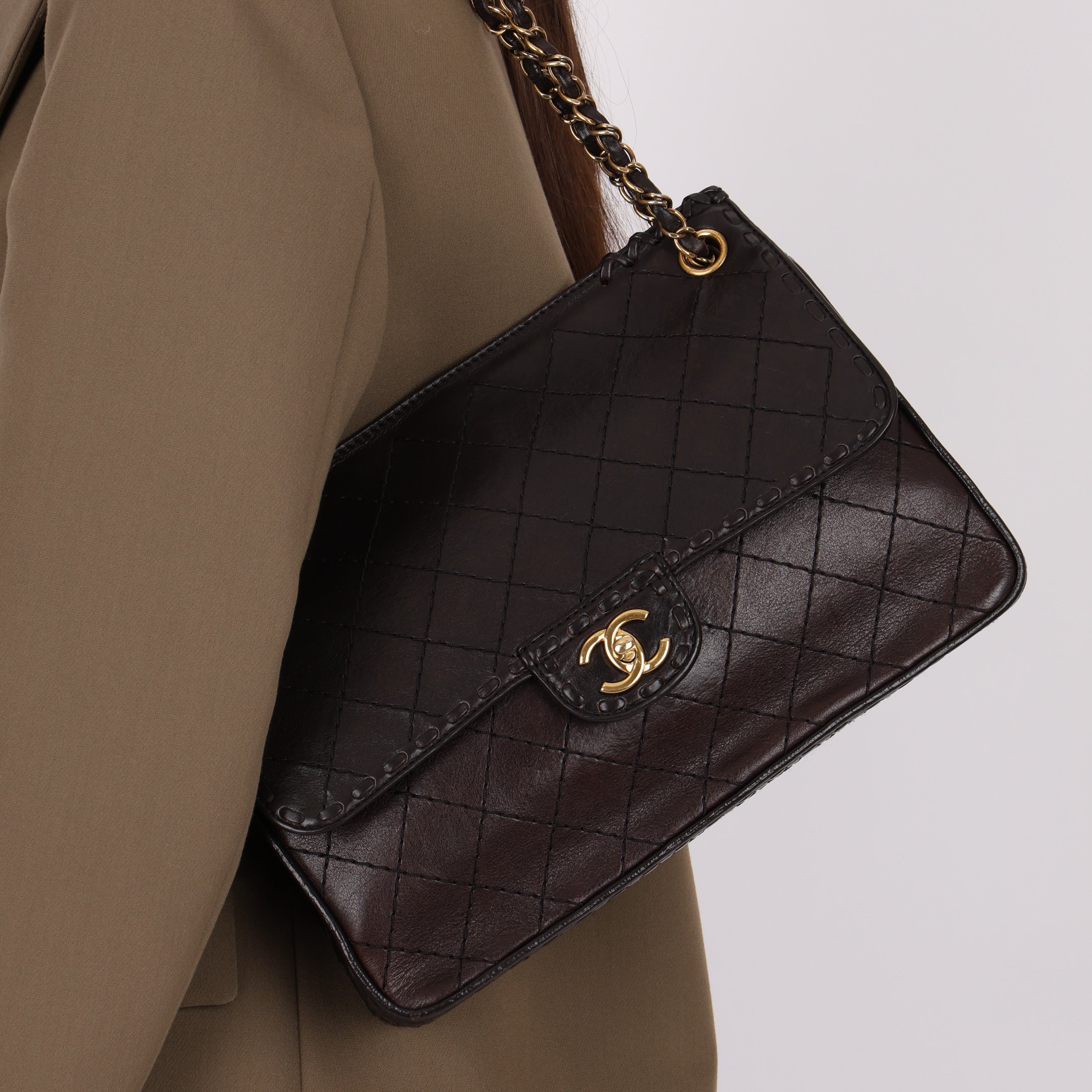 Chanel 2014 Chocolate Paris-Edinburgh Calfskin Whipstitch Large Flap