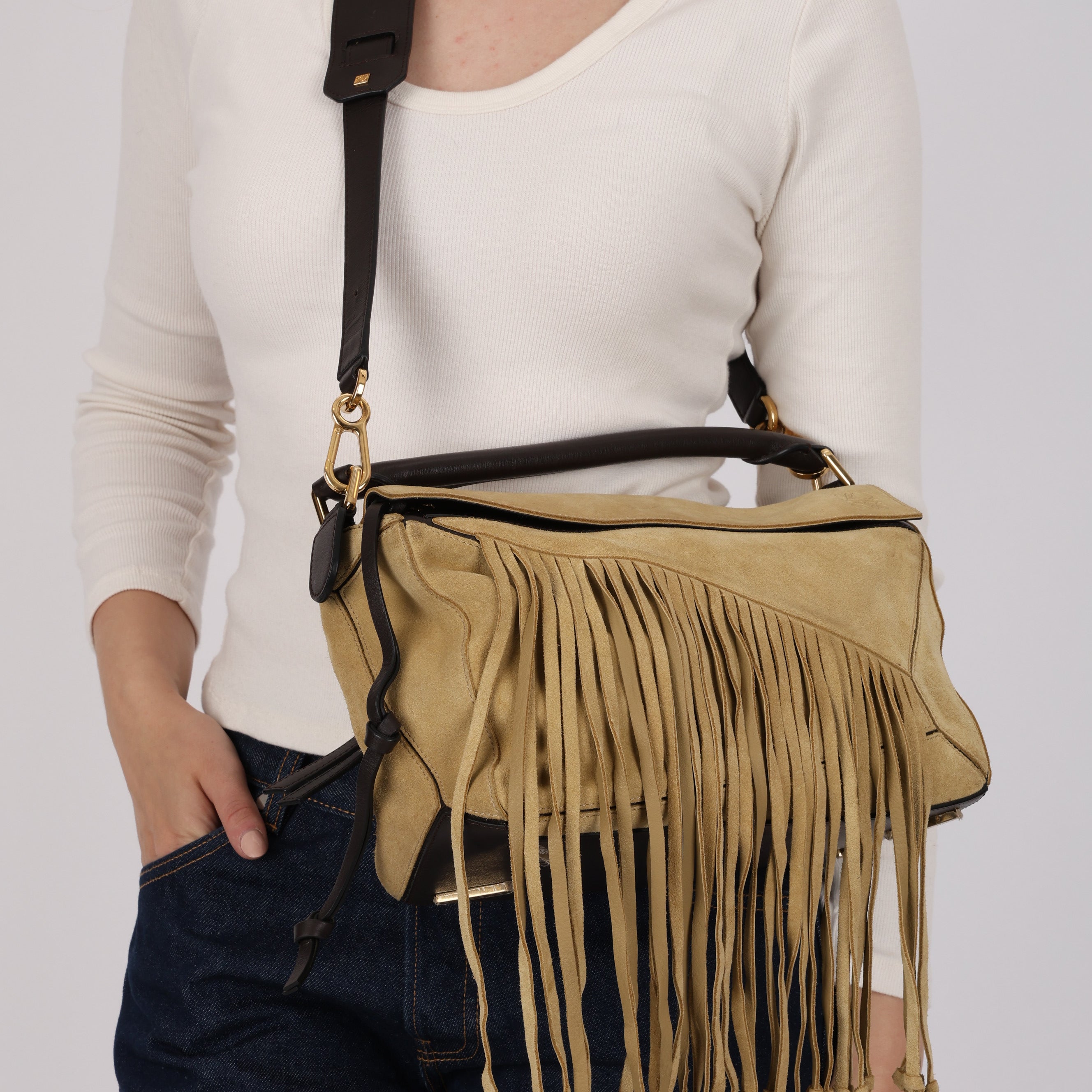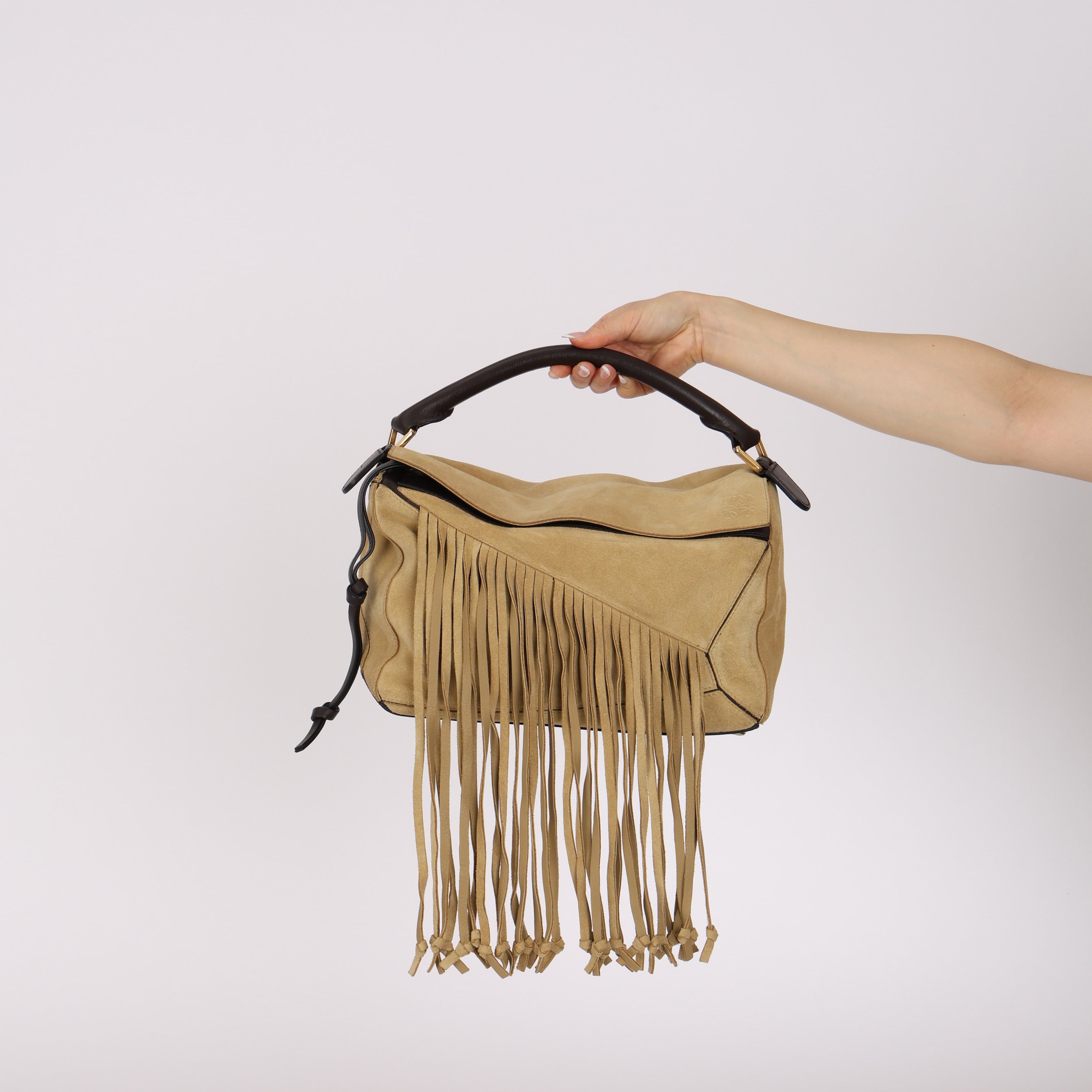 Loewe Sand Beige Suede Fringe Medium Puzzle Bag
