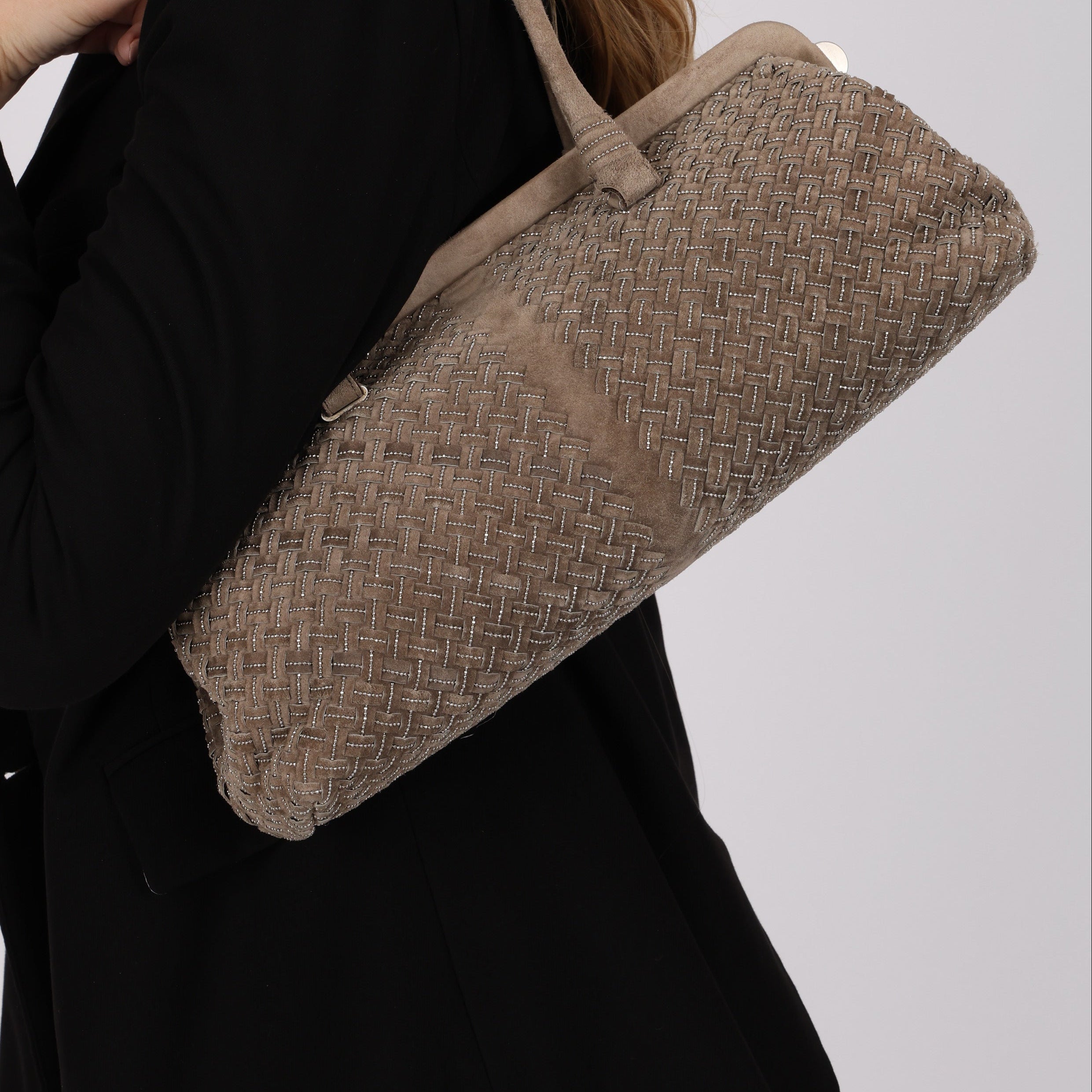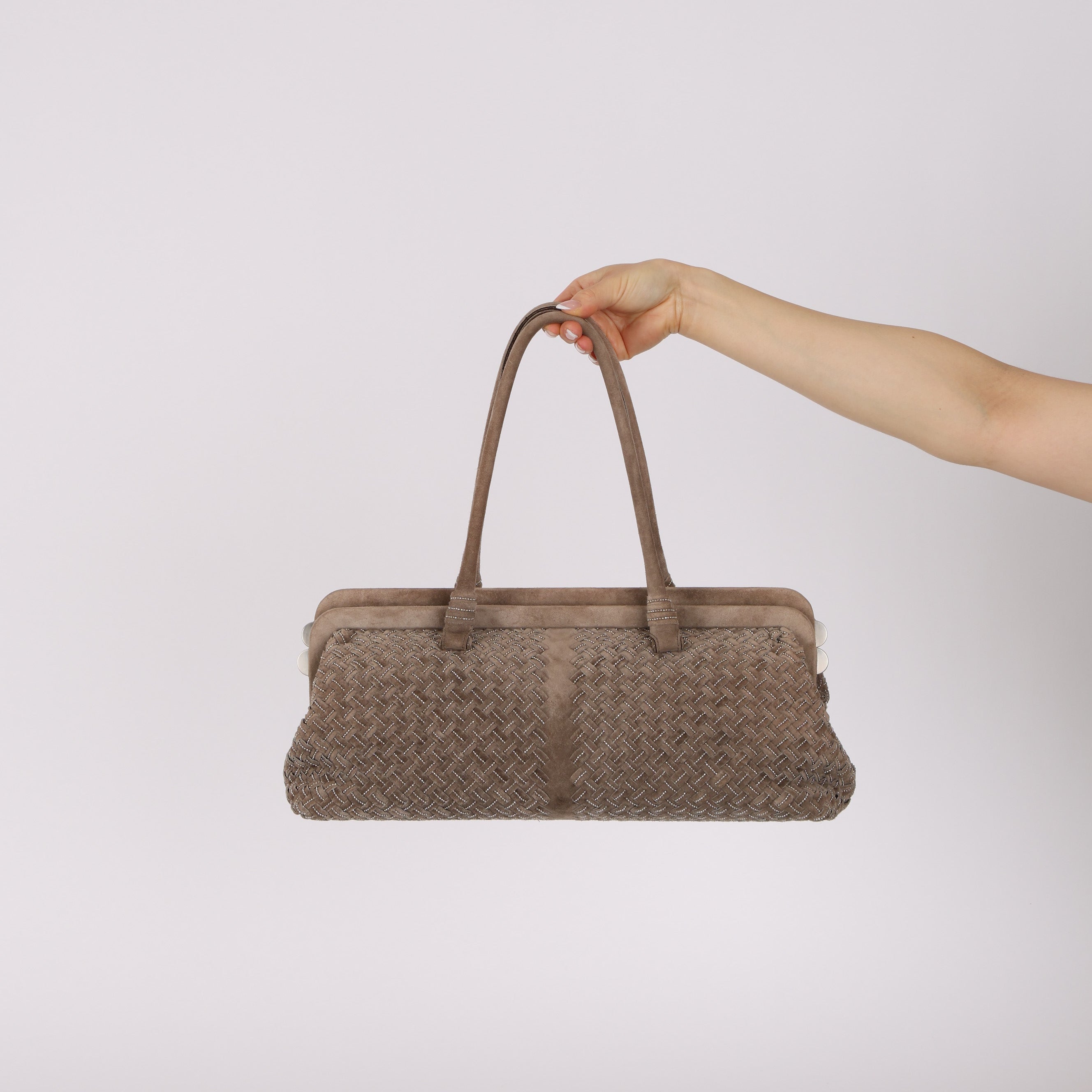 Bottega Veneta Grey Suede Beaded Intrecciato East West Frame Bag