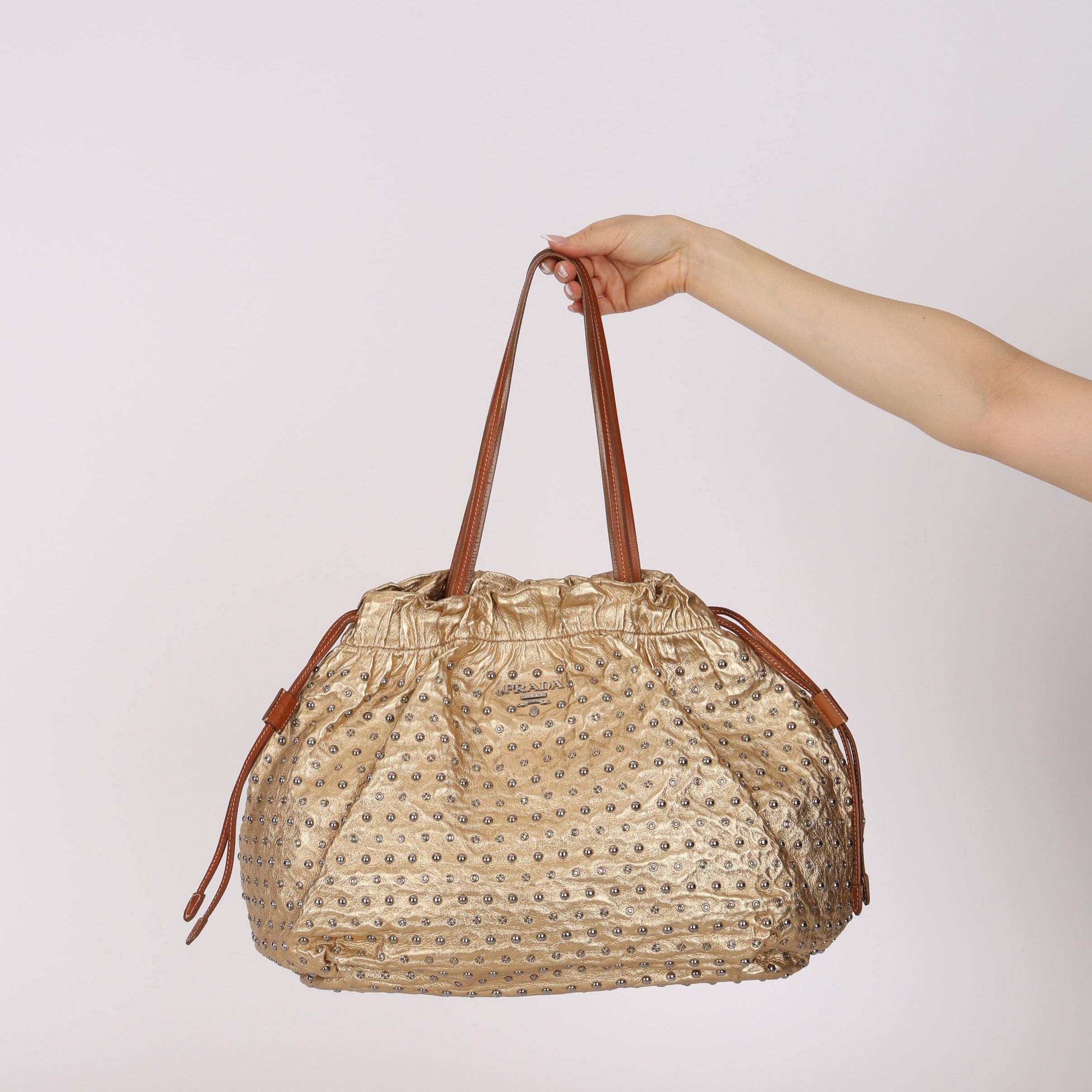 Prada Gold Metallic Calfskin Studded Drawstring Bucket Bag