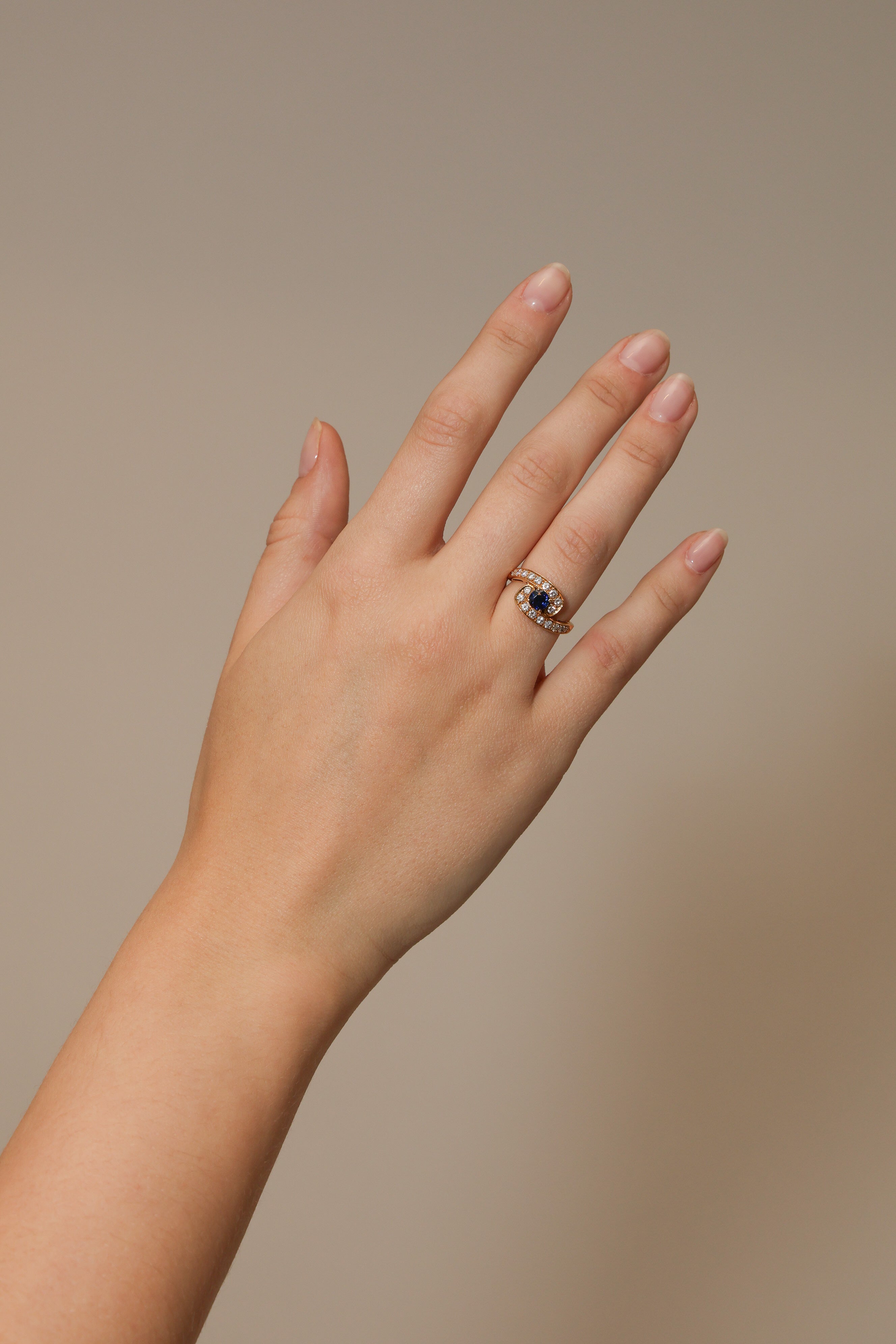 Spanning over a century of history, the house of Mouawad is an international powerhouse specializing in high jewelry and intricate craftsmanship. Showcased beautifully within this bypass ring that combines two curving rows of diamonds with a shimmering sapphire center to create a piece of fine jewelry storytelling.