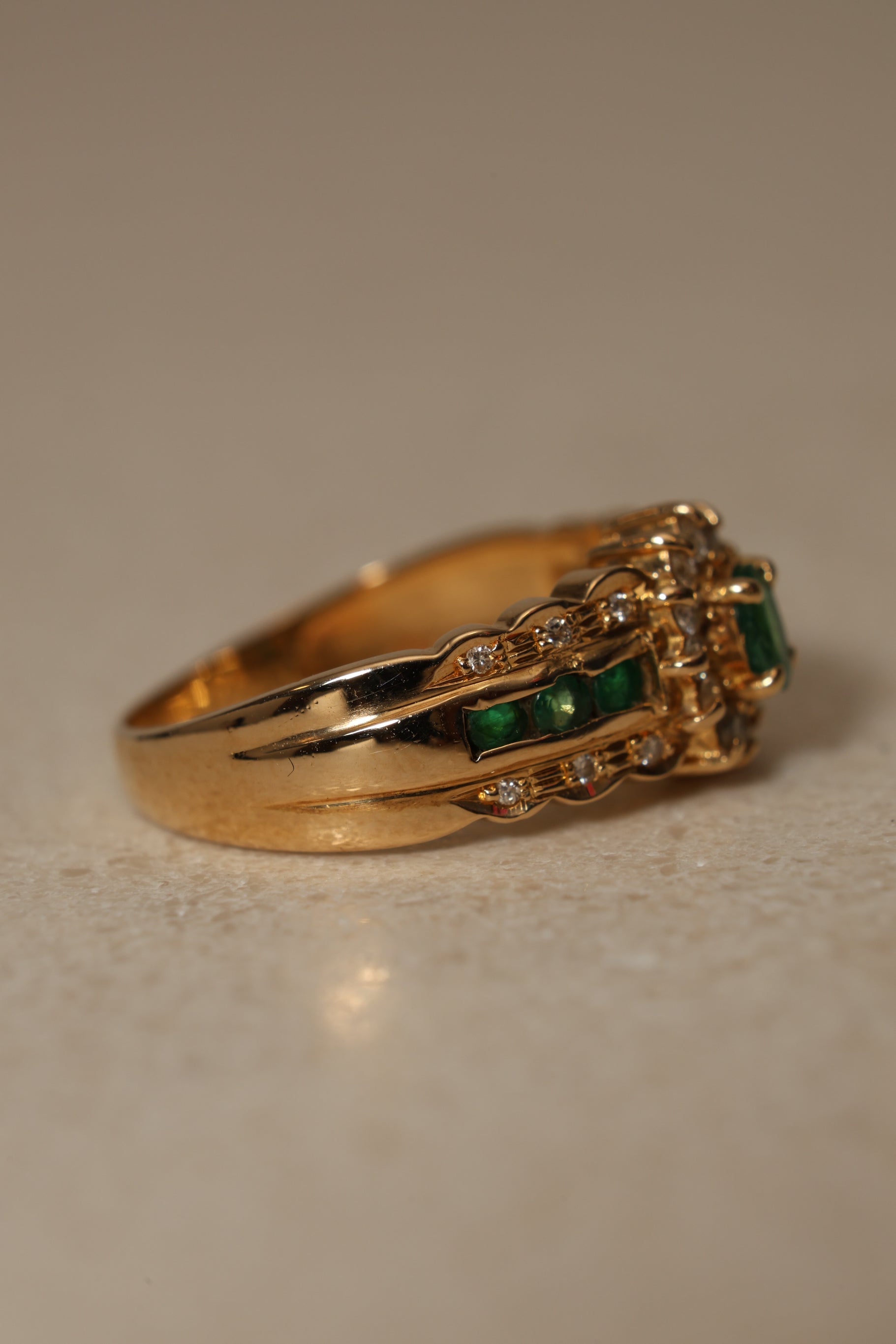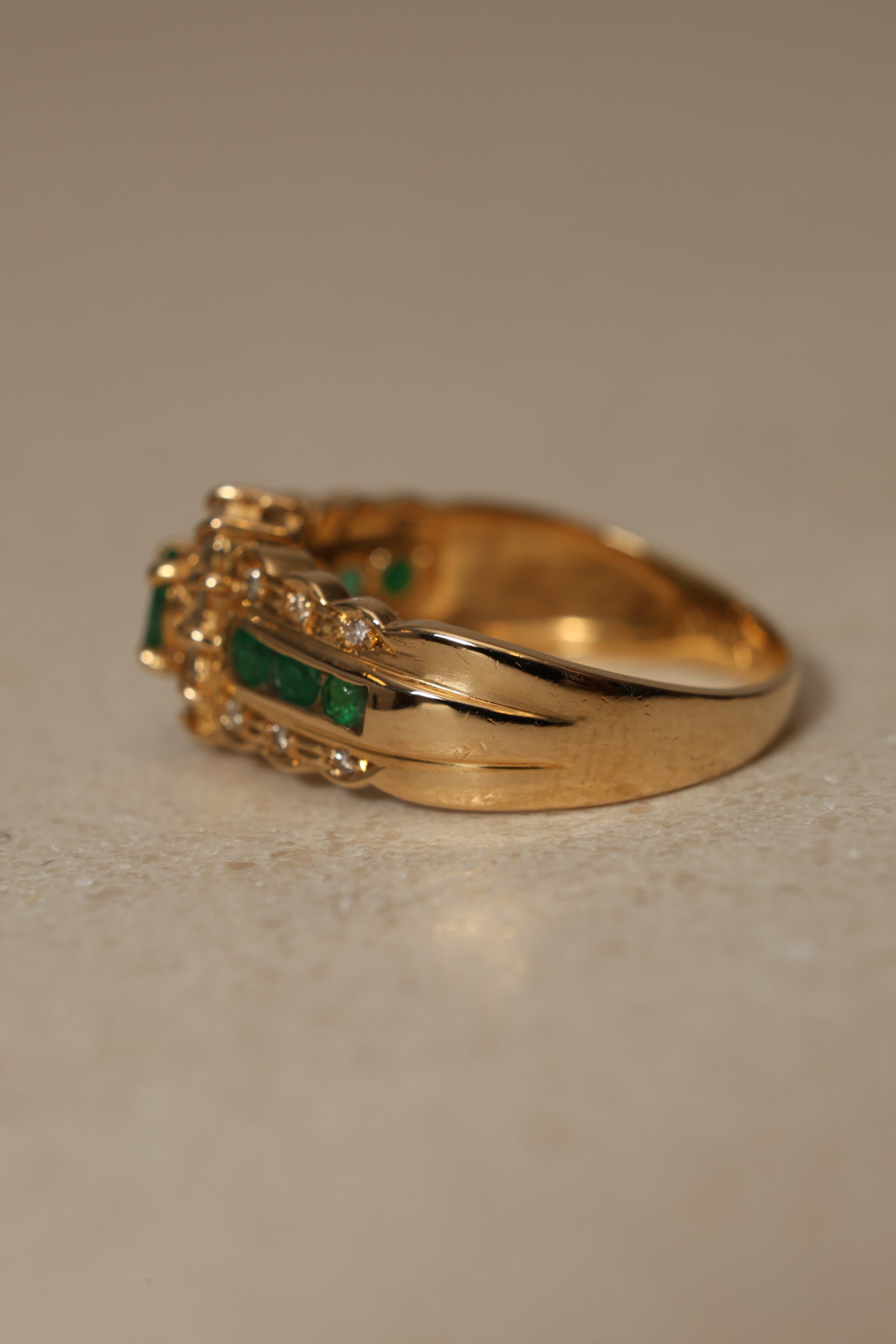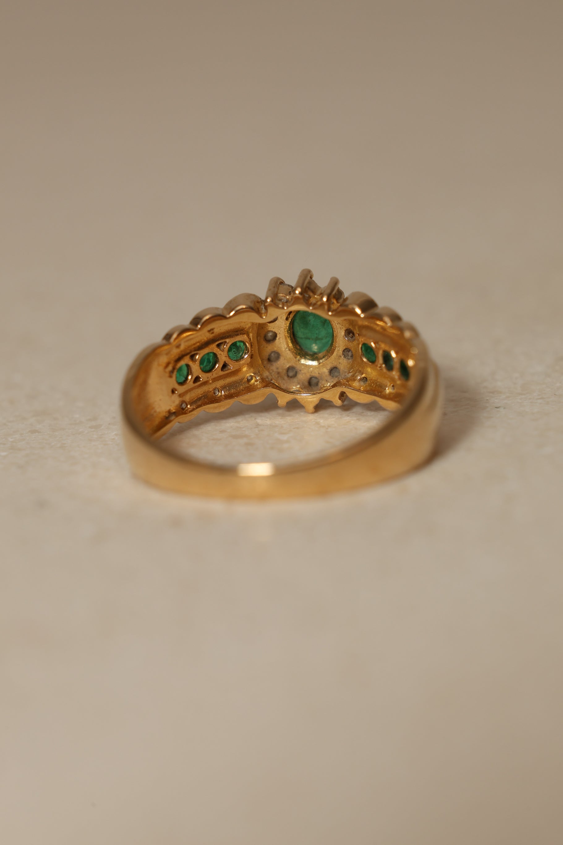 Defined by its regal presence, this 18K yellow gold halo ring centers on a striking emerald framed by a deliberate interplay of seven emeralds and twenty four diamonds. A poised balance of richness and brilliance, designed to make a statement.