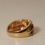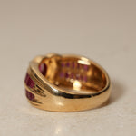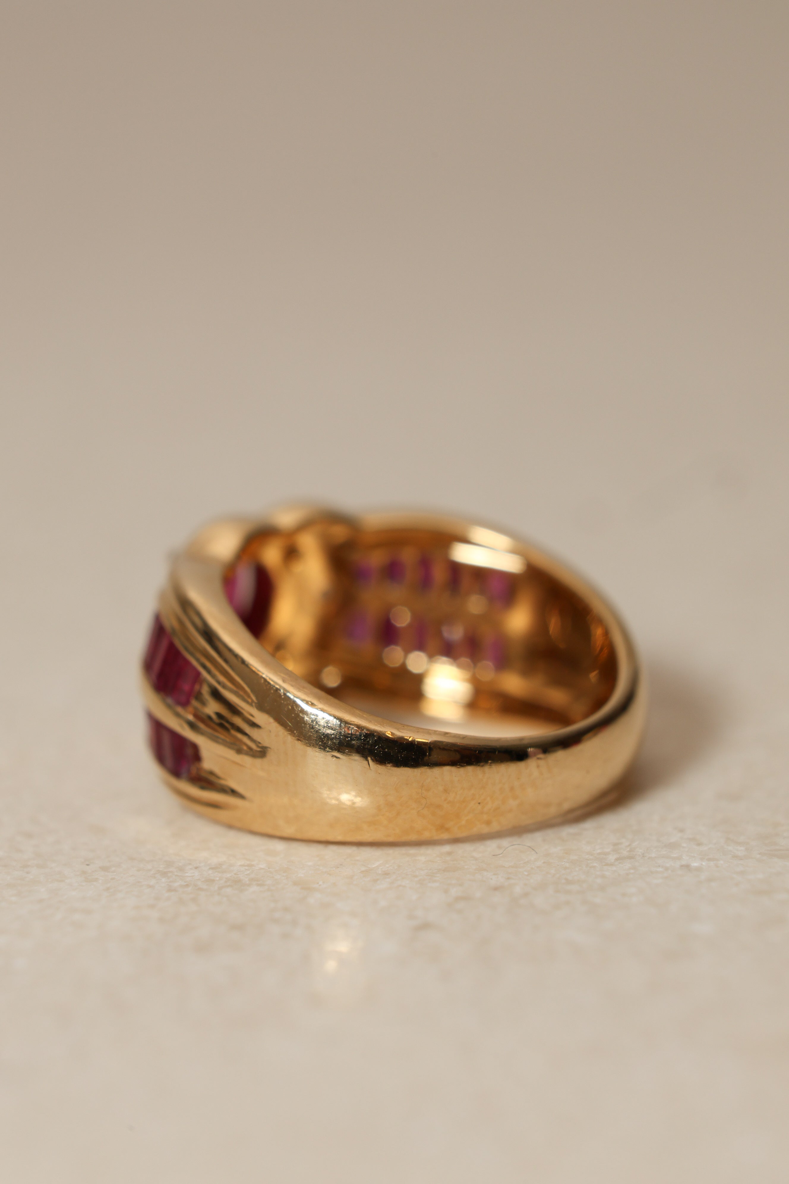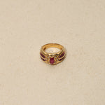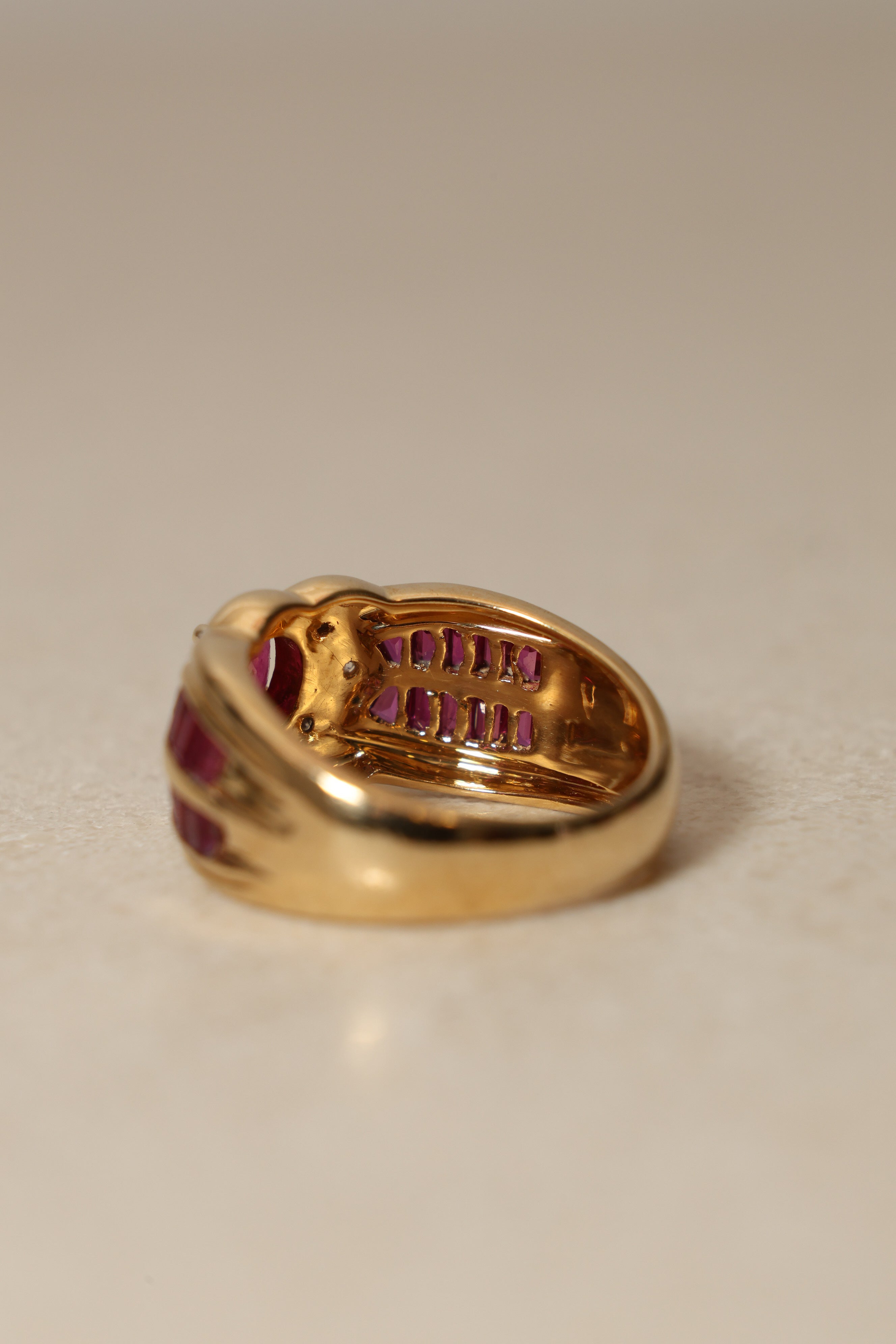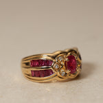 Like a jewel lifted from the silver screen, this striking fine jewelry ring centers on a vivid oval ruby, framed by brilliant diamonds and flanked by sleek emerald-cut rubies. Sculpted in rich gold with dimensional detailing, the design feels both dramatic and refined.