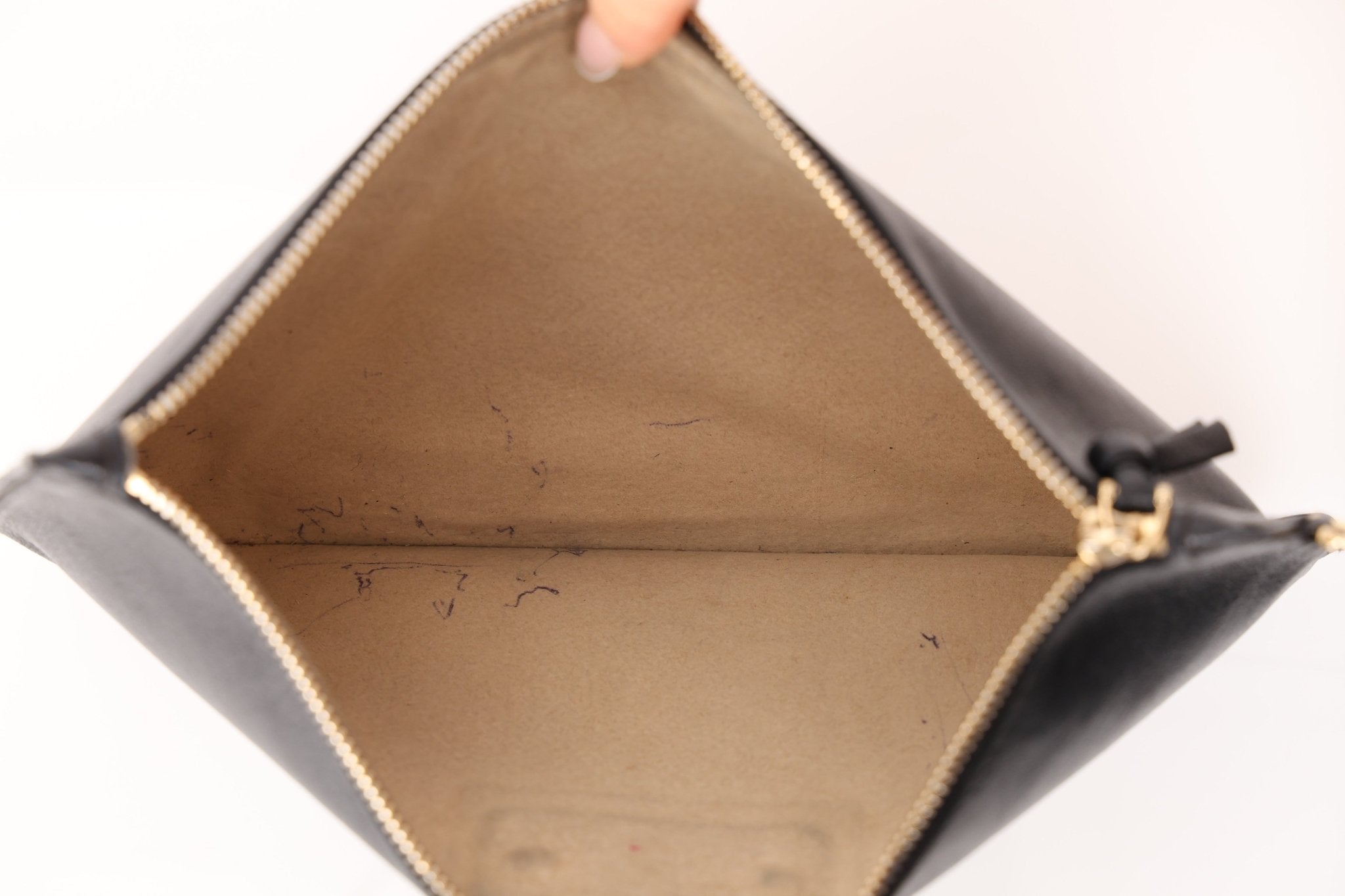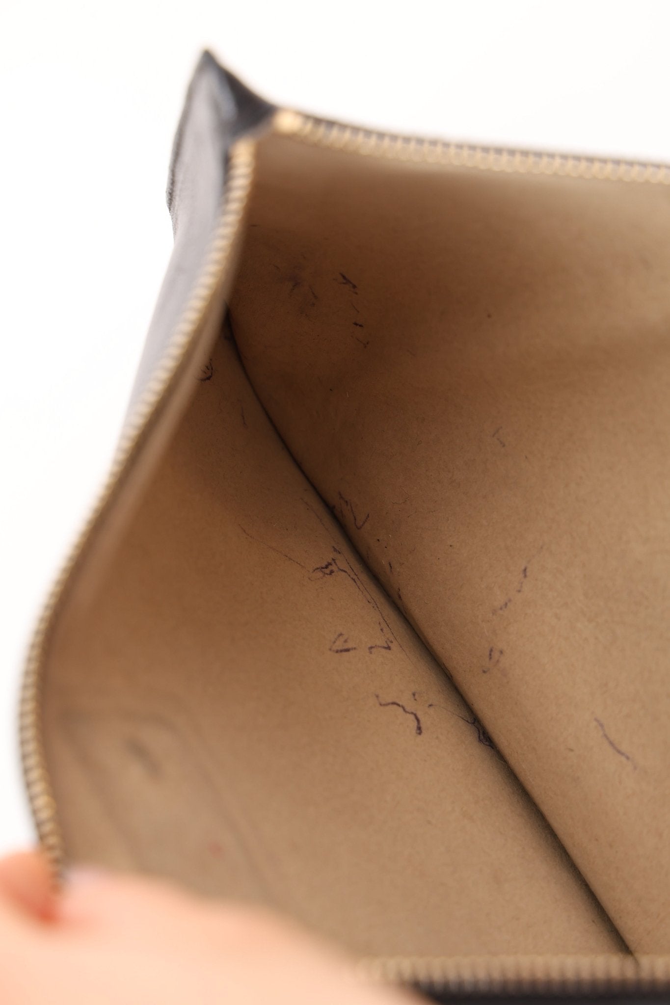 Normal wear throughout leather. Light drying on one weave. Natural wear on handles. Marks in interior pouch.