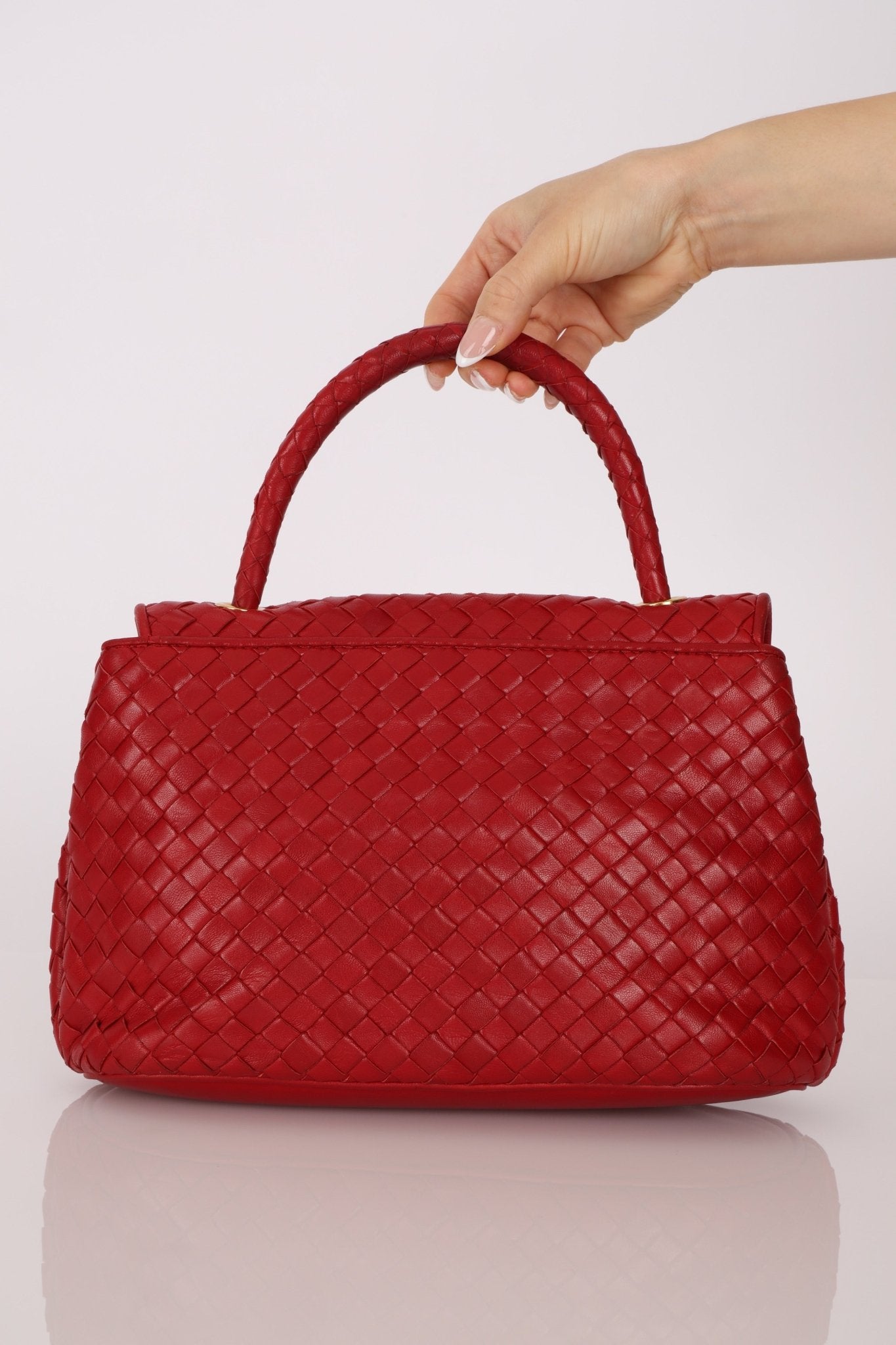 Bottega Veneta Red Intrecciato Turn - Lock Kelly Top Handle - FashioNica