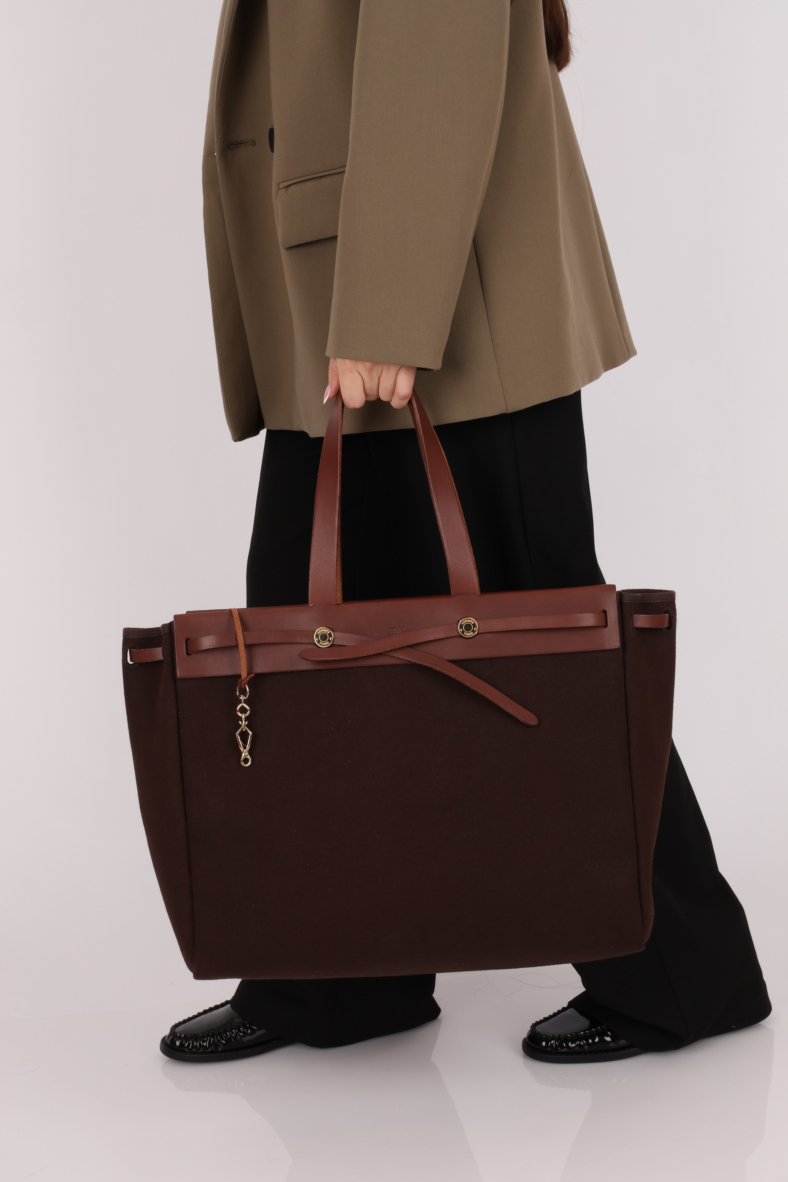 This Hermès 2002 Rouge Sellier Vache Hunter and Ebene Toile Cabas Herbag is the perfect bag for luxurious versatility! This bag serves as a 2-in-1, convertible from an east west silhouette to a tote bag, making it the perfect everyday bag!