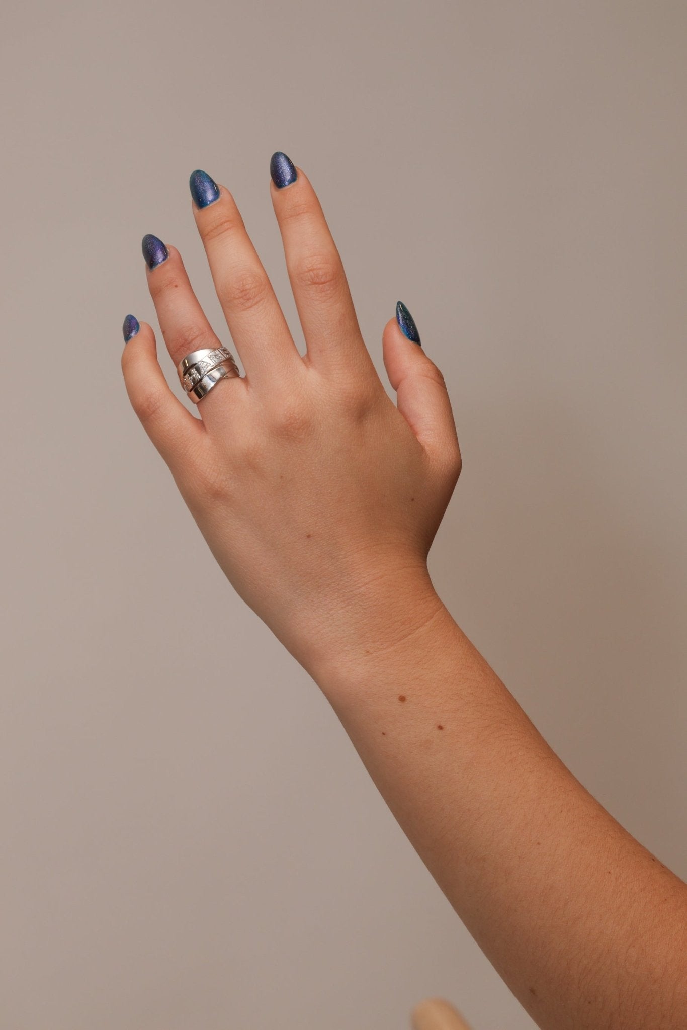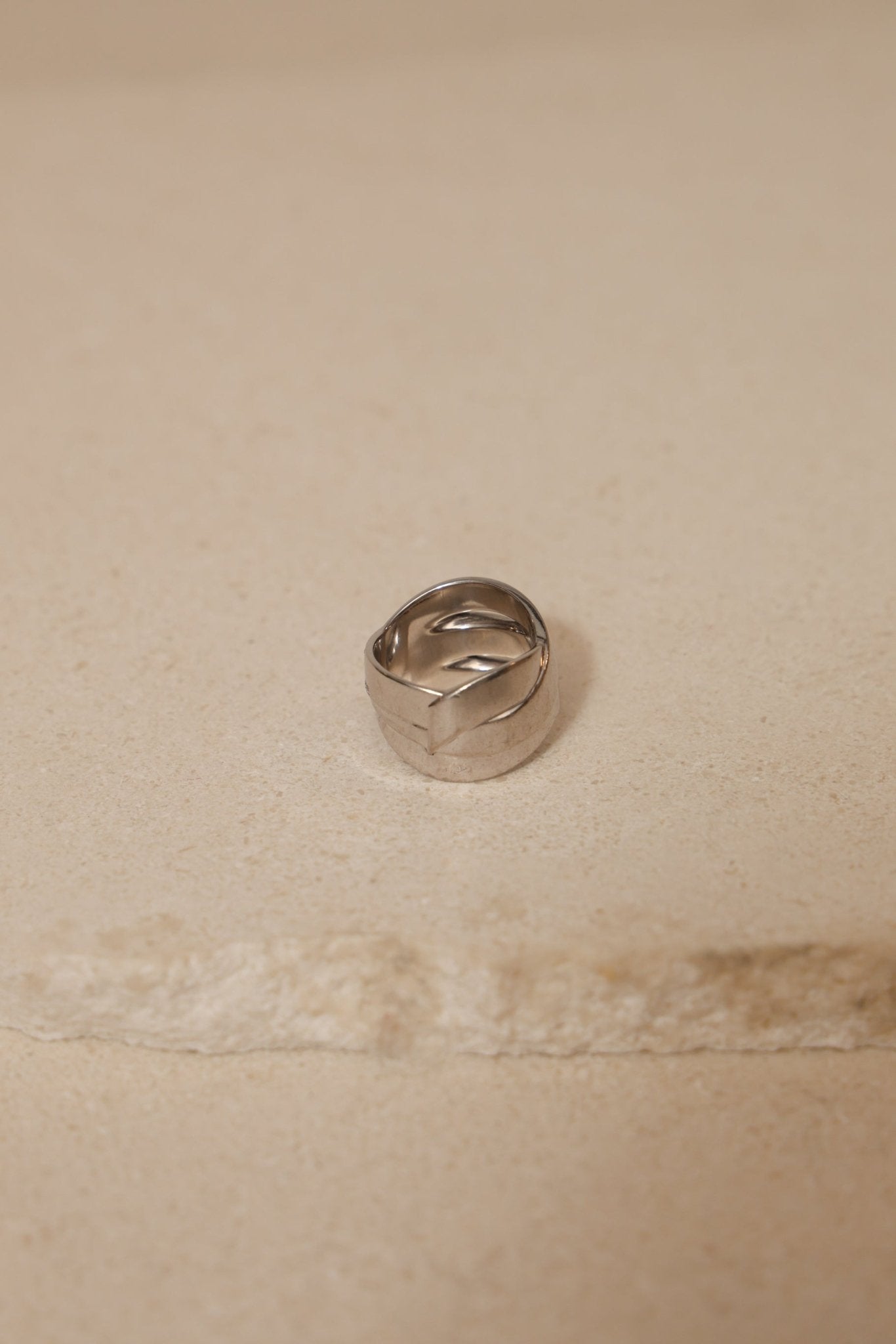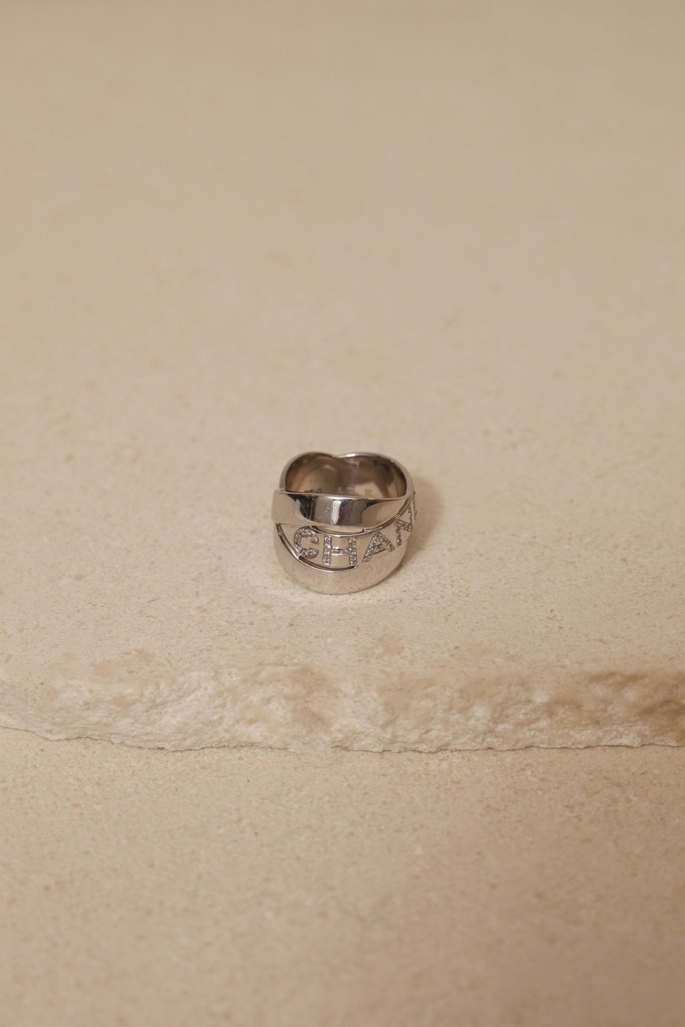 A statement ring plated in 18K white gold, the Chanel Bolduc Wavy Logo ring gives off the illusion of multiple stacked rings, all centered on the luxurious diamond-lined Chanel logo.