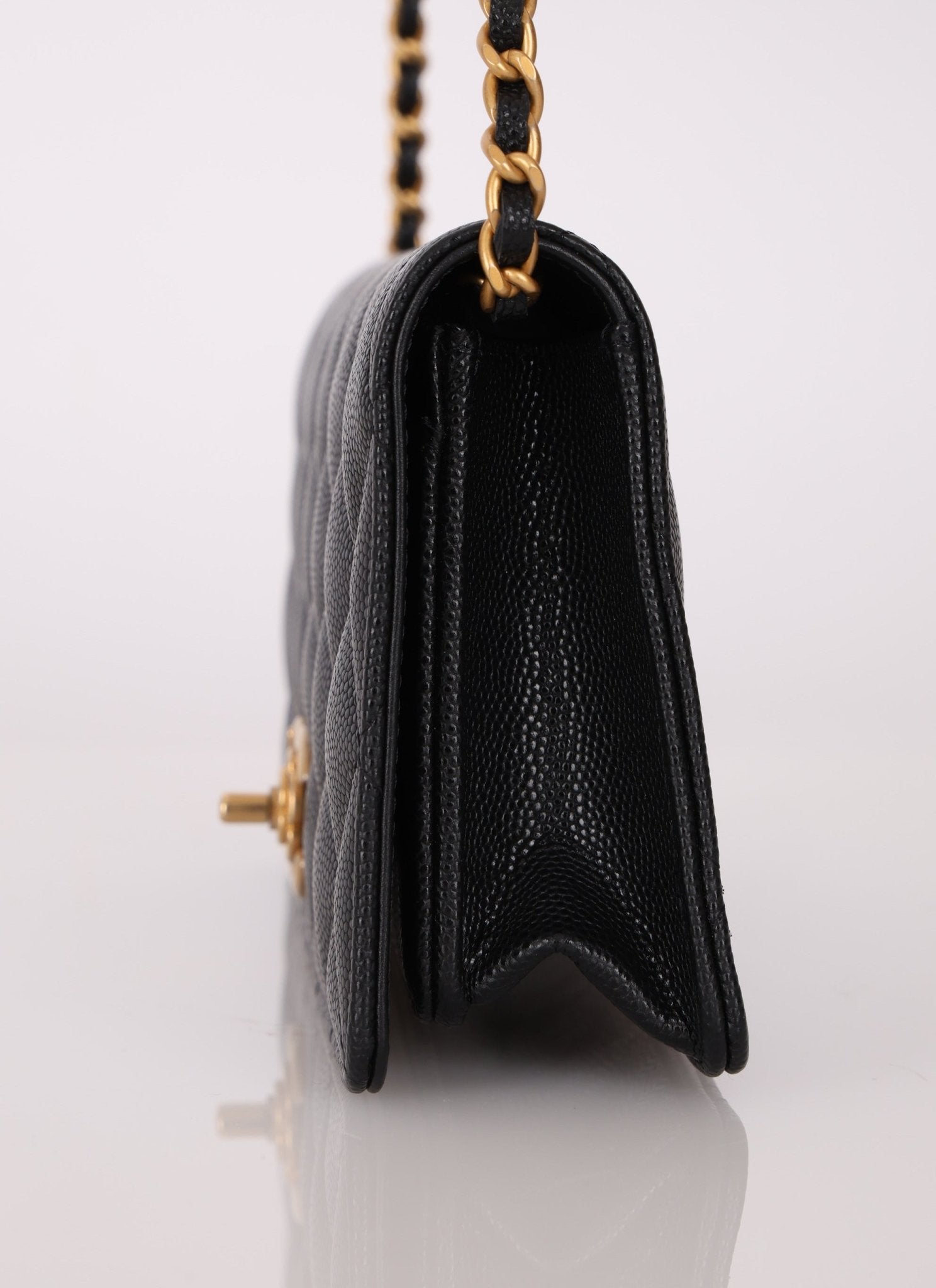 The Chanel Camellia Flap Bag in durable caviar leather offers a chic alternative to the beloved WOC, featuring a sleek east-west silhouette that transitions seamlessly from shoulder bag to evening clutch.