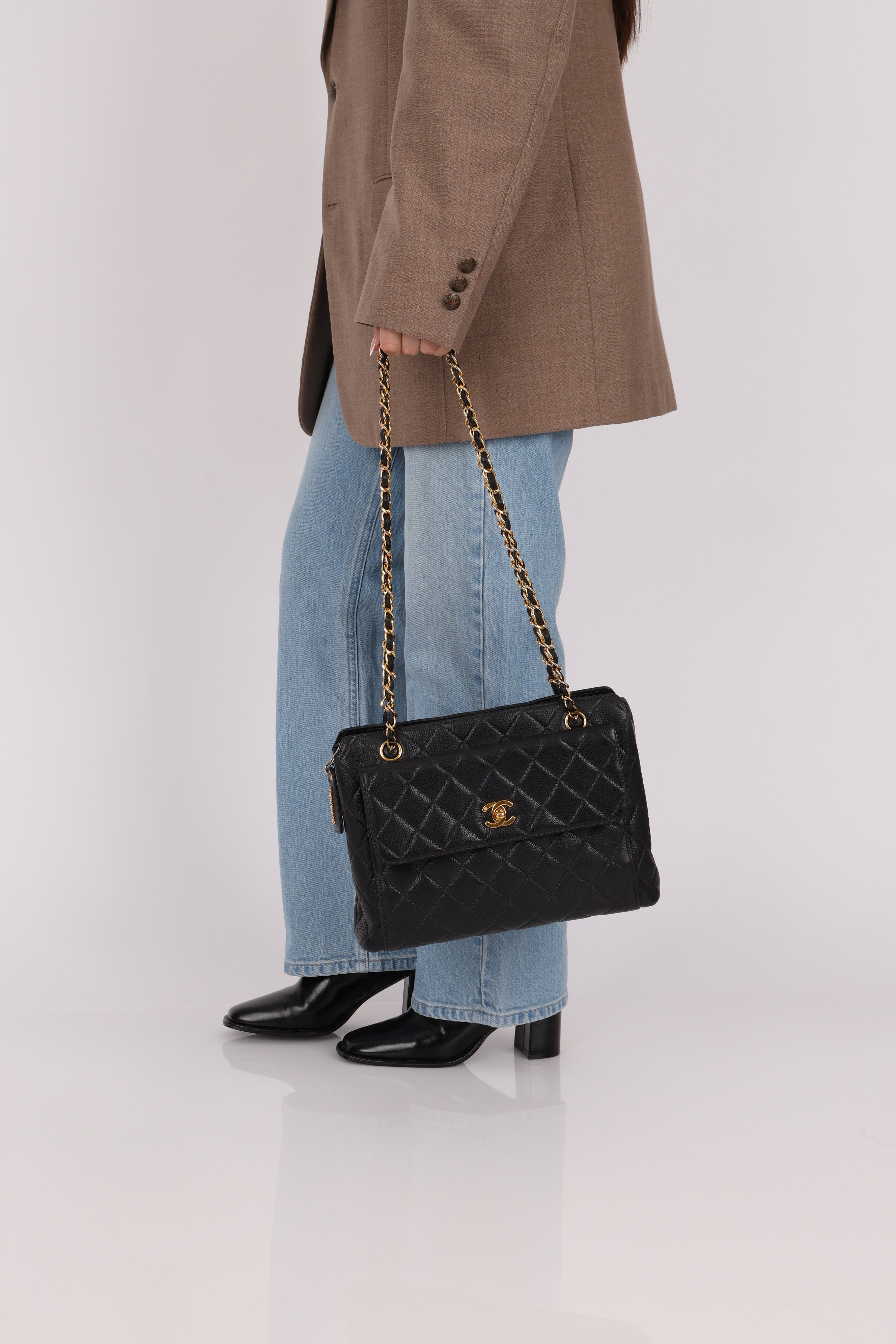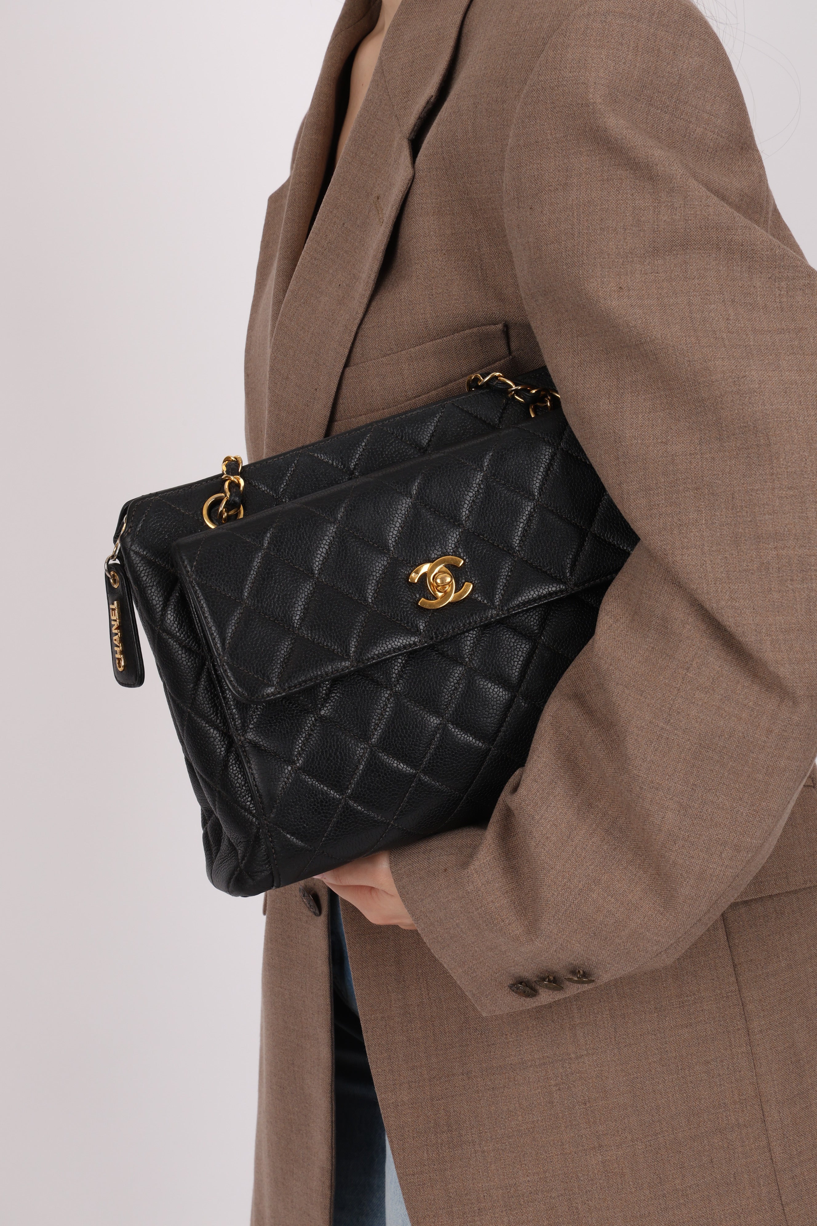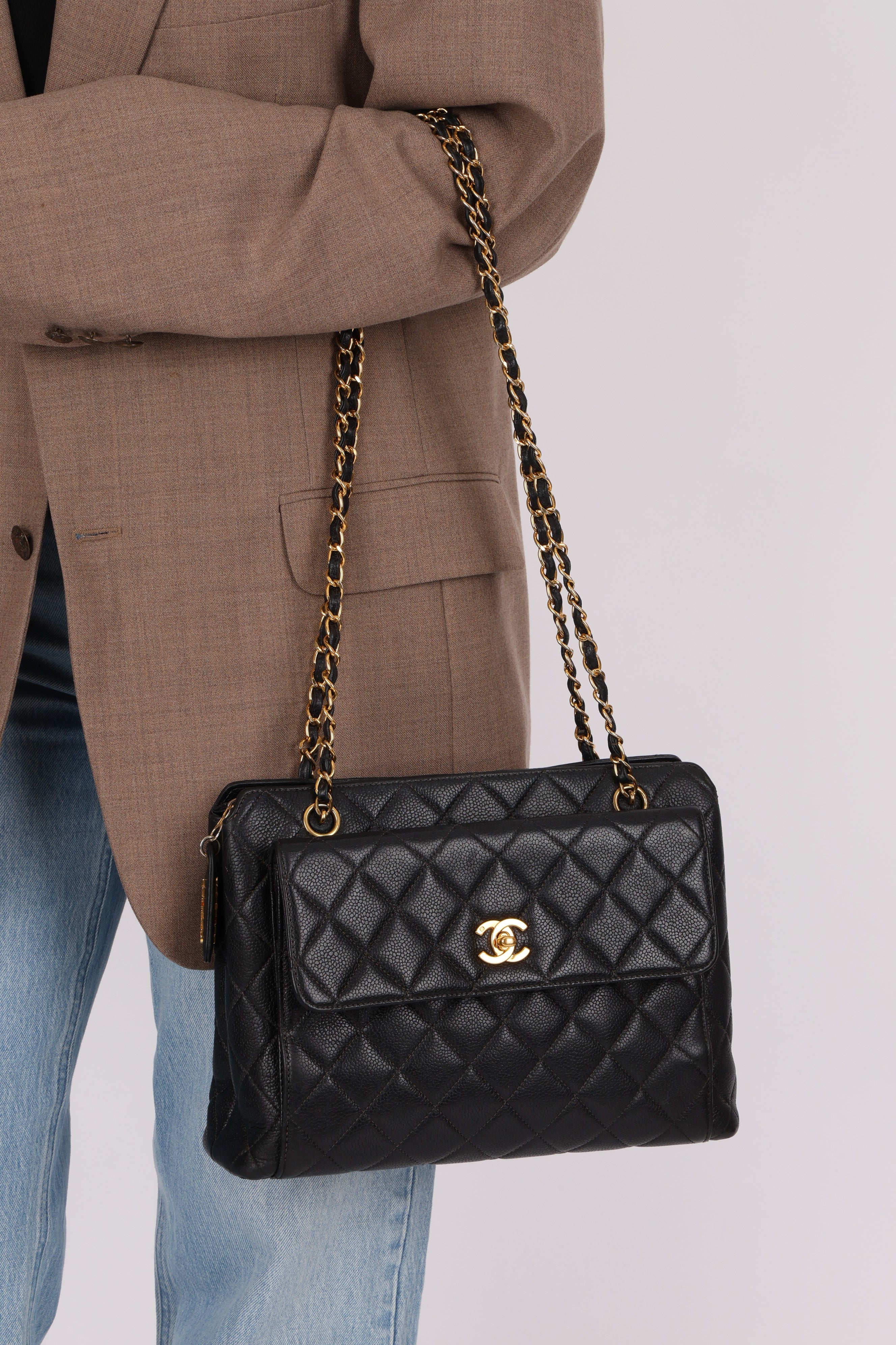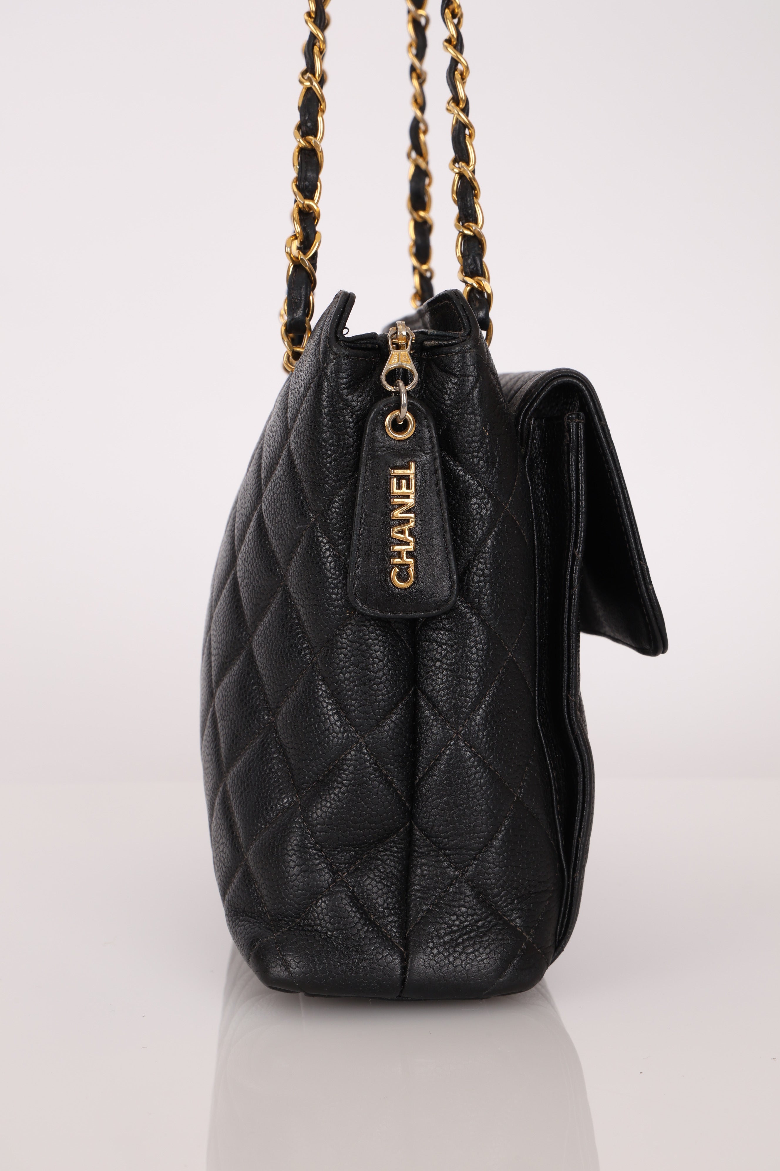 Chanel 1996 Caviar Turnlock Pocket Zip Chain Tote 24K GP