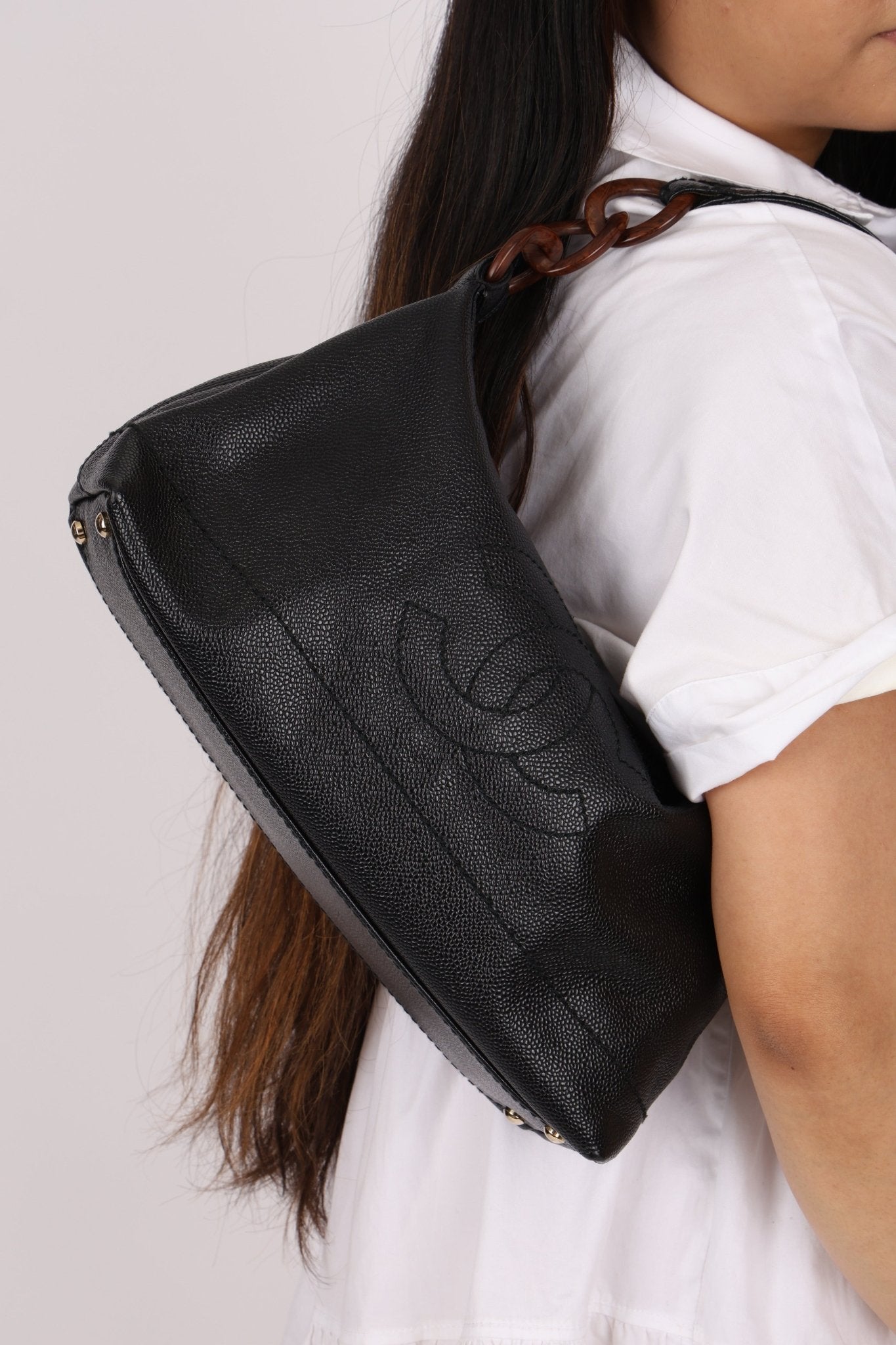 Chanel 2002 Caviar Acrylic Wood Chain Shoulder Bag - FashioNica
