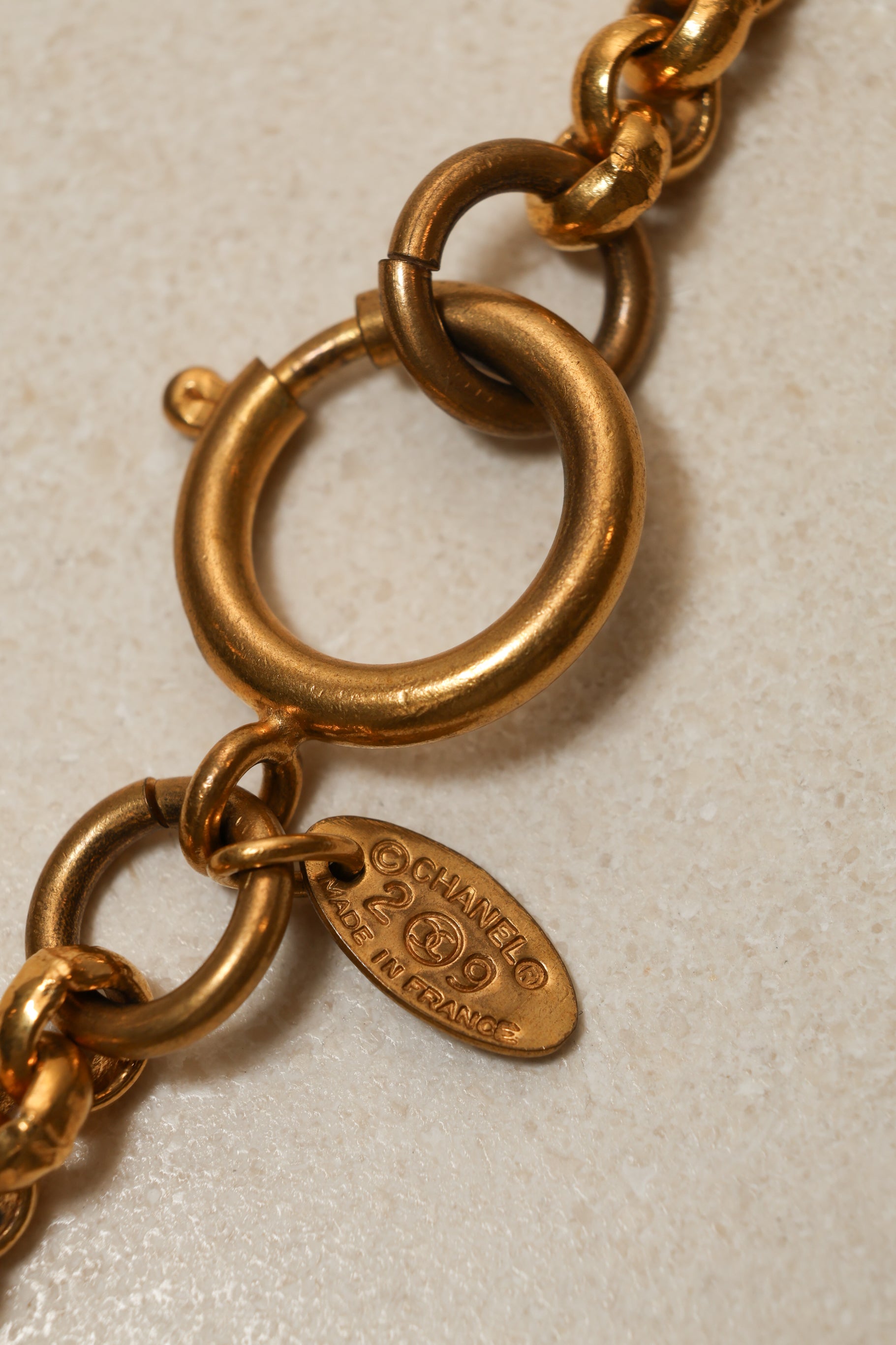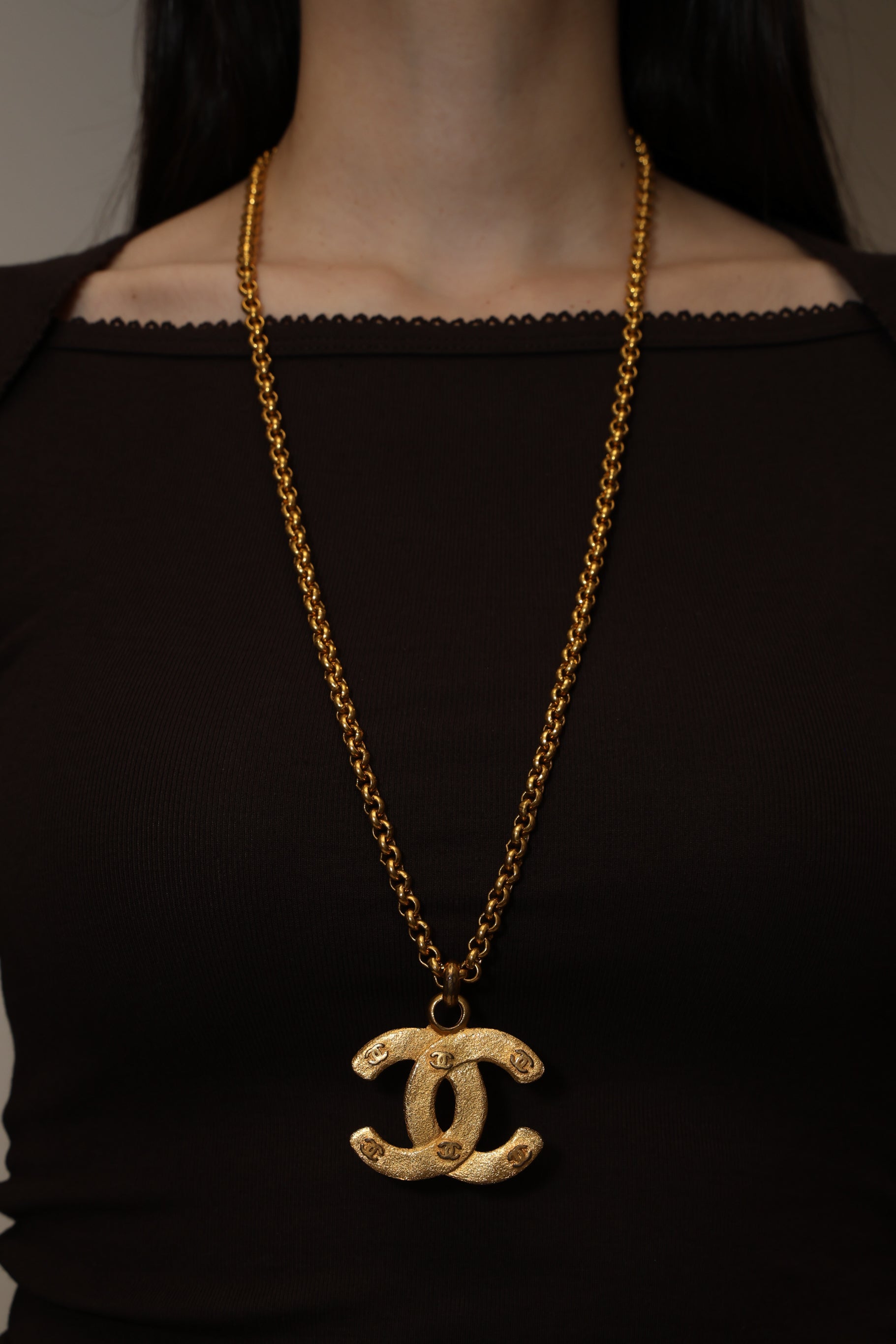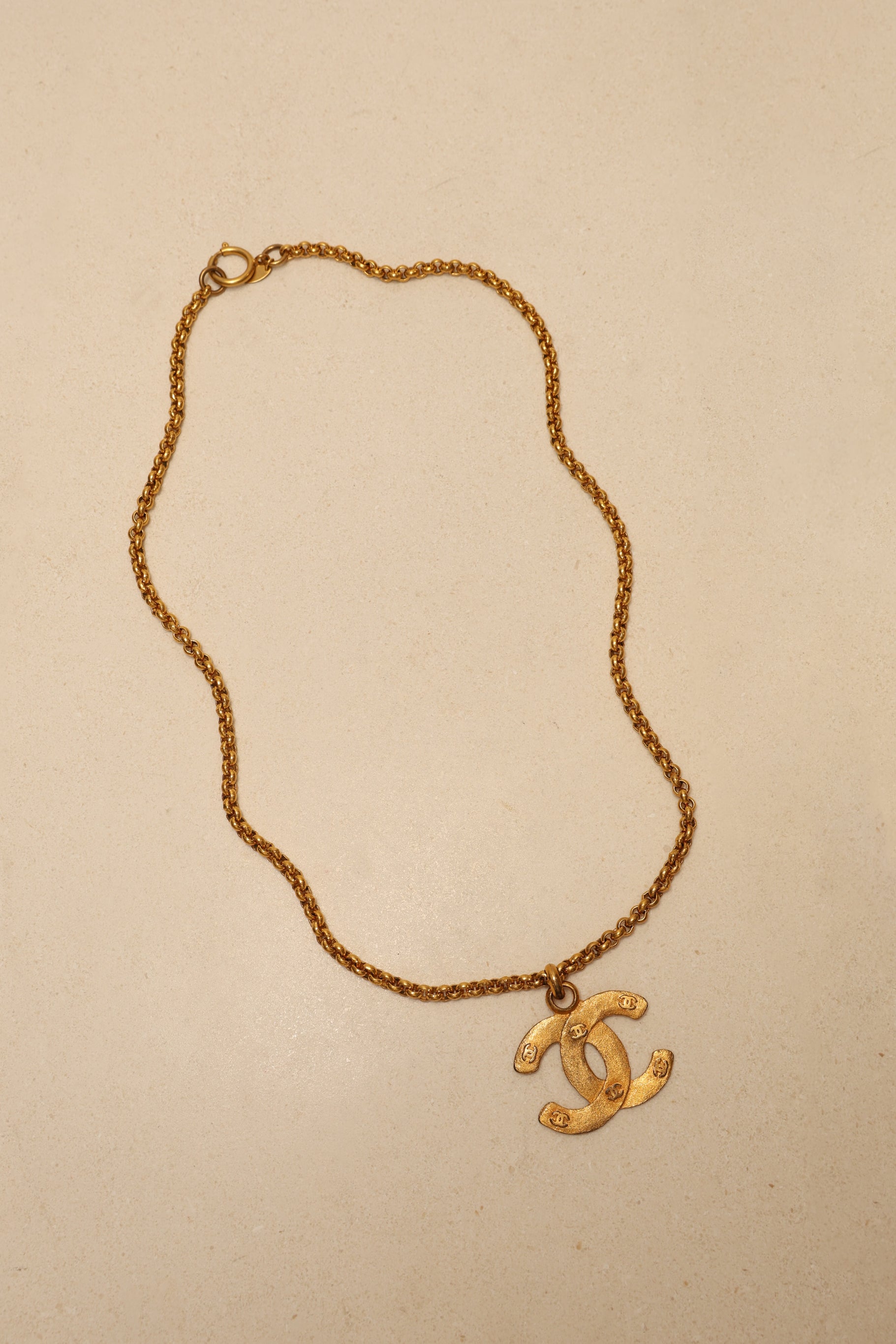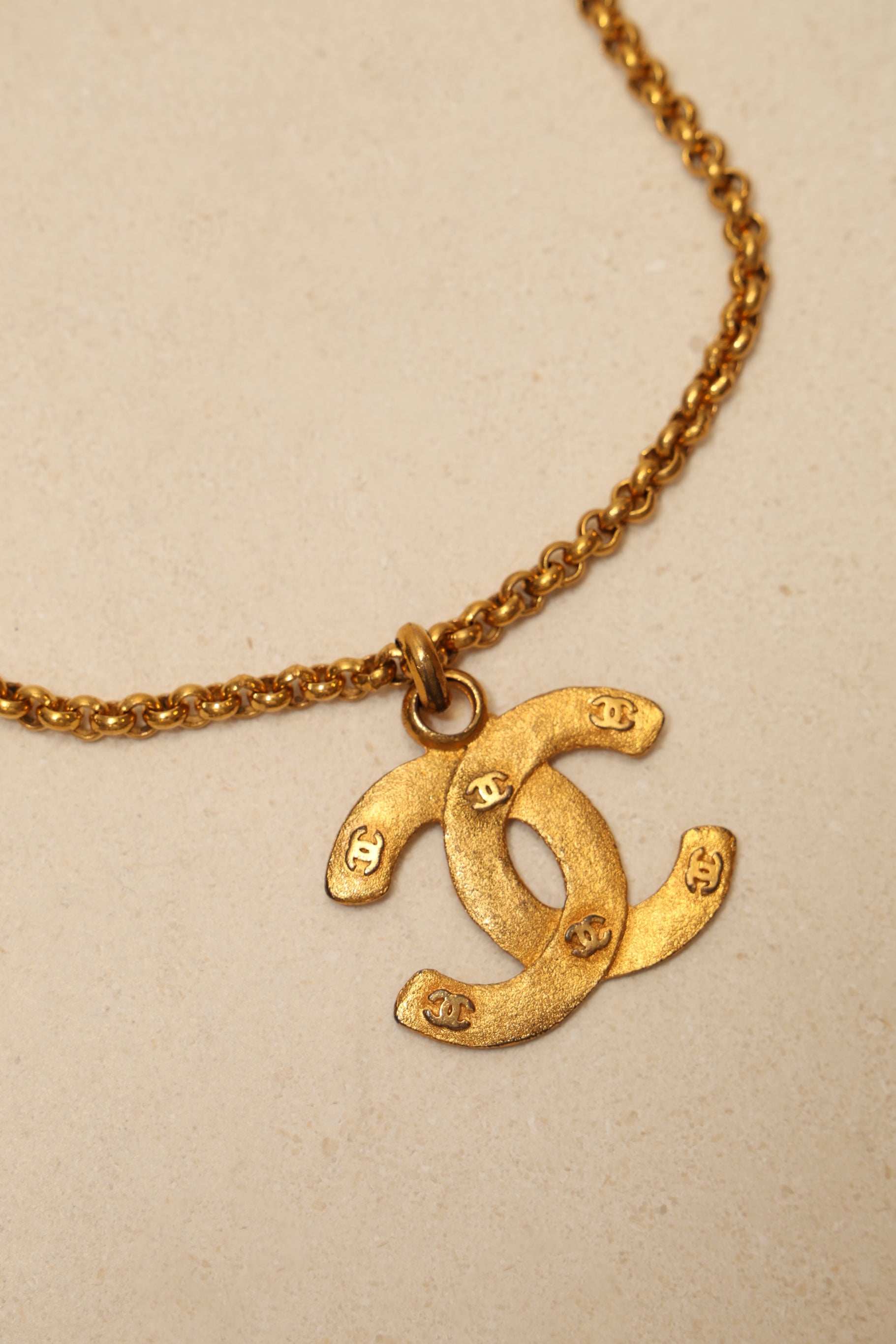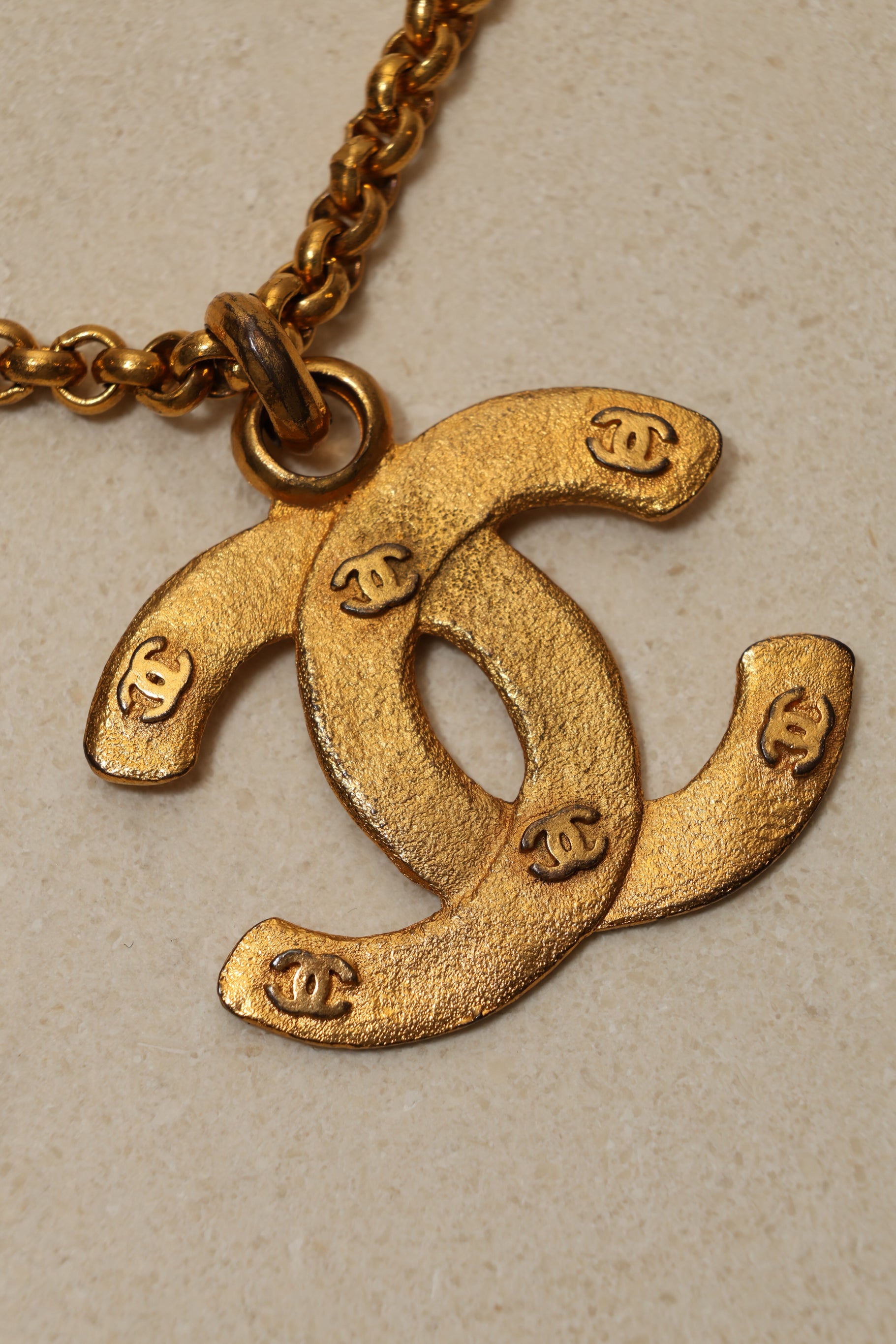 This aged gold plated chain features a unique motif from Chanel. In addition to the classic CC pendant, this edition includes miniature CCs throughout the pendants surface for added dimension.