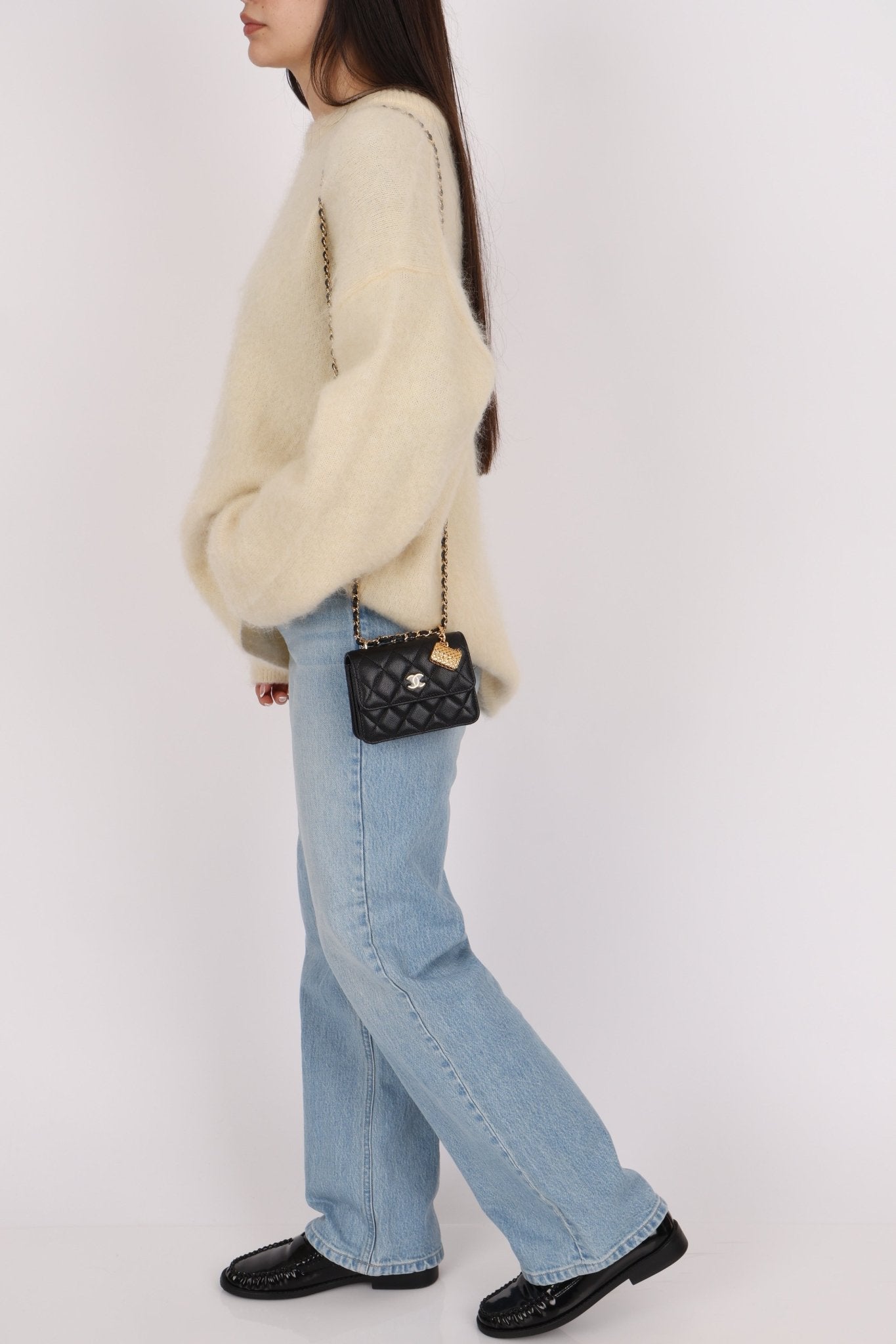 A built-in bag charm? Say no more. The wallet on chain in classic caviar leather is decorated with a classic flap charm on the chain itself, portraying the iconic bag style.