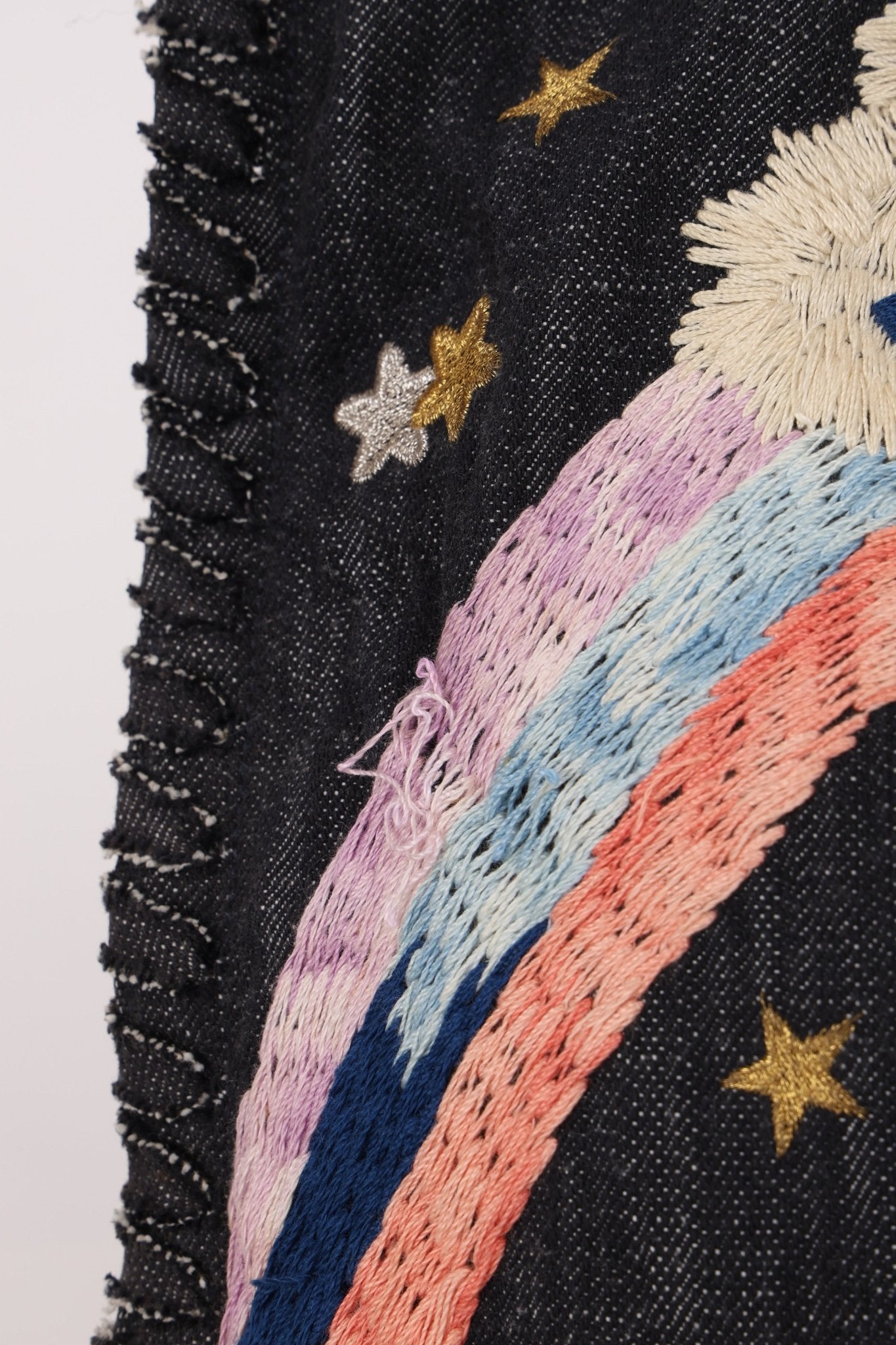 Normal wear throughout denim. Minor loose stitching on rainbow design.