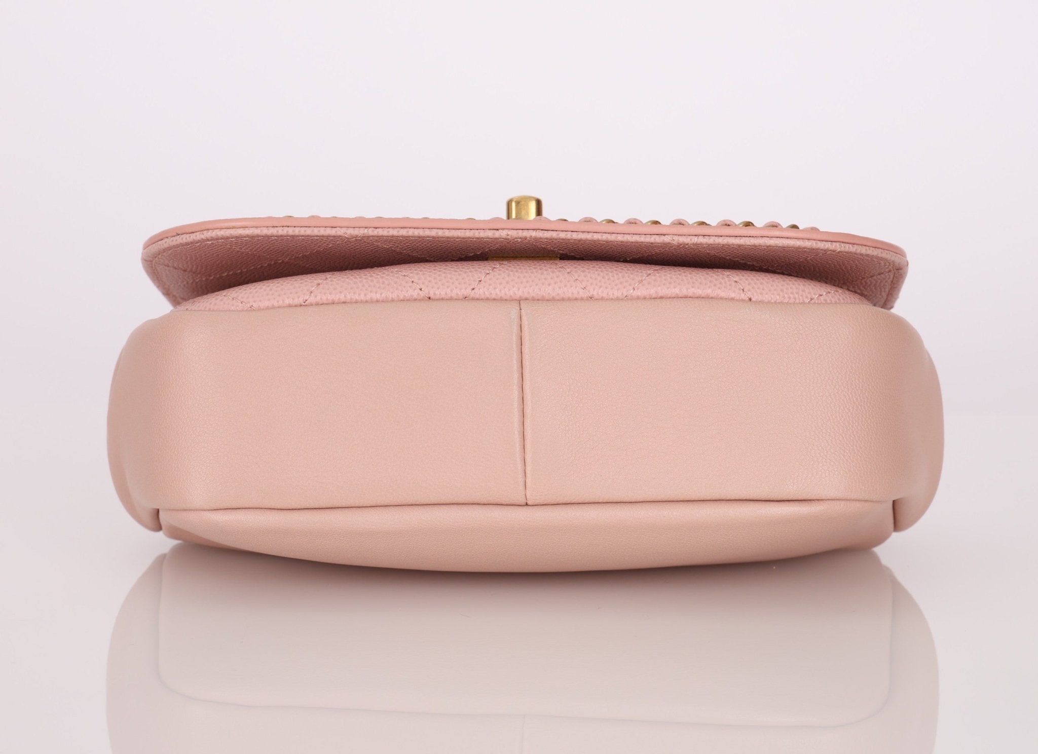 This bag is a dream come true with its soft elegant pink hue, paired with the stunning textured trim!