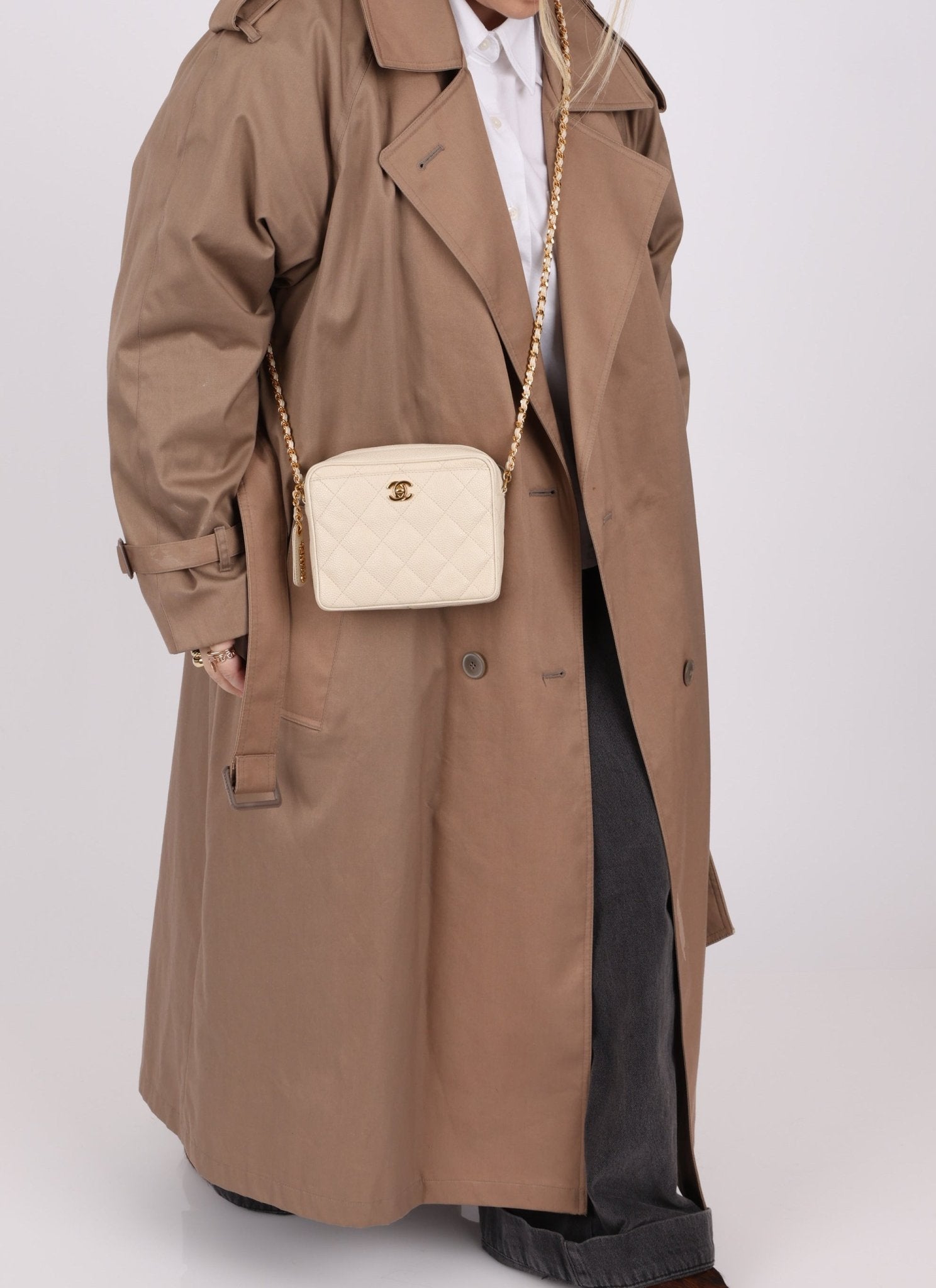 Chanel 1996 Ivory Caviar Mini Square Turnlock Camera Bag - FashioNica