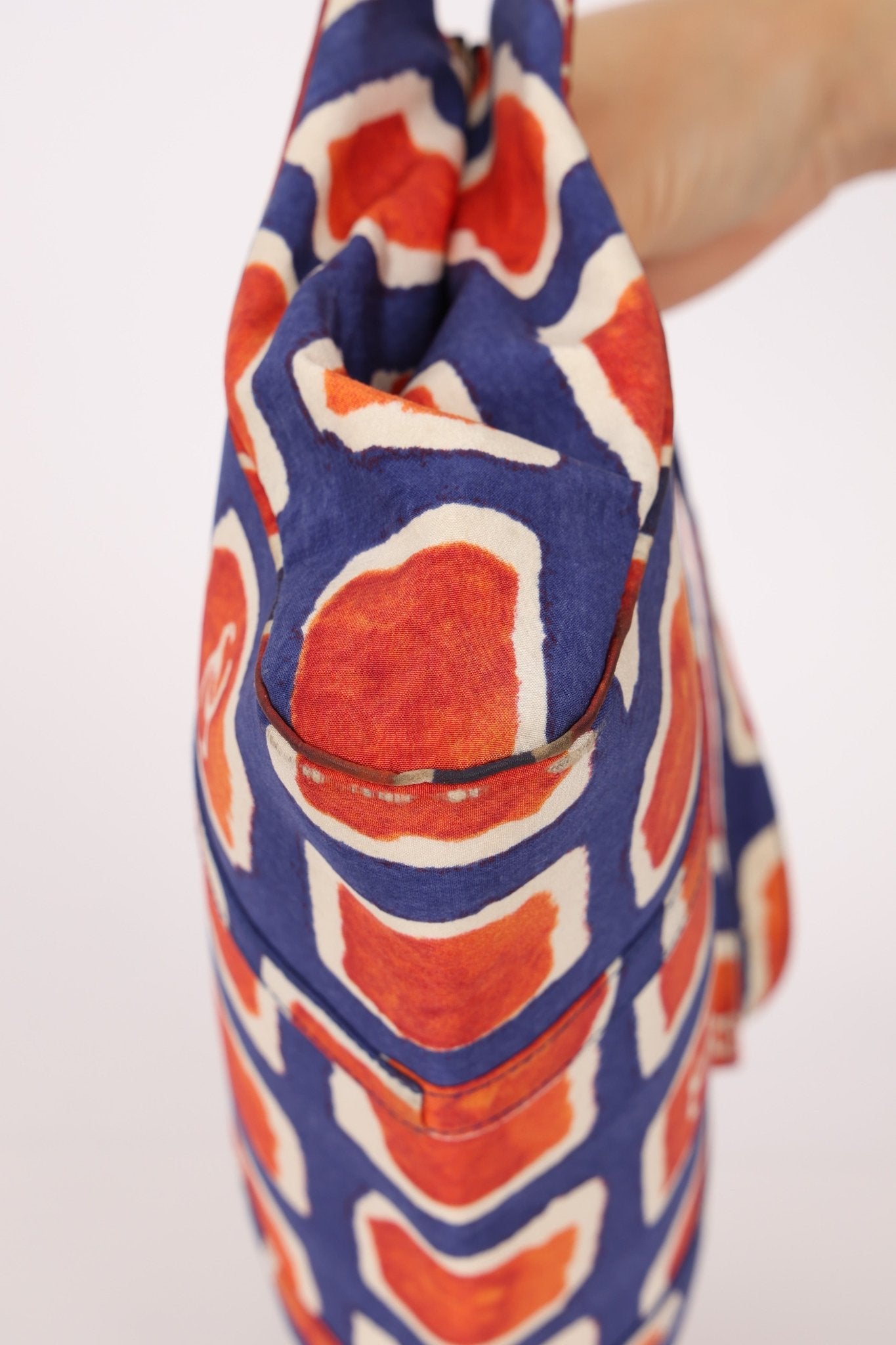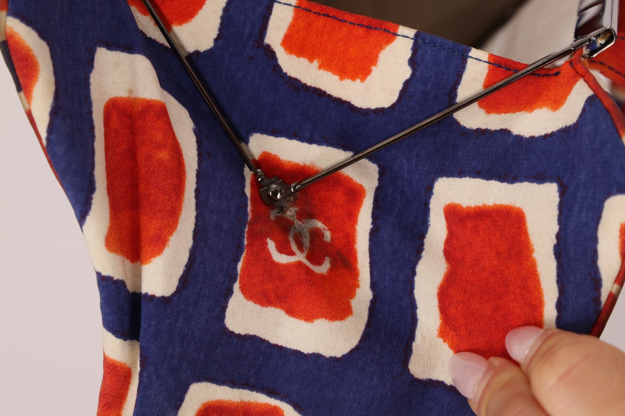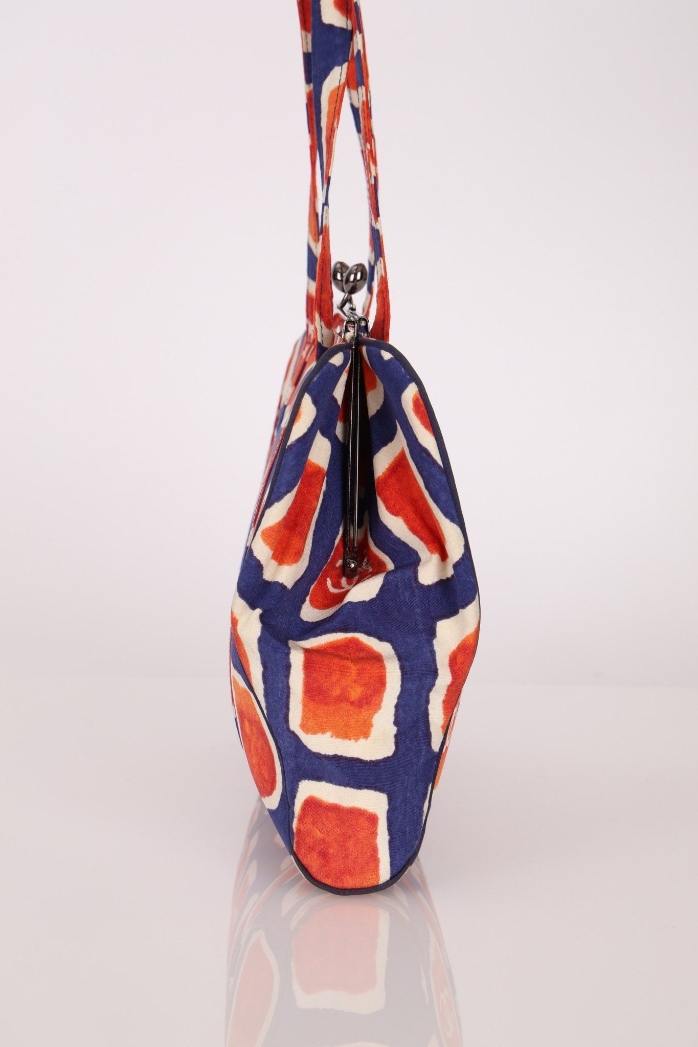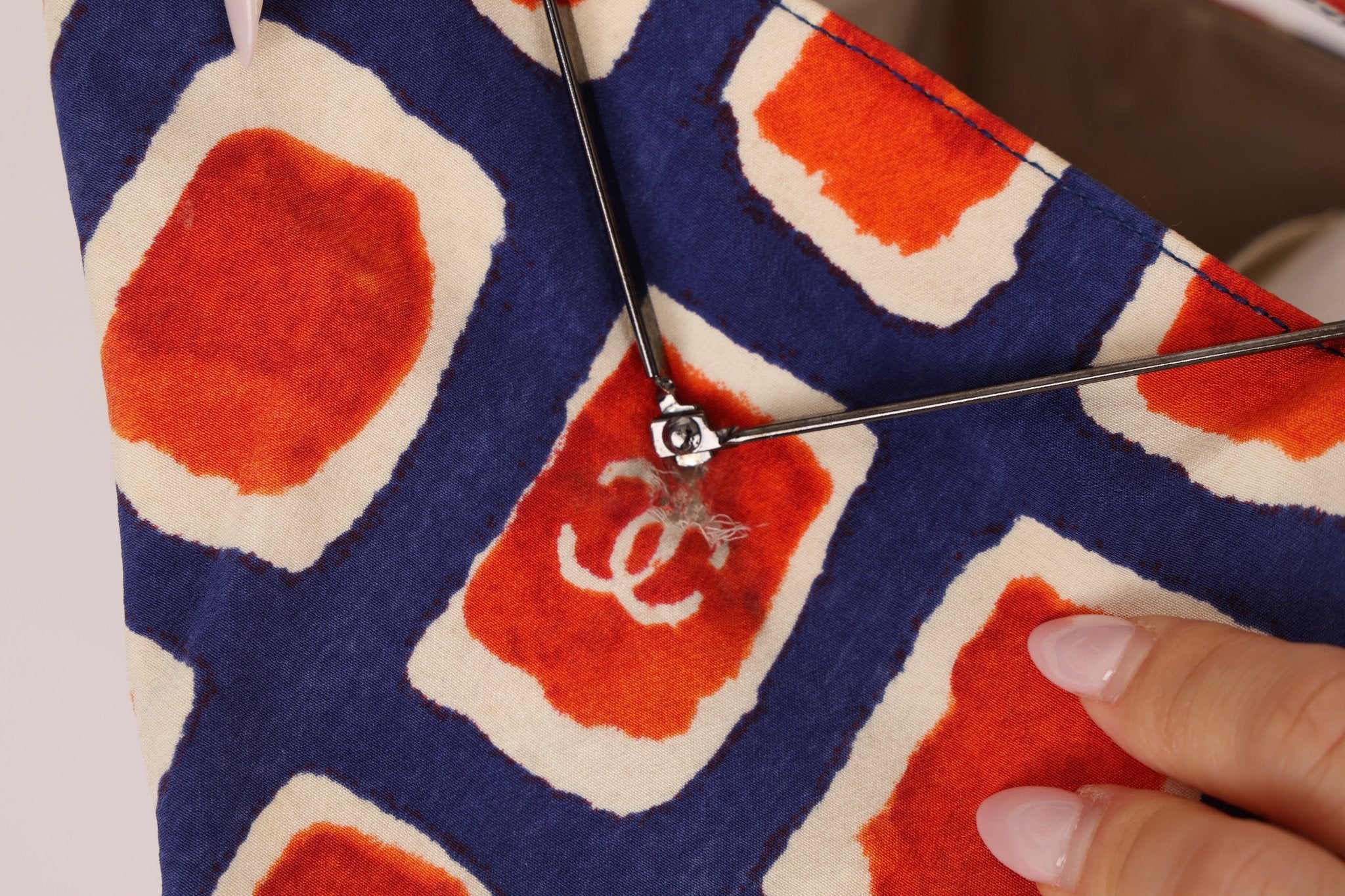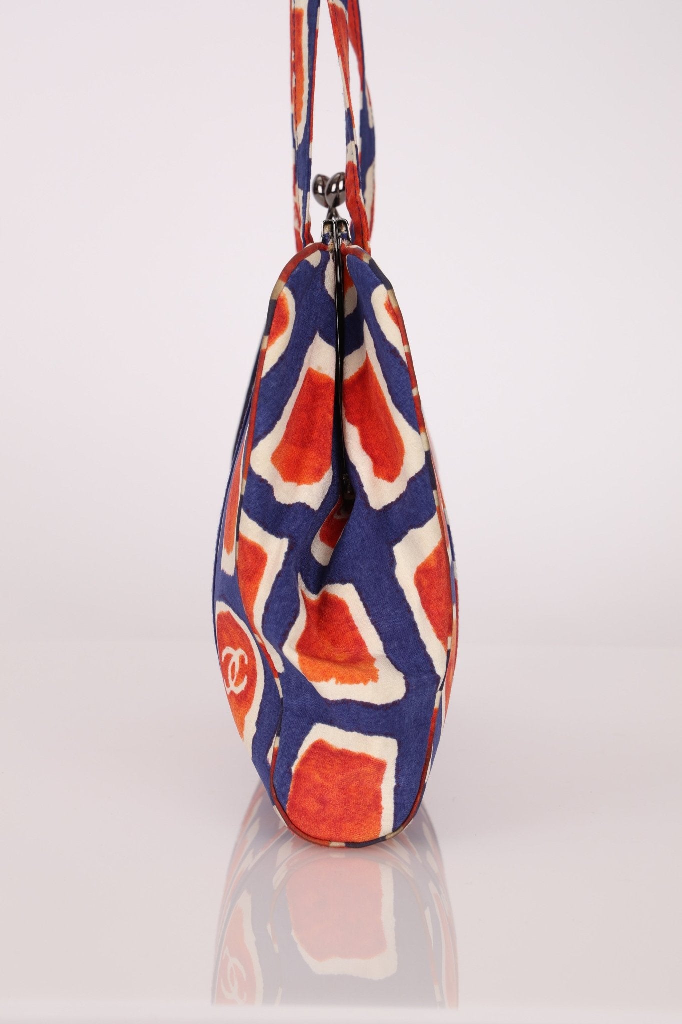 A rare departure from Chanel’s classic black-and-gold, this vibrant kisslock tote features a playful red and blue geometric print with a retro-inspired frame closure. Eye-catching and collectible, it’s a bold statement piece with unmistakable vintage charm.