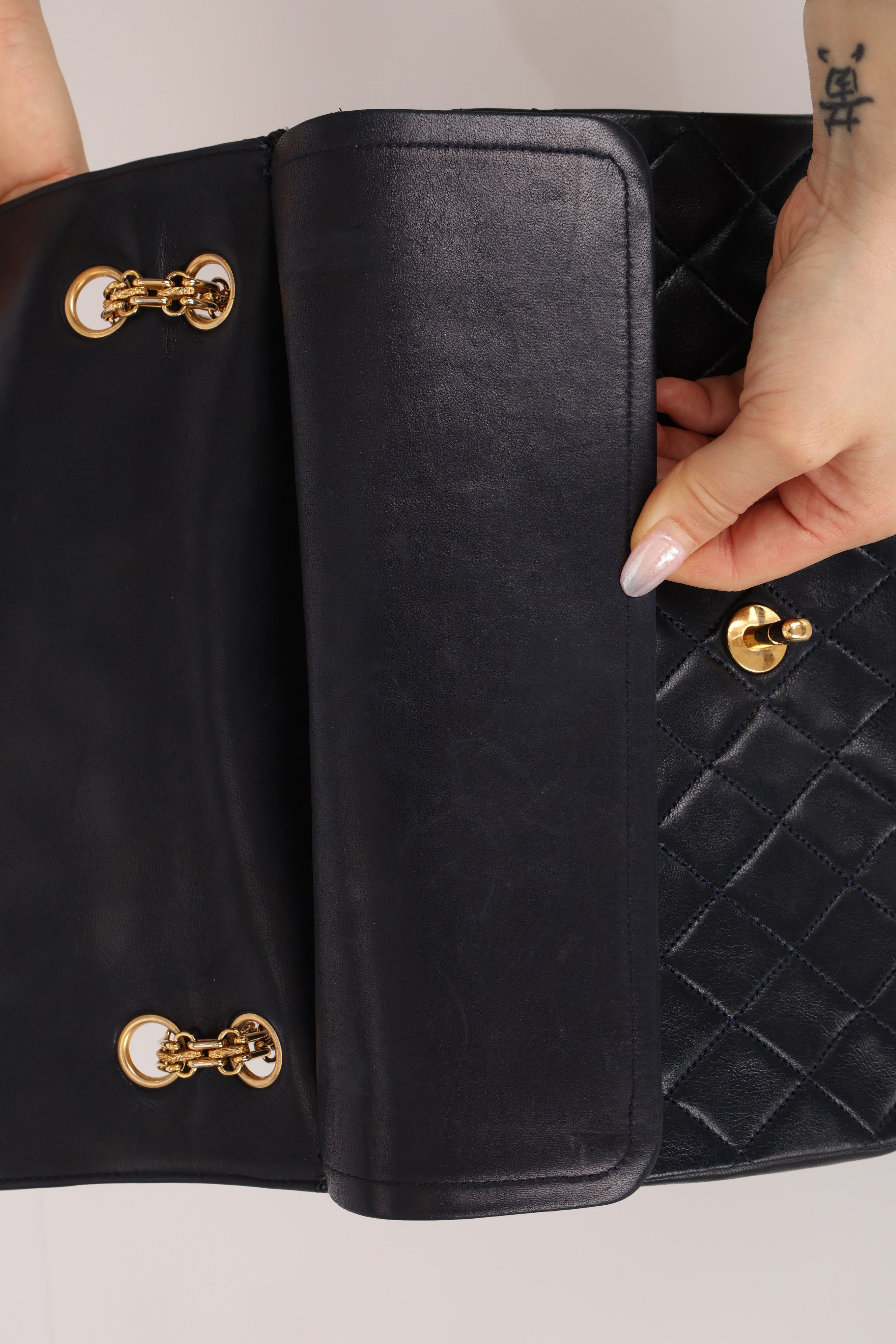 Light scratches and minor discoloration on hardware. Normal wear throughout leather. Press marks under flap.