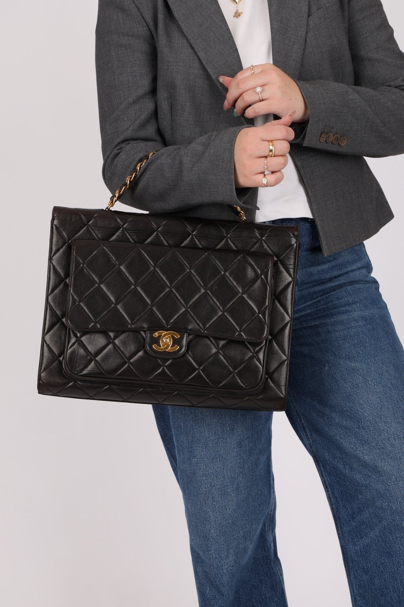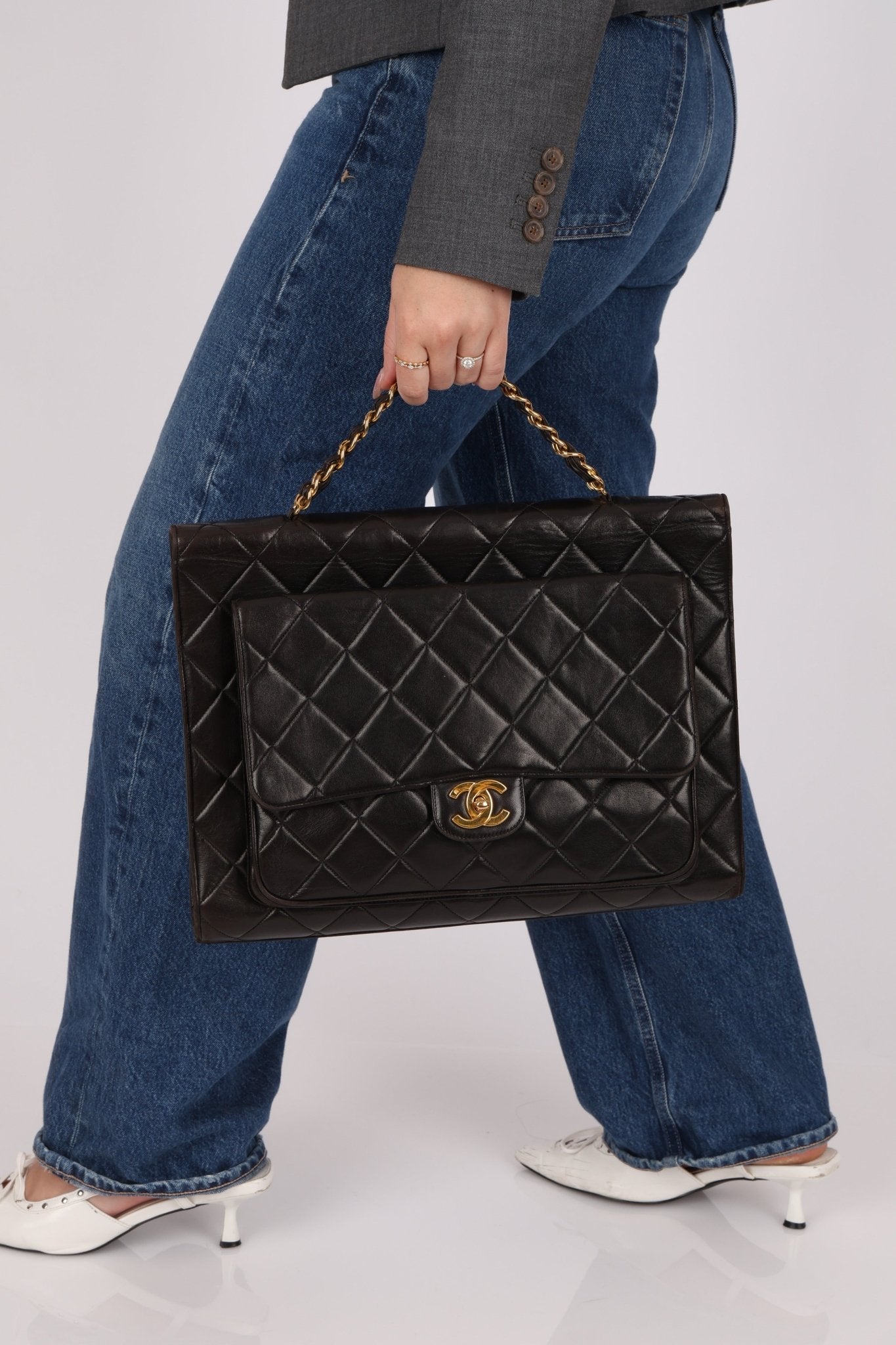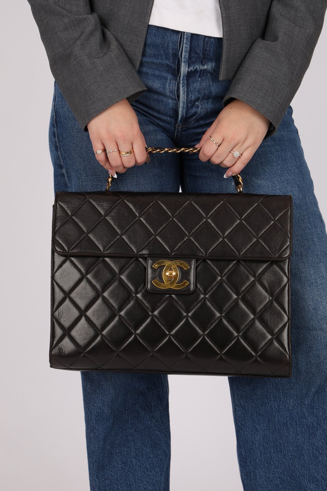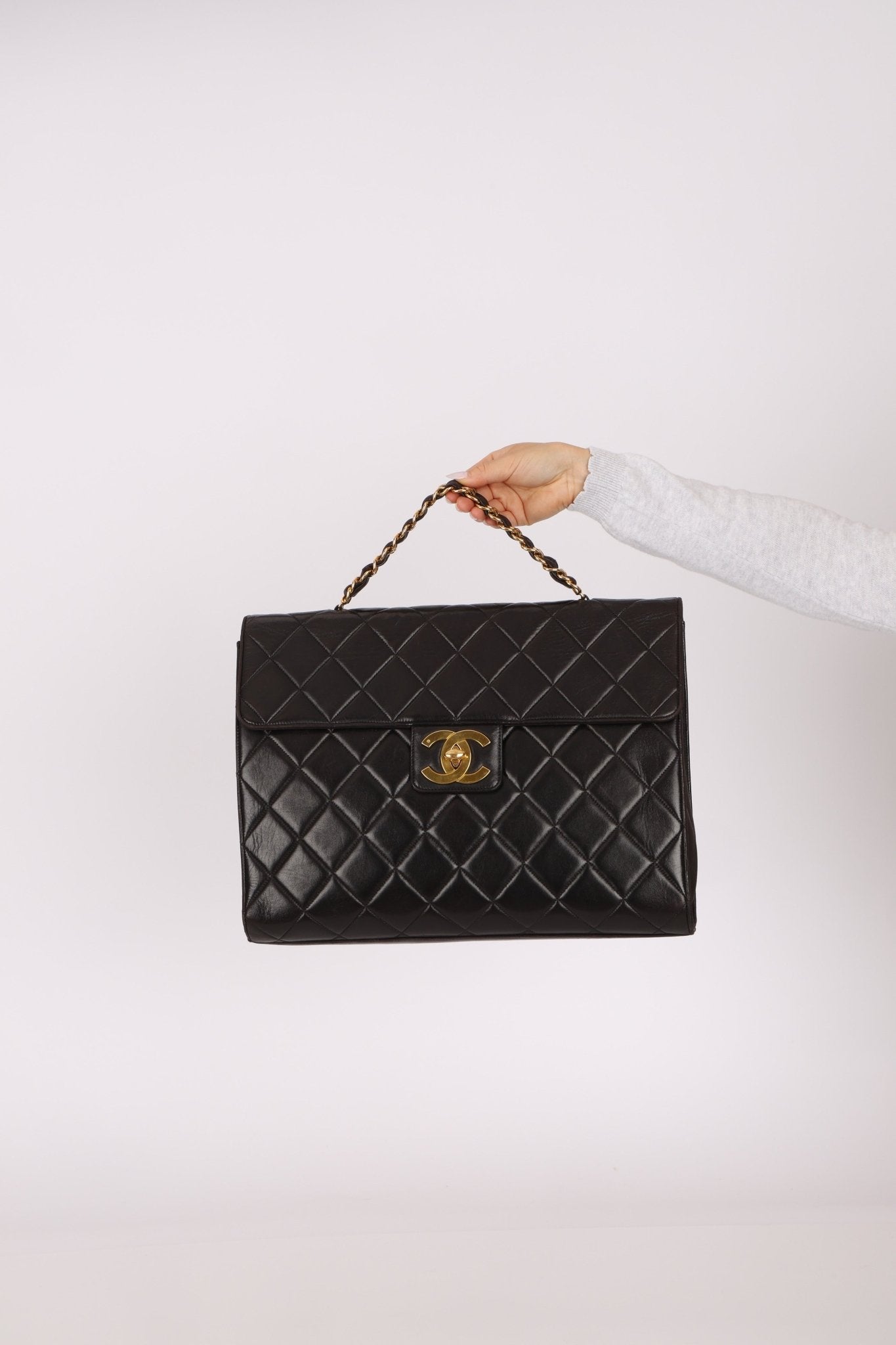 A rare gem, the Chanel Turnlock Top Handle showcases a sleek double-sided design in a refined, briefcase-inspired silhouette. Finished with the iconic chainlink as a top handle, it’s the perfect piece to elevate your office siren look with timeless Chanel sophistication.