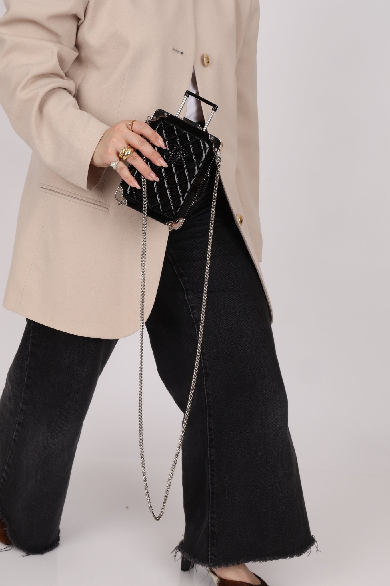 A playful nod to Karl Lagerfeld’s Spring Airlines Collection, this rare plexiglass and patent leather minaudière takes the theme to new heights—shaped like an actual suitcase, complete with a retractable handle and functional rolling wheels. Wear it as a standout clutch or sling it over your shoulder for a statement-making moment.