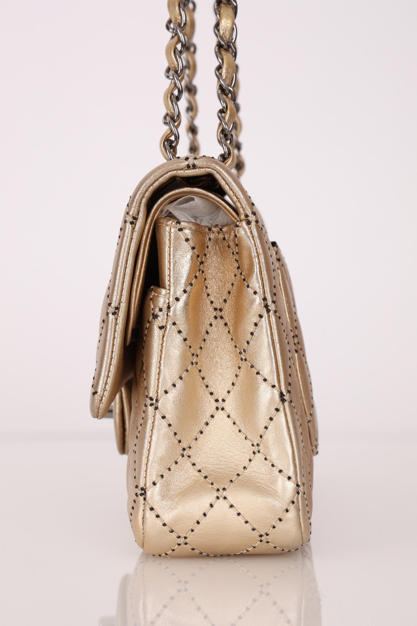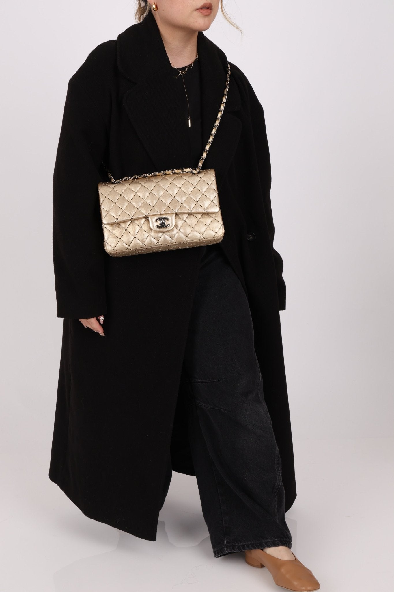 Born from Karl Lagerfeld’s visionary 2015 Cruise show in Dubai, the Paris–Dubai Double Flap bag channels the opulence of the East with a nod to One Thousand and One Nights. Subtly reimagined, the iconic silhouette is adorned with delicate beadwork woven into Chanel’s signature diamond quilting, set against a luminous gold metallic finish that captures the glow of desert luxury.