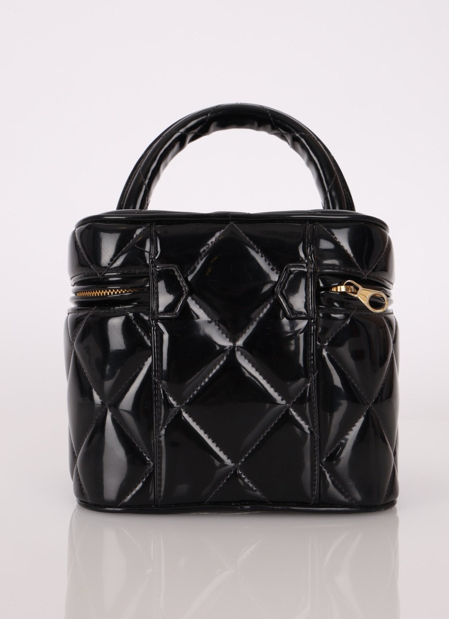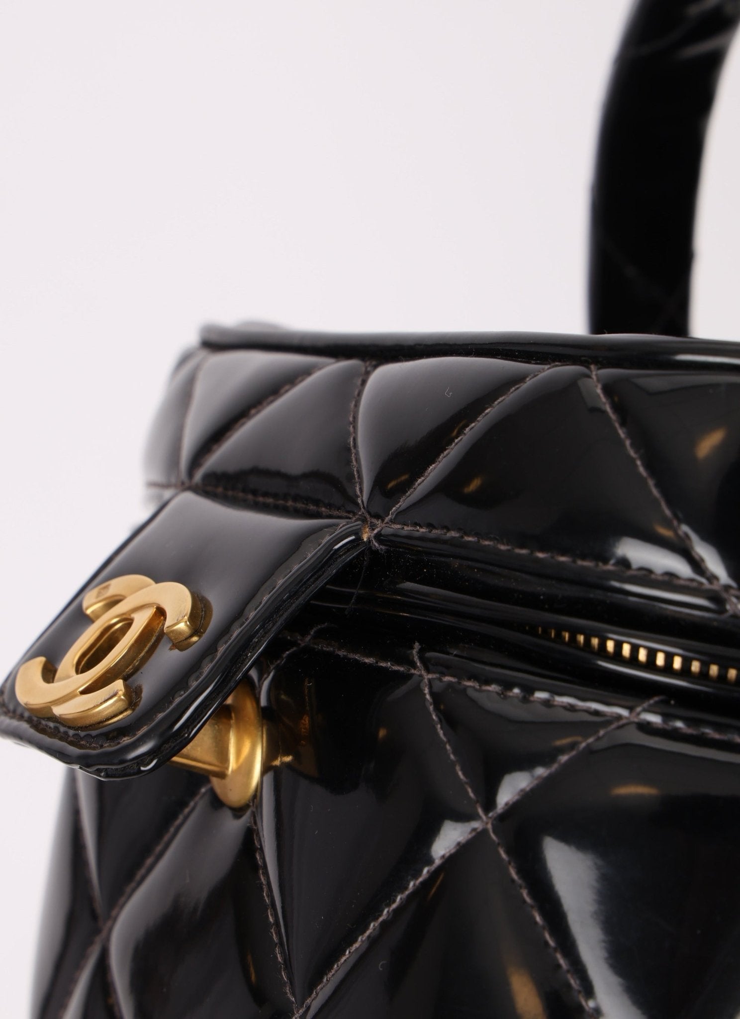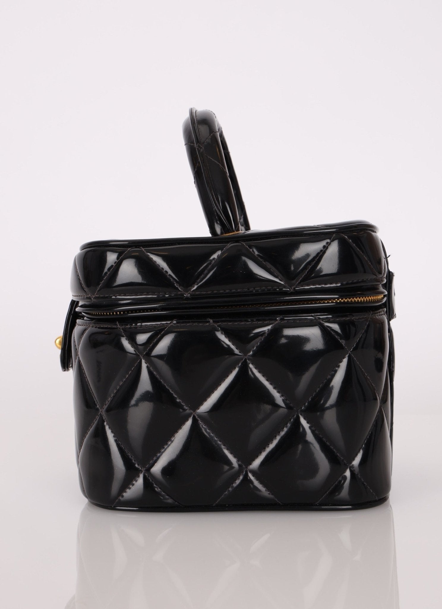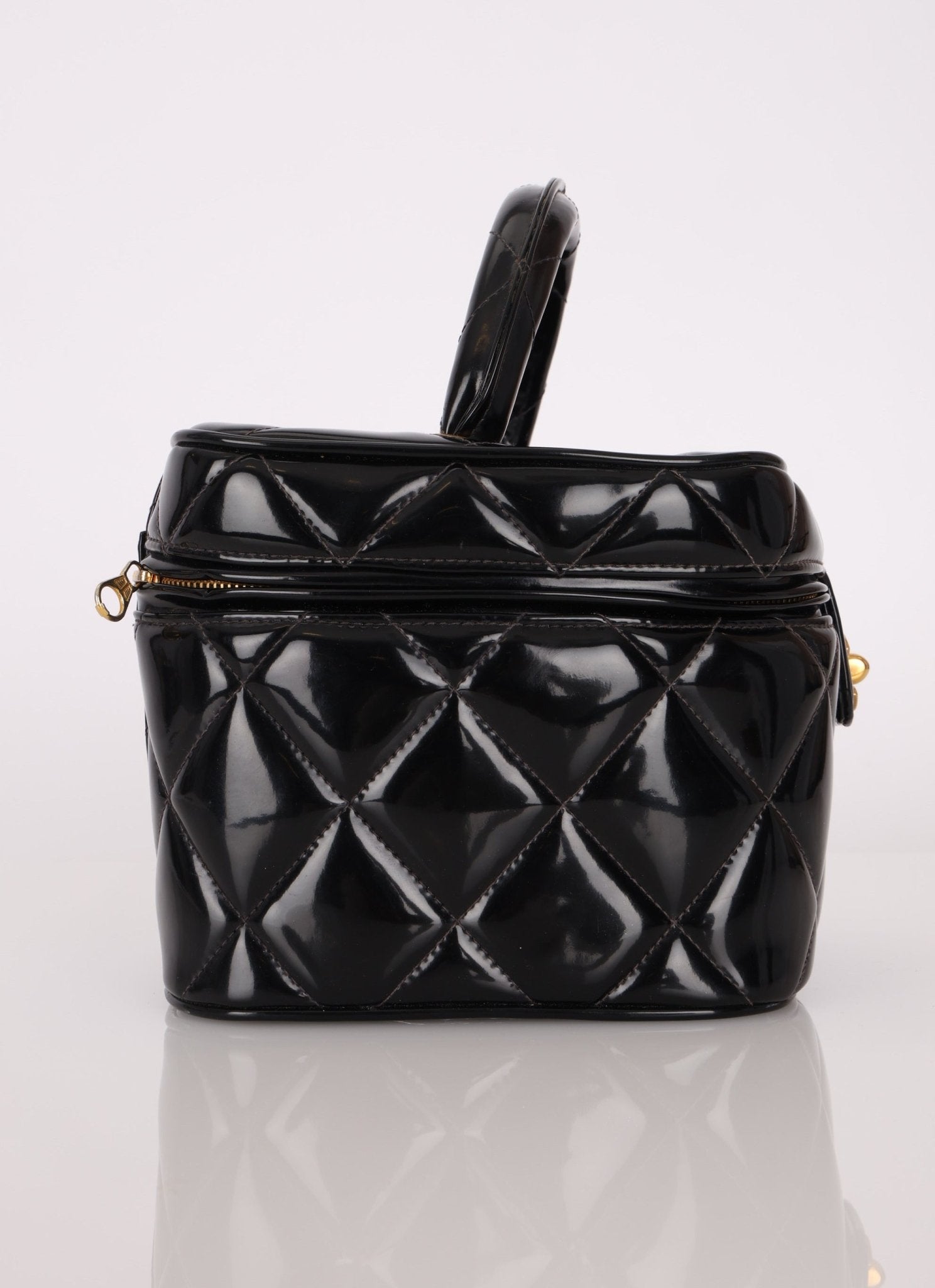 We have an ULTRA-RARE 1995 Chanel Patent Mirror Turnlock Vanity! What makes this specific piece extra rare is the contrast white CC hidden at the bottom (non 1995 versions had the black CC at the bottom) and the RARE heart mirror with gold stamped Chanel logos throughout the interior (non 1995 versions did not have a mirror or gold Chanel stamps inside. This special piece is considered the Barbie bag of Chanel. This rare version of this model typically starts at $5k resale.