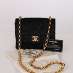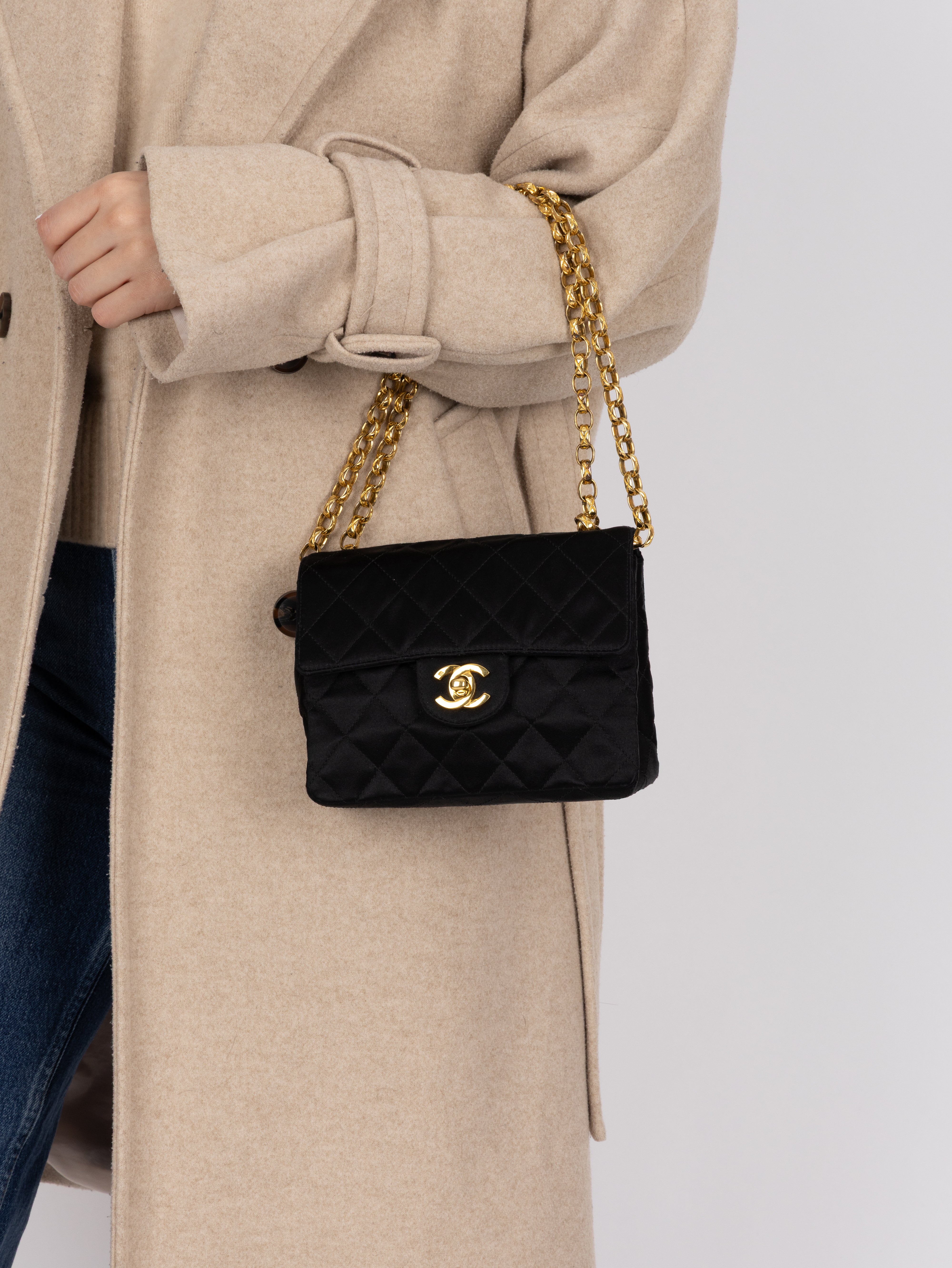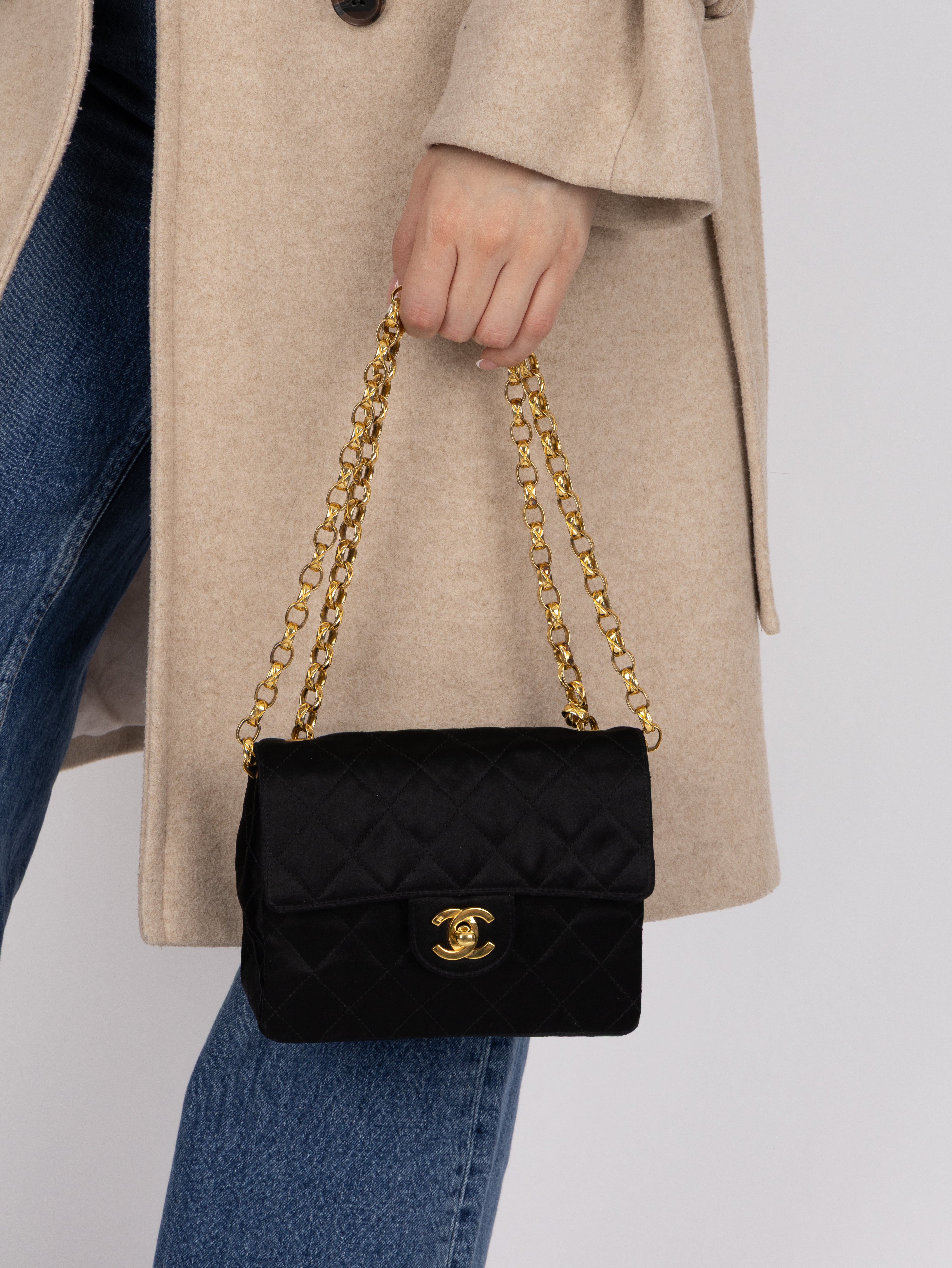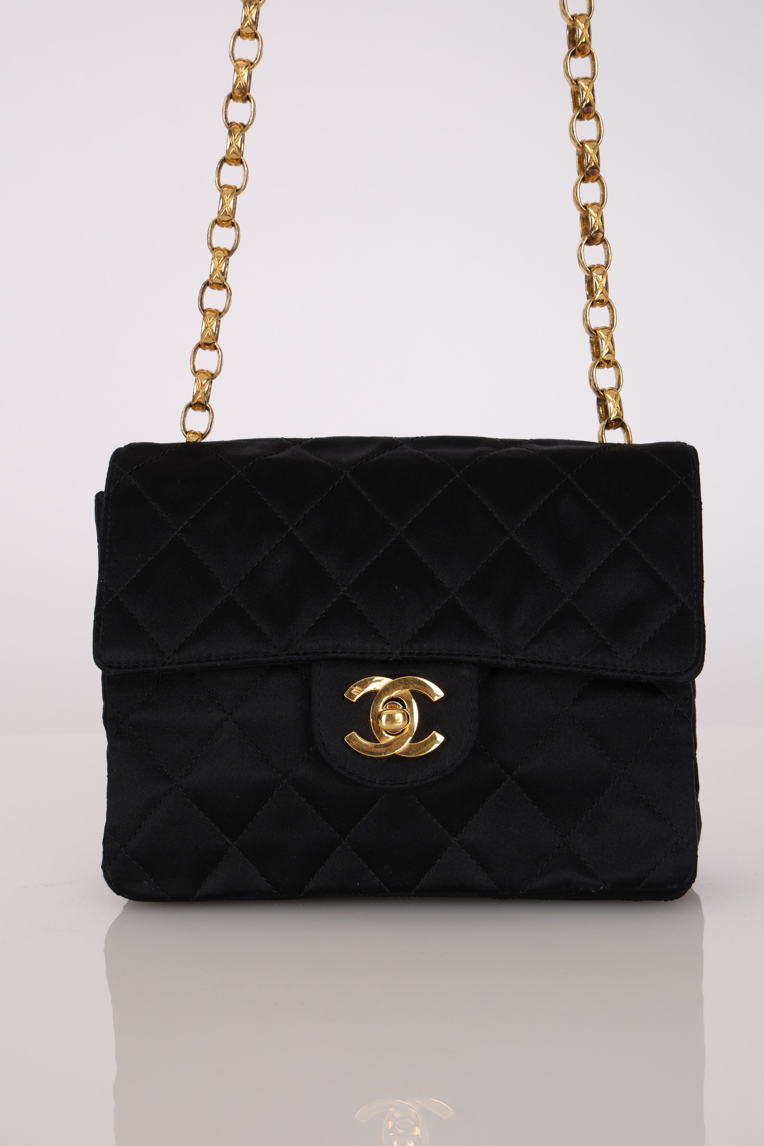 This mini vintage Chanel square flap features iconic diamond quilting in lustrous satin, finished with a 24K gold-plated turnlock for a refined, elegant look. Perfectly sized for evenings at the ballet or theatre, it pairs timeless sophistication with effortless wearability. The standout bijoux chain adds an extra layer of glamour, elevating the piece into a truly special collector’s find.