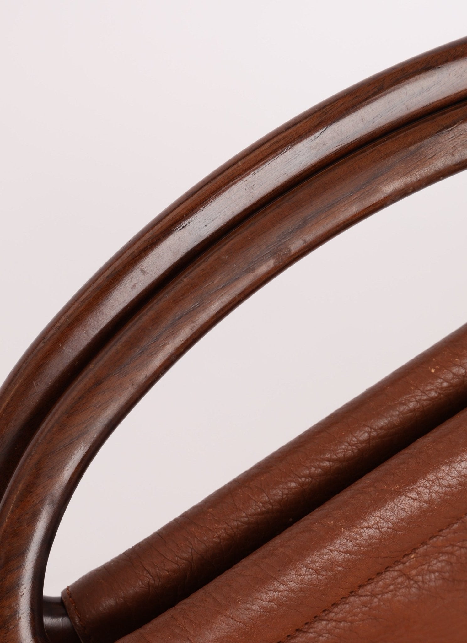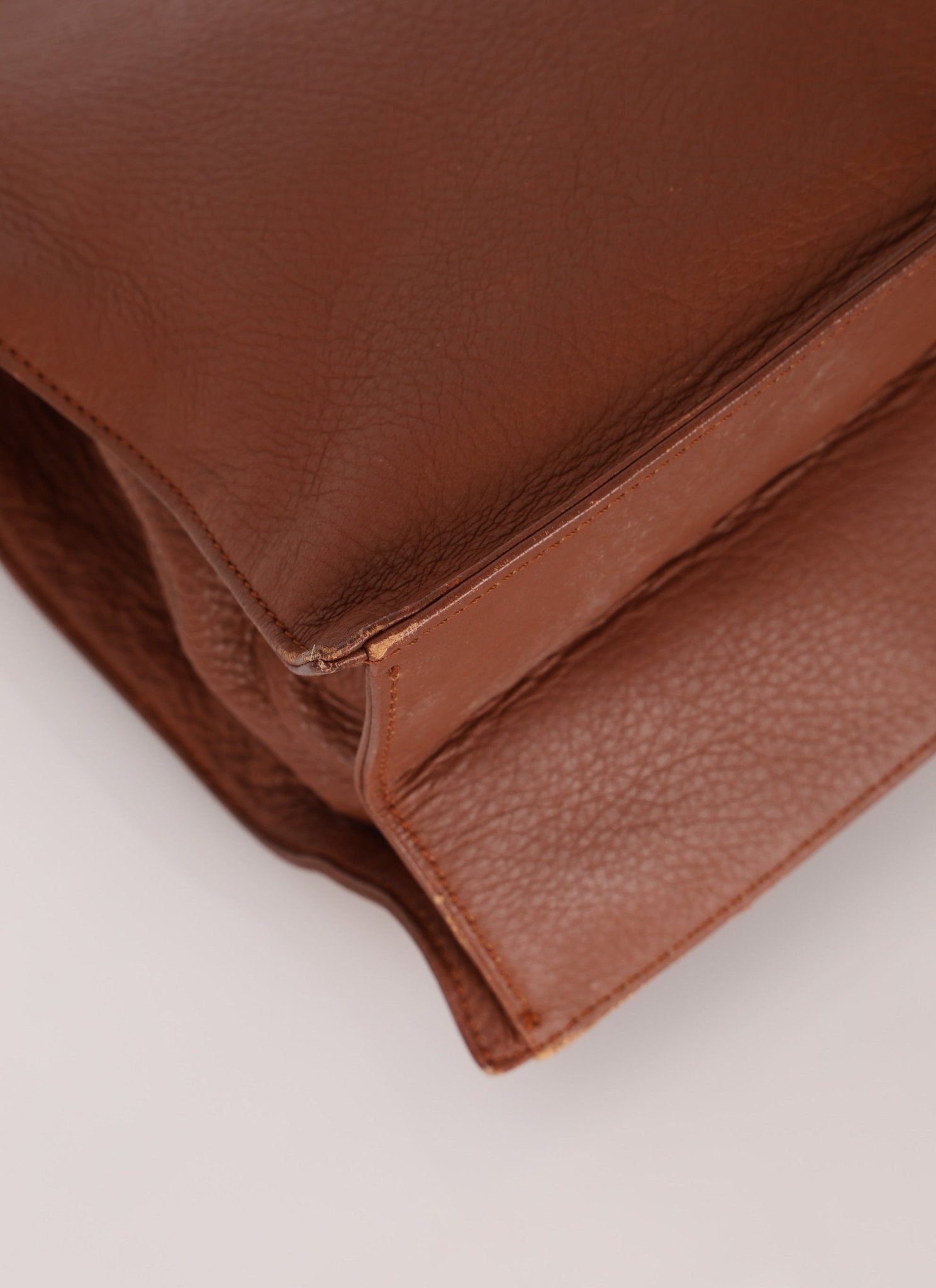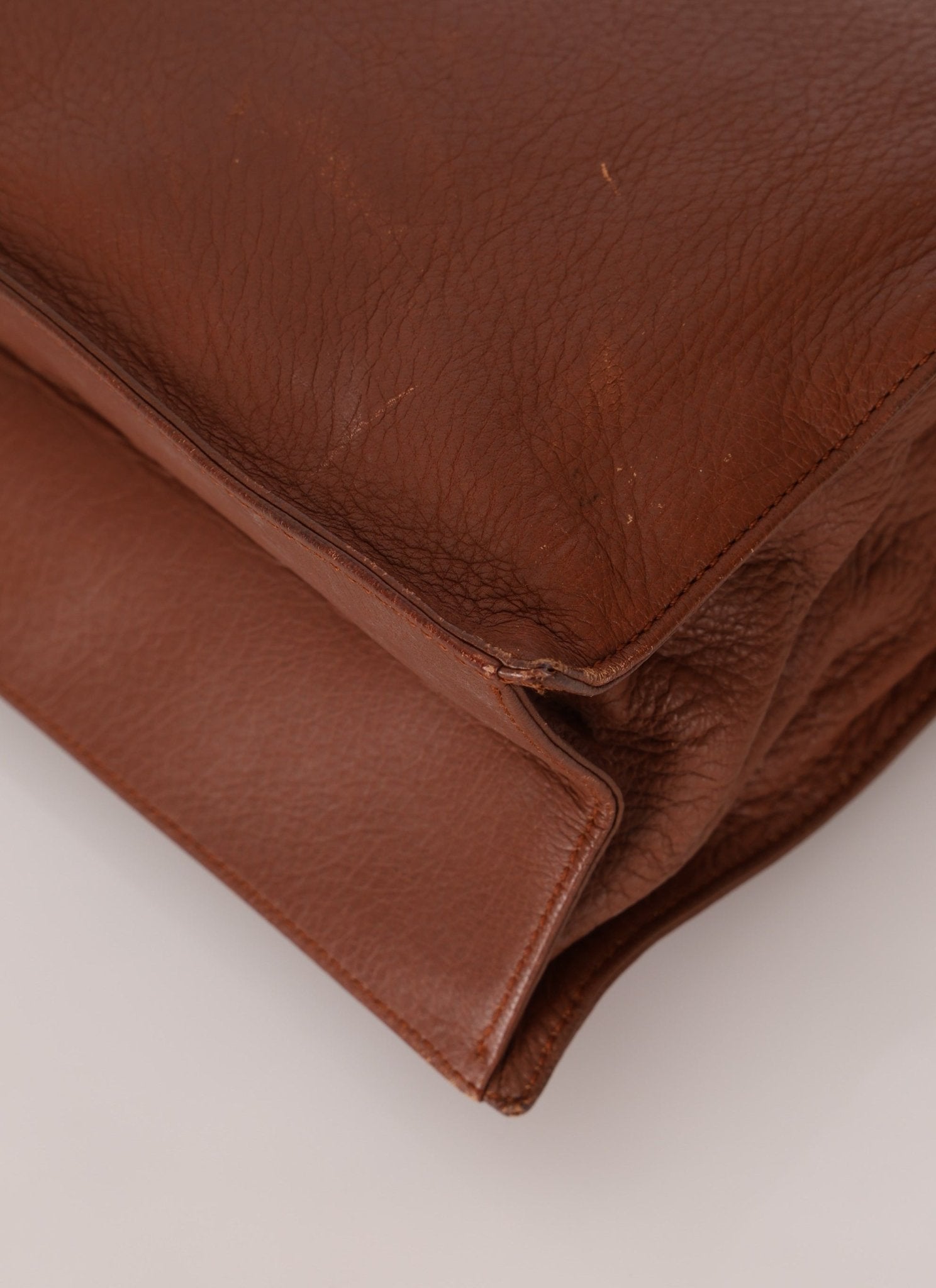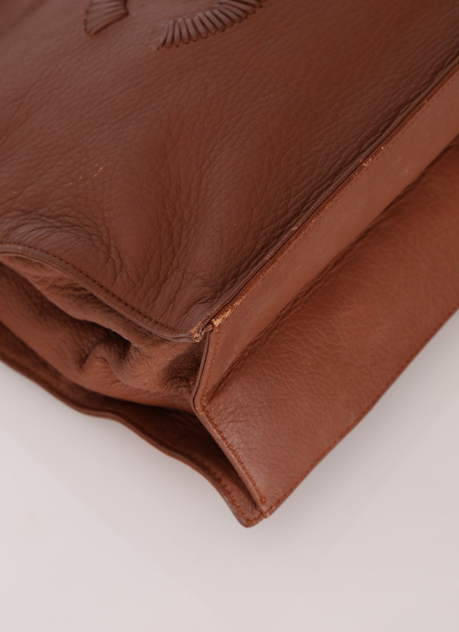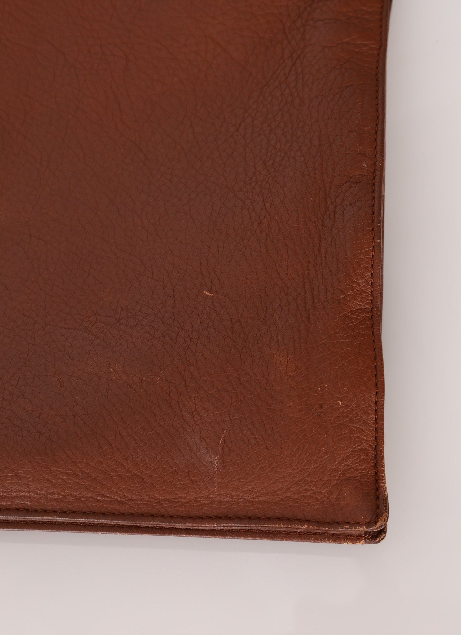 Edge rubs. Scratches on leather. Wear on wooden acrylic top handle. Small tear in inner lining.