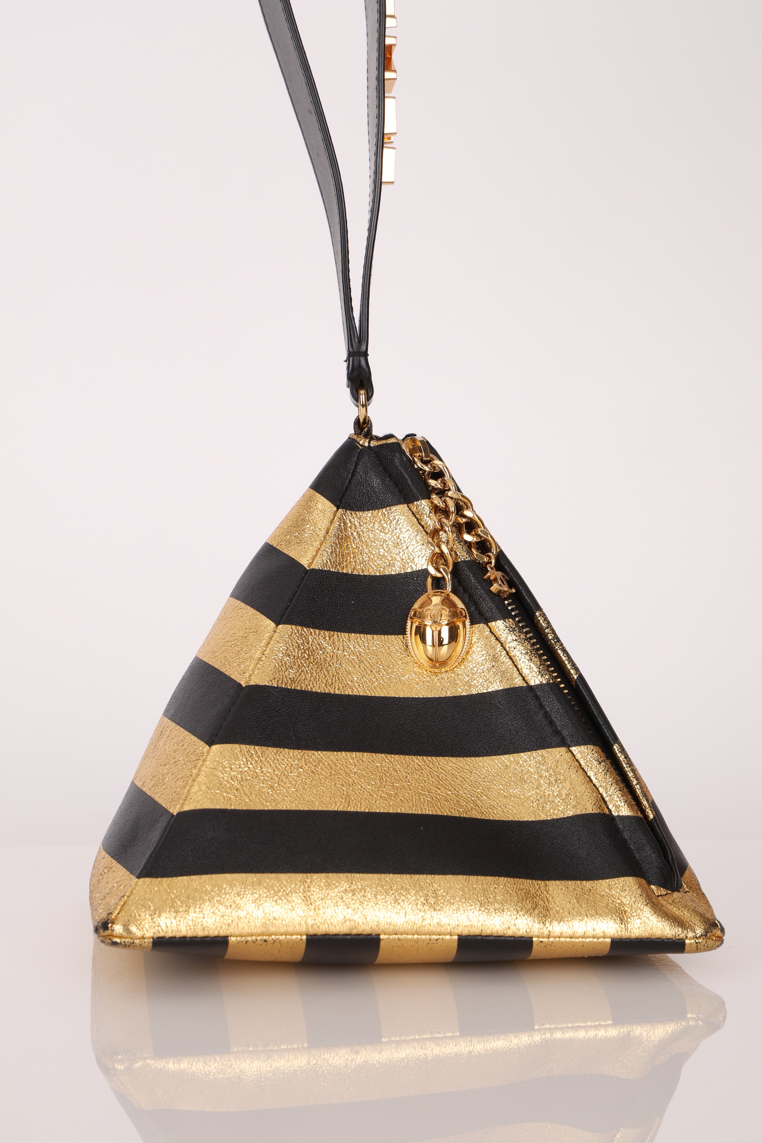 From Karl Lagerfeld's iconic last Pre-Fall show, 2019 Paris-Egypt Métiers d’Art collection, this Chanel Metallic Lambskin Striped Pyramid Wristlet showcases the chic blend of modern New York and Ancient Egypt. This collection was heavily celebrated for capturing the opulence of ancient Egypt through Chanel’s modern, wearable lens.