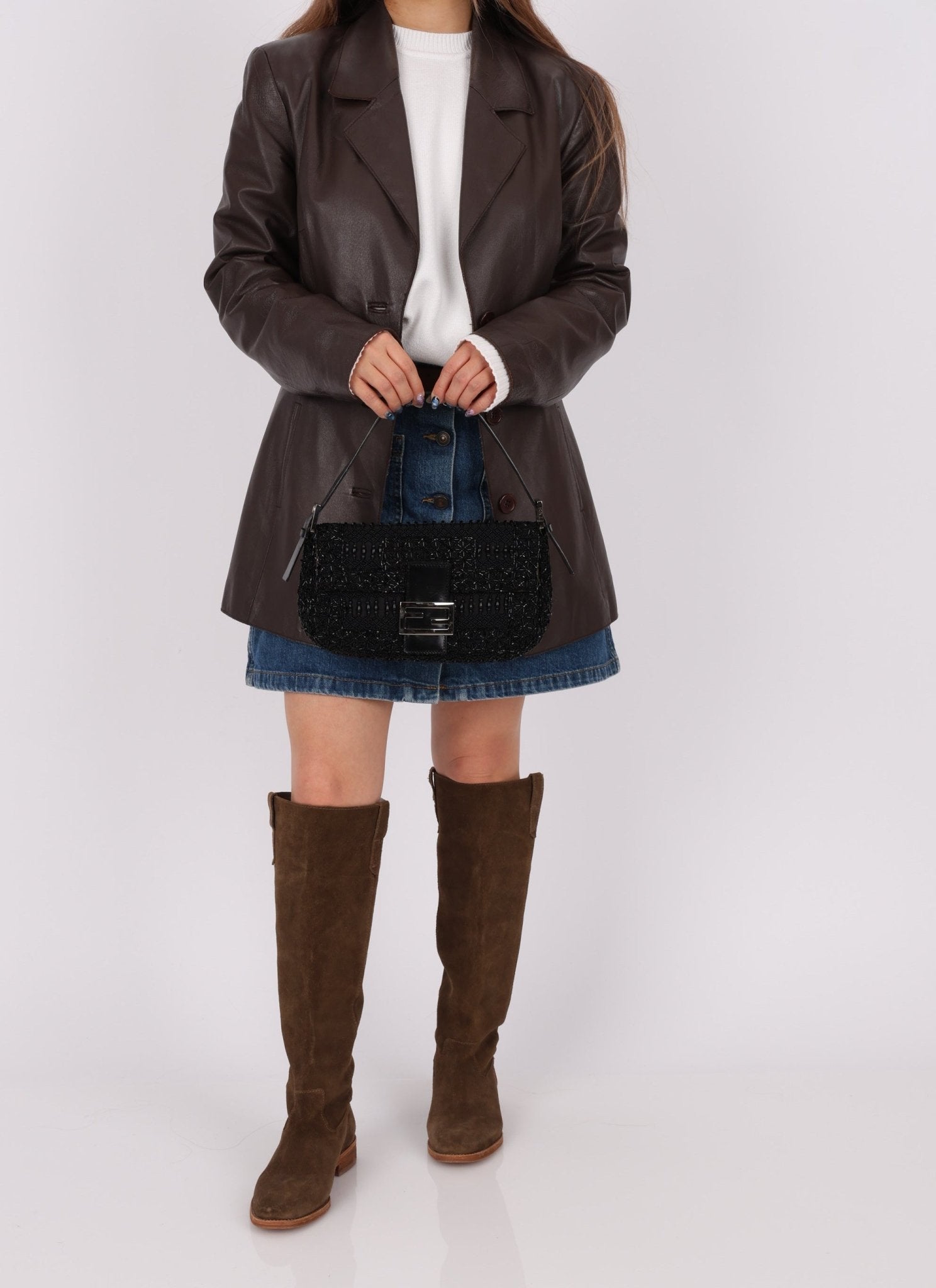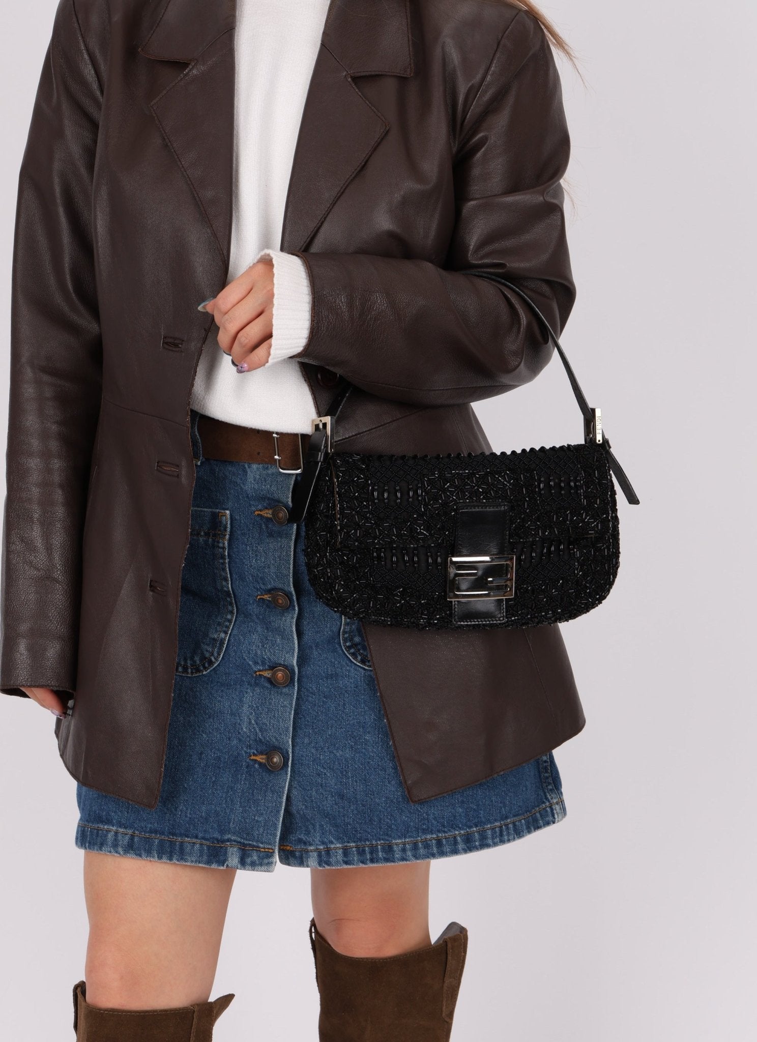 Reminiscent of Carrie Bradshaw's iconic beaded Fendi Baguettes, this bag showcases Fendi's expert hand-beaded technique with an intricate design. The all-black details add a touch of understated sparkle and glamour, making it the perfect evening piece.