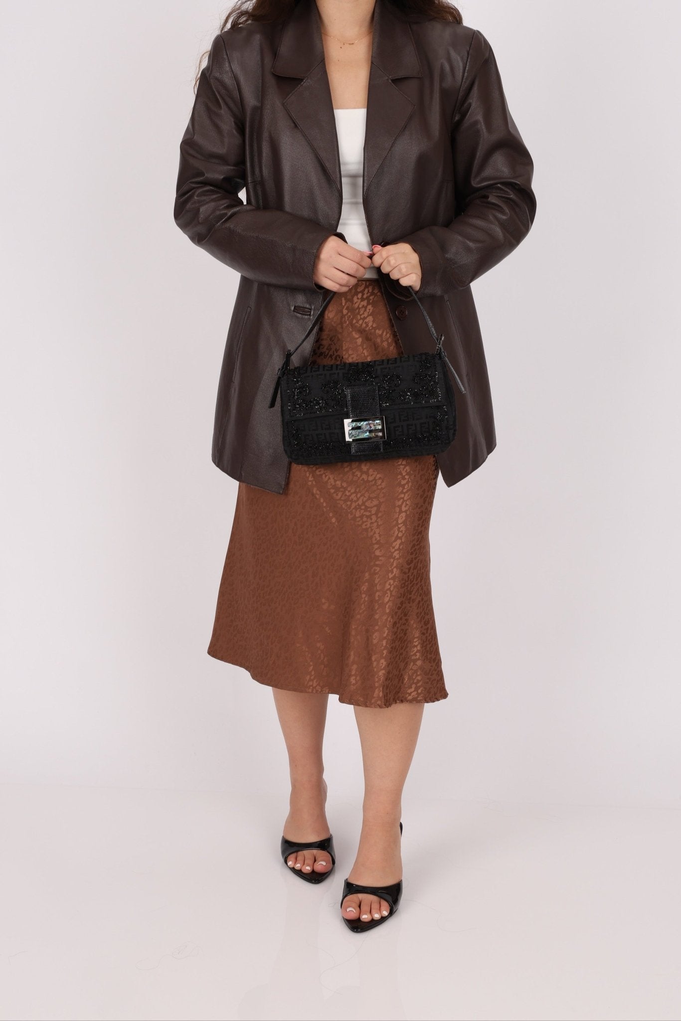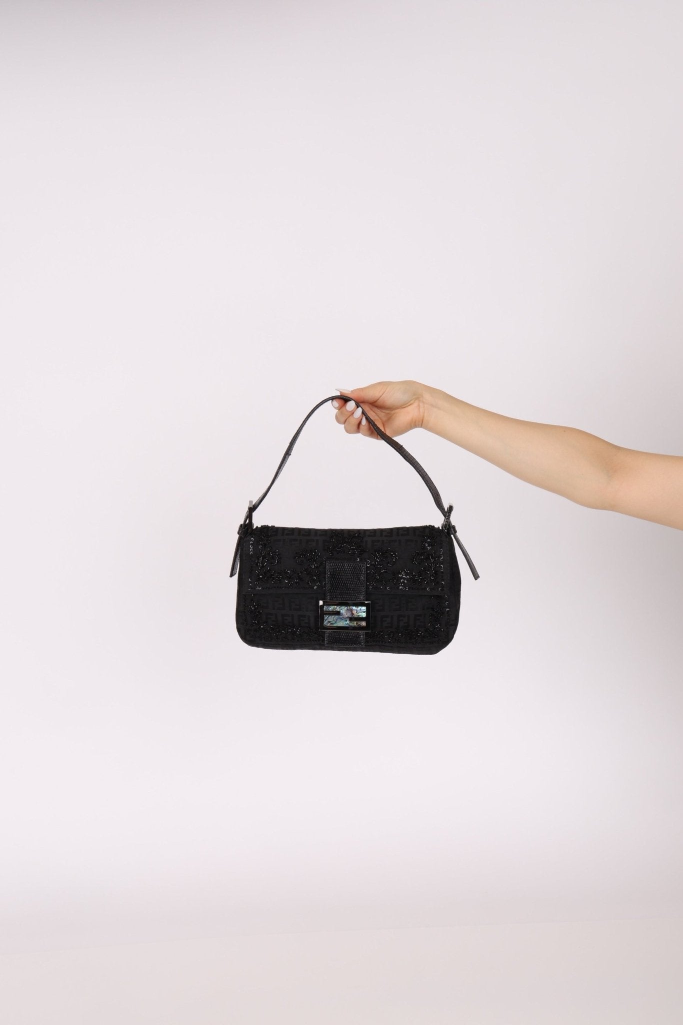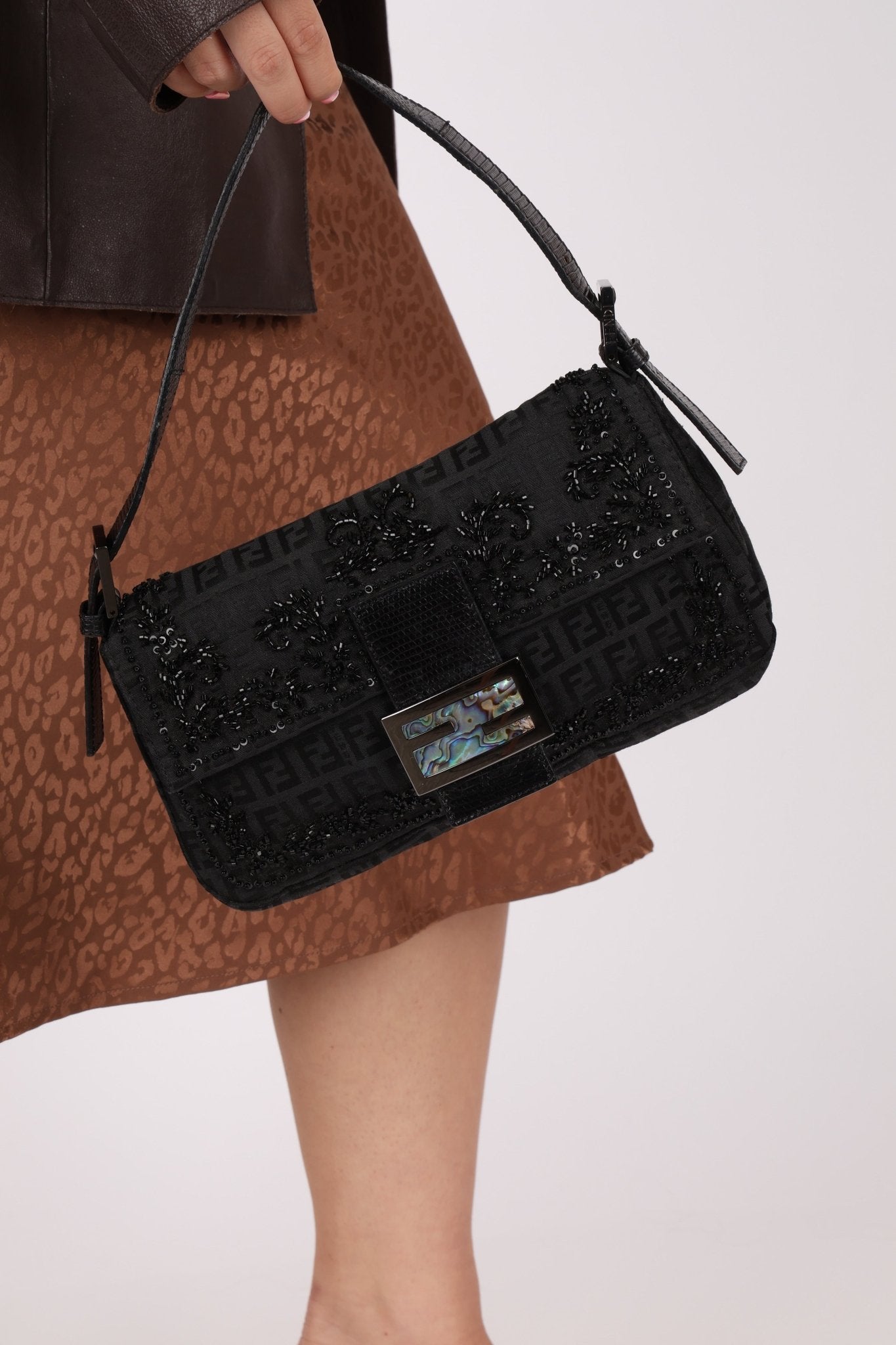 This rare Fendi Baguette is a showcase of exceptional craftsmanship, marrying intricate hand-beading with exotic Karang lizard trim. Its luminous mother-of-pearl logo buckle adds a striking finish, making it a true work of wearable art.