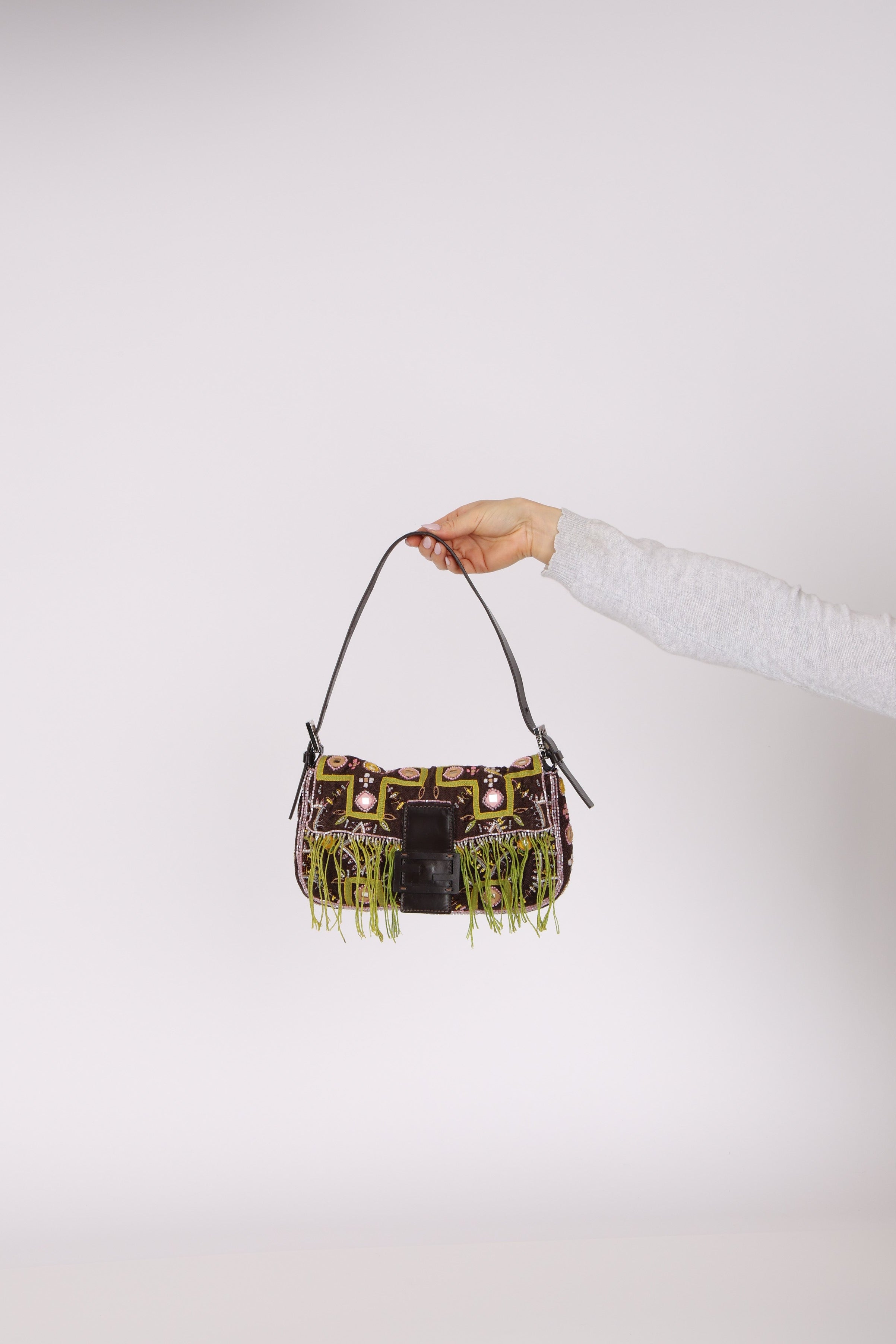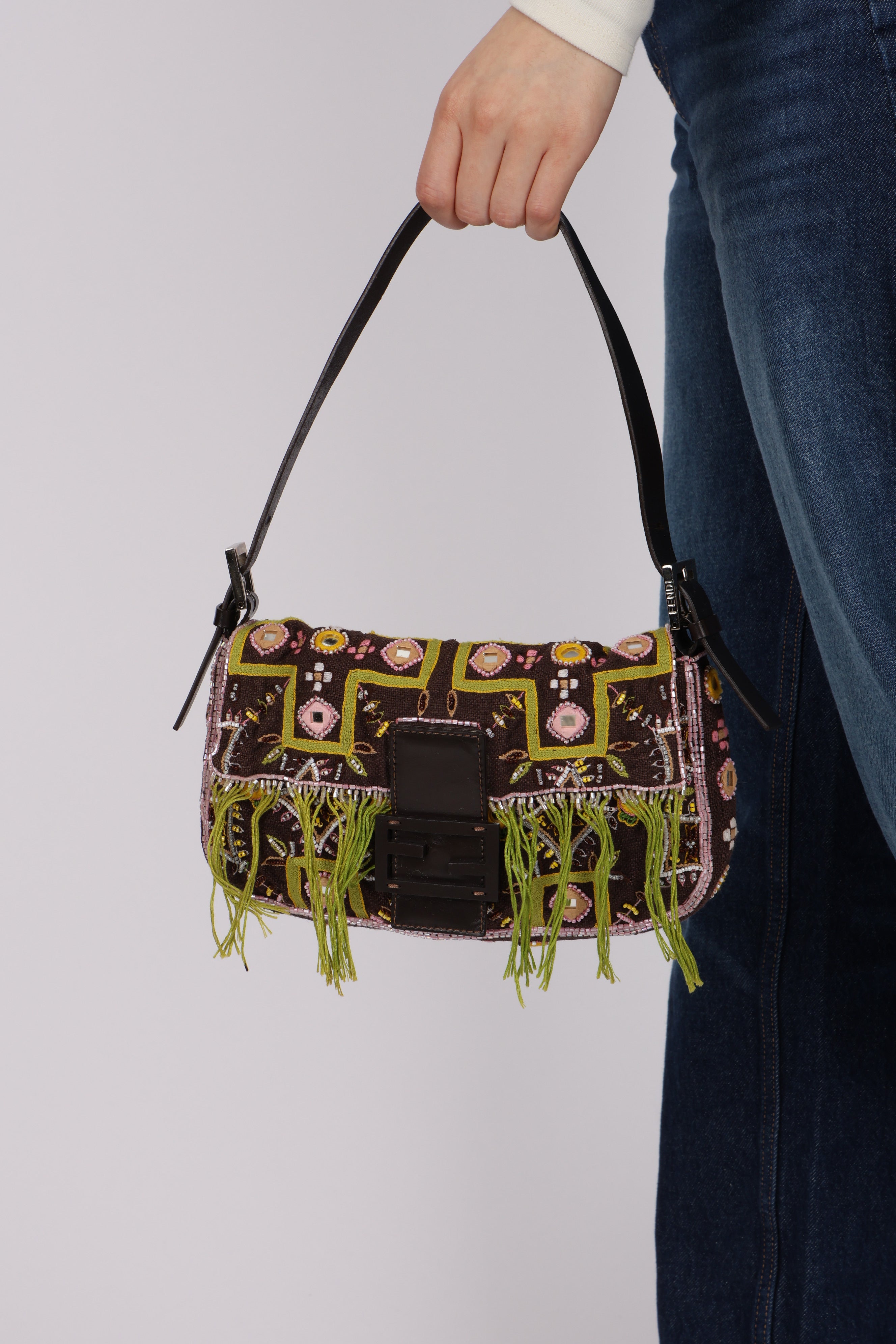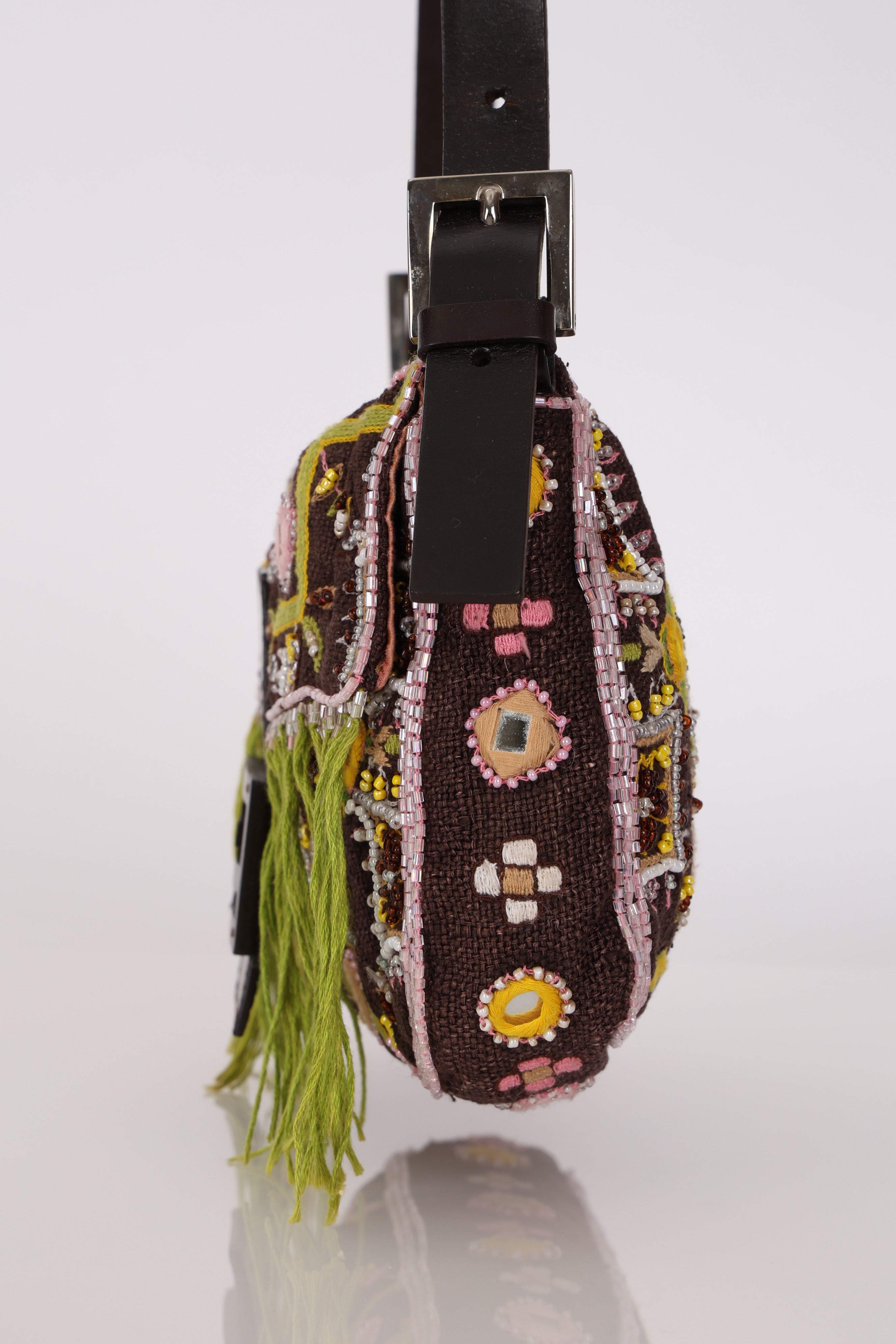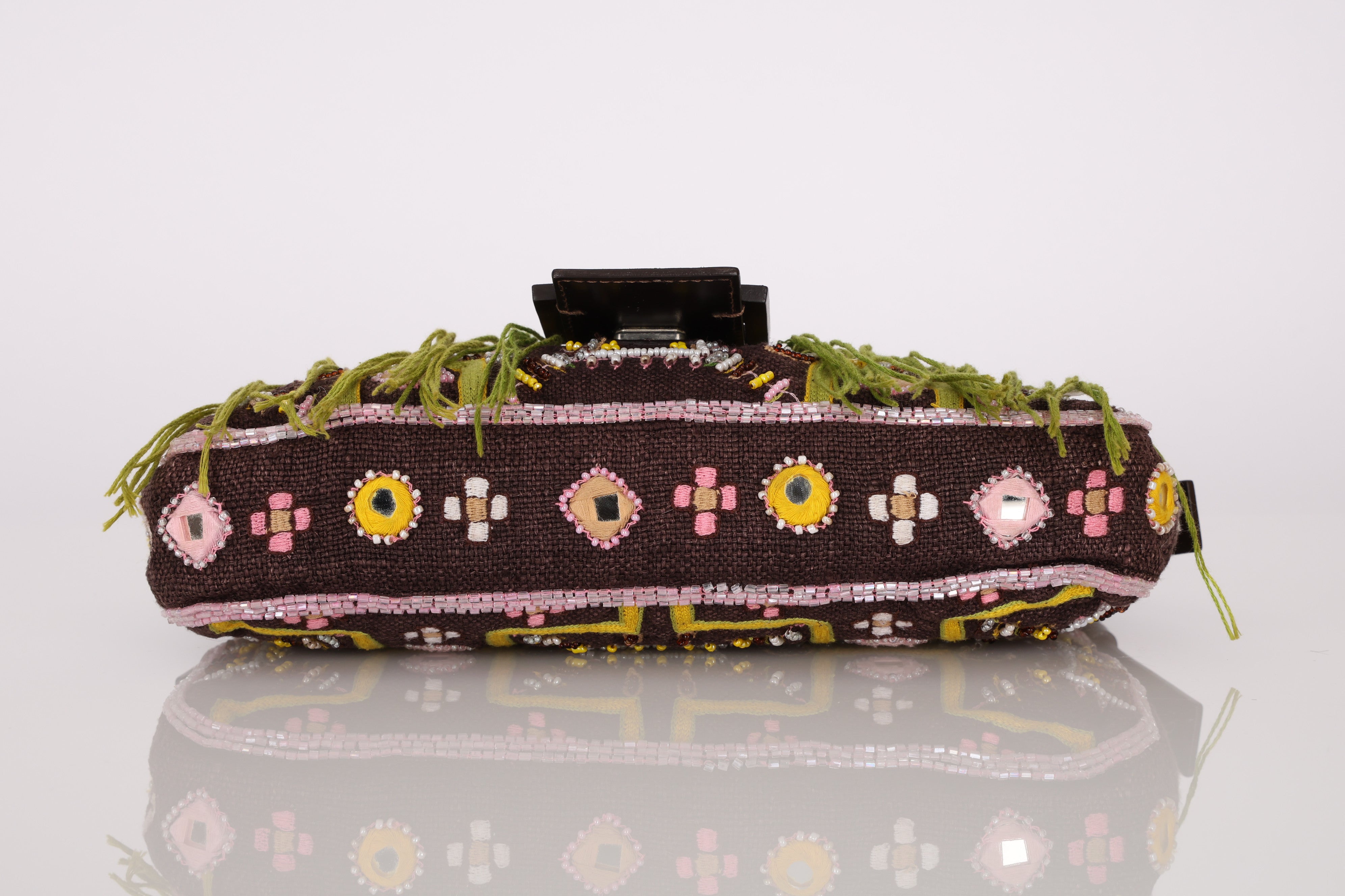 Limited Edition Fendi Brown Embroidered Fringe Beads Baguette Bag