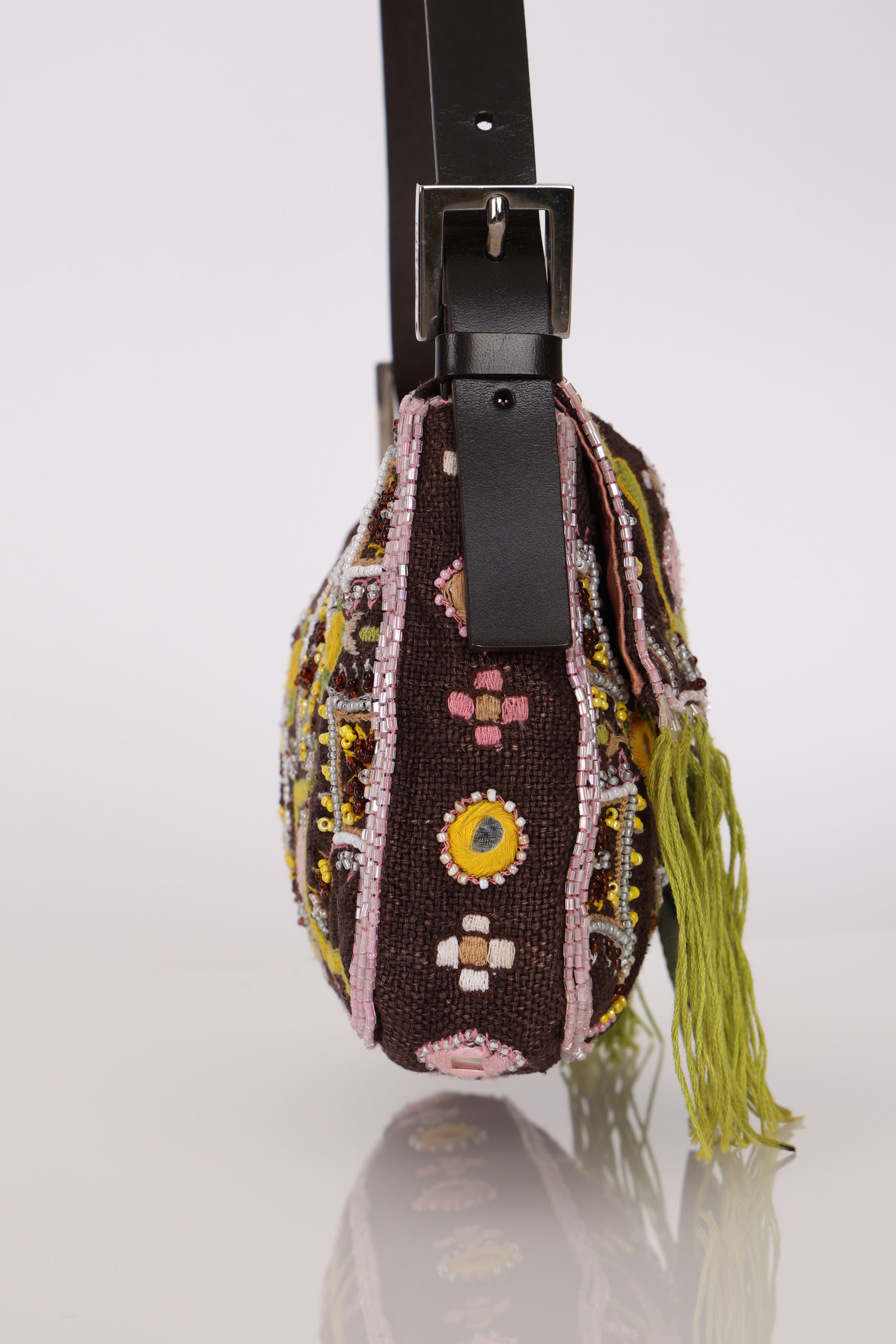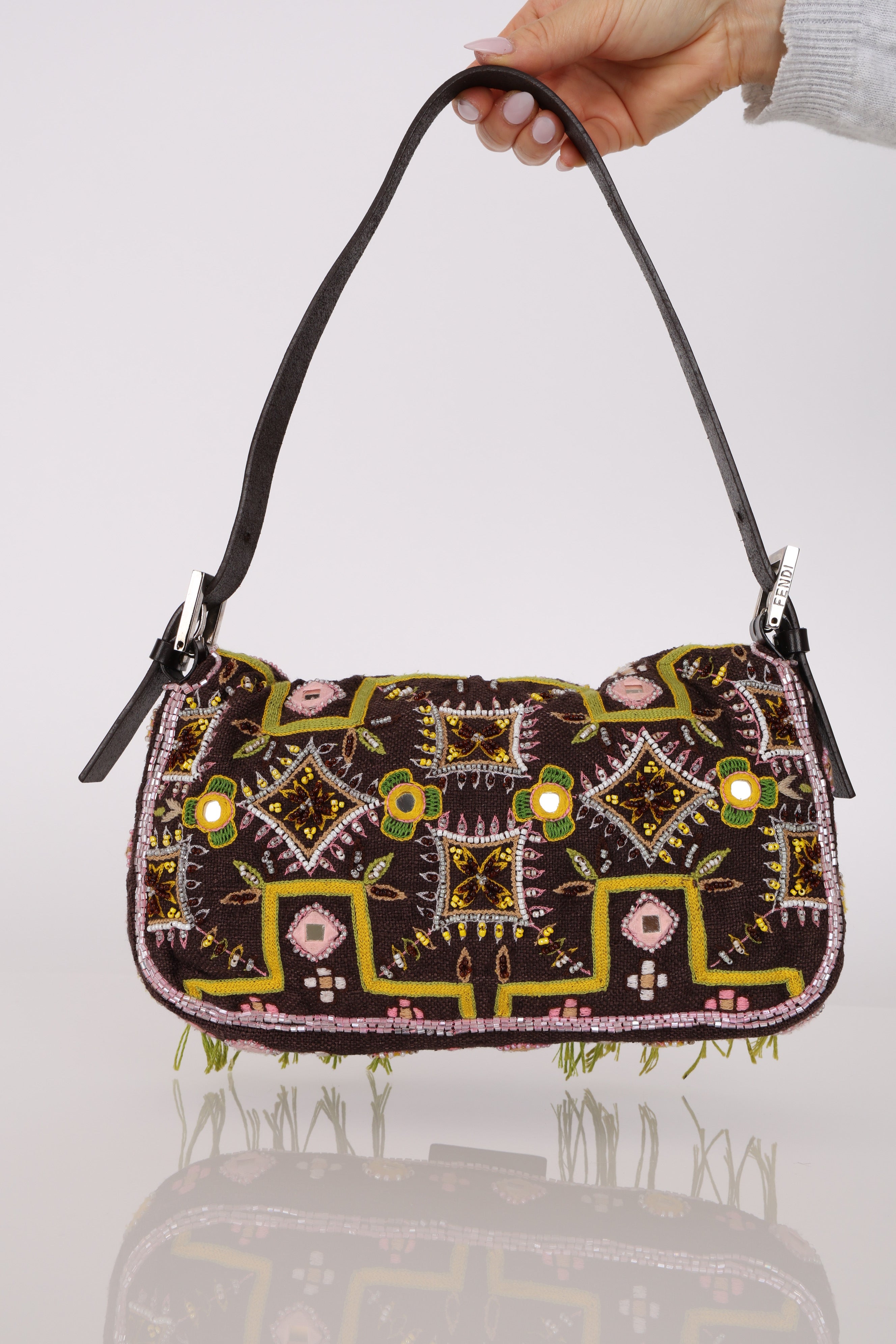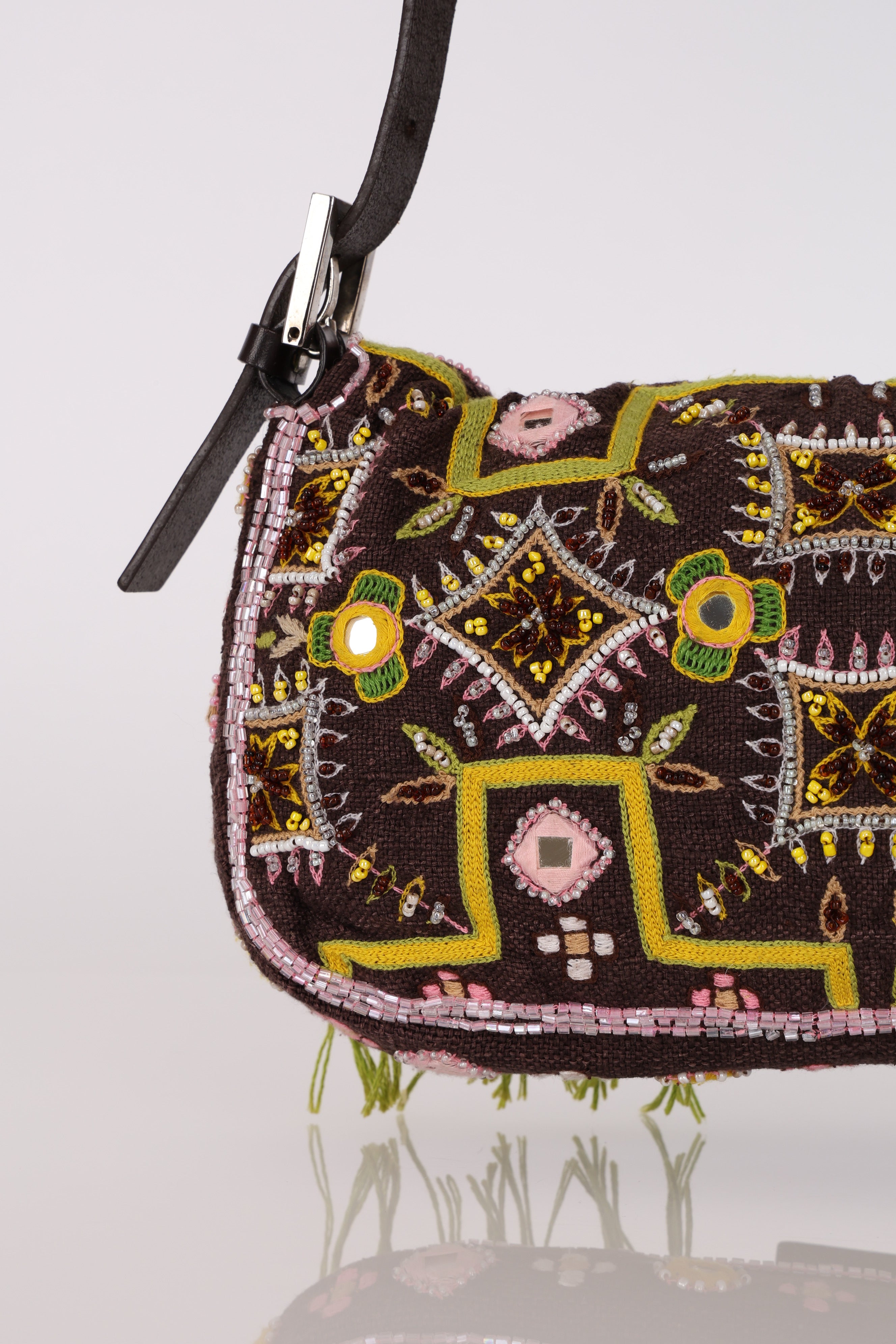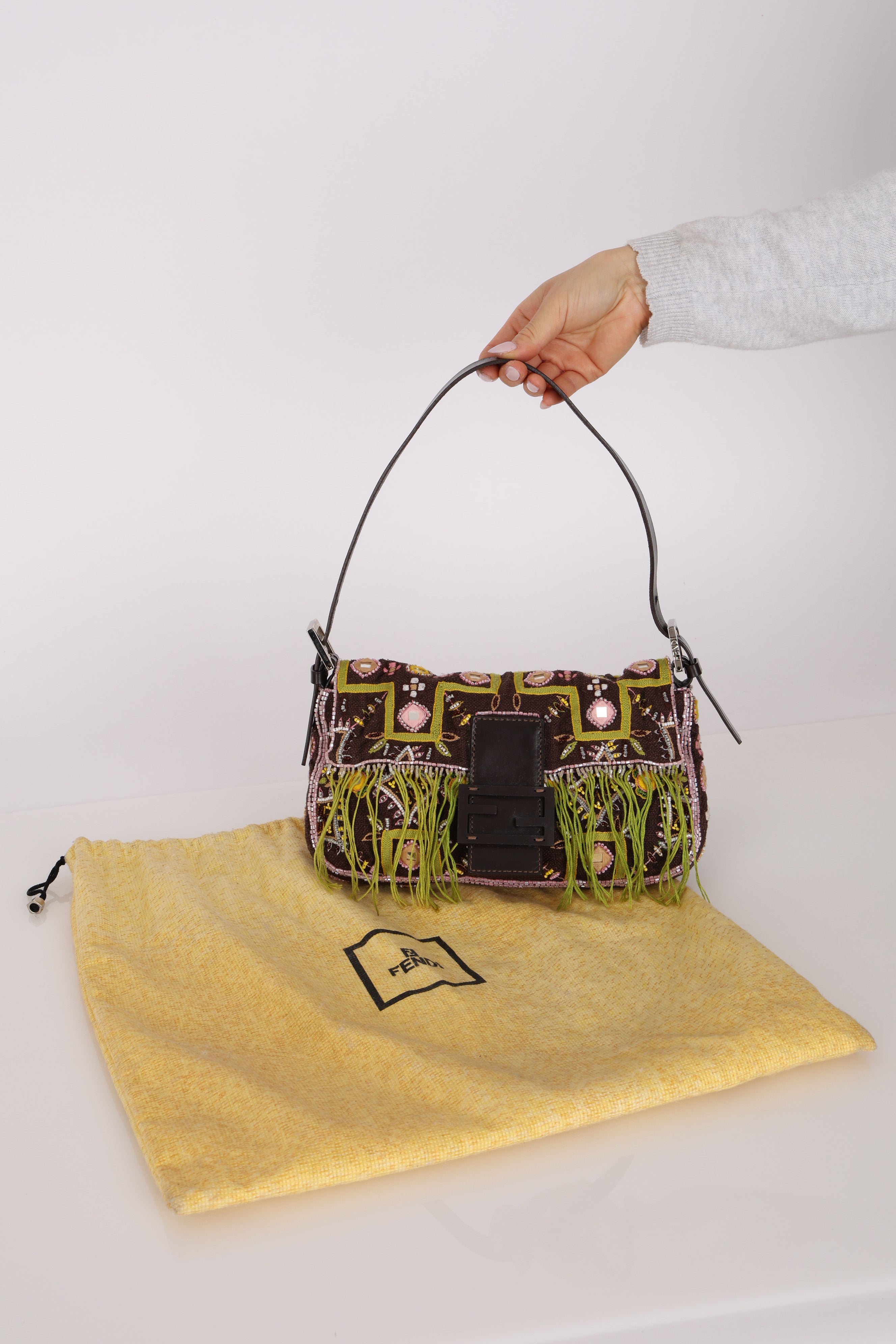 Limited Edition Fendi Brown Embroidered Fringe Beads Baguette Bag