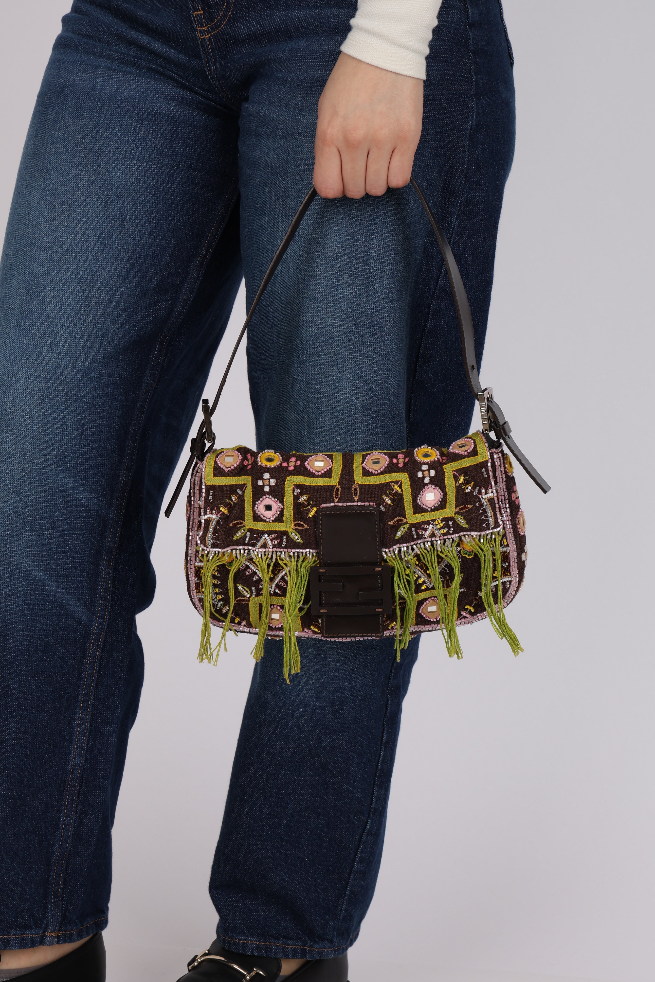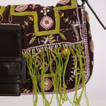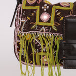 Fendi channels true boho fashion in this Baguette, decorated with green fringe, hand-beaded designs, and embroidered trim. The impeccable combination of design elements proves why the Fendi Baguette is one of the most highly sought after vintage bags.