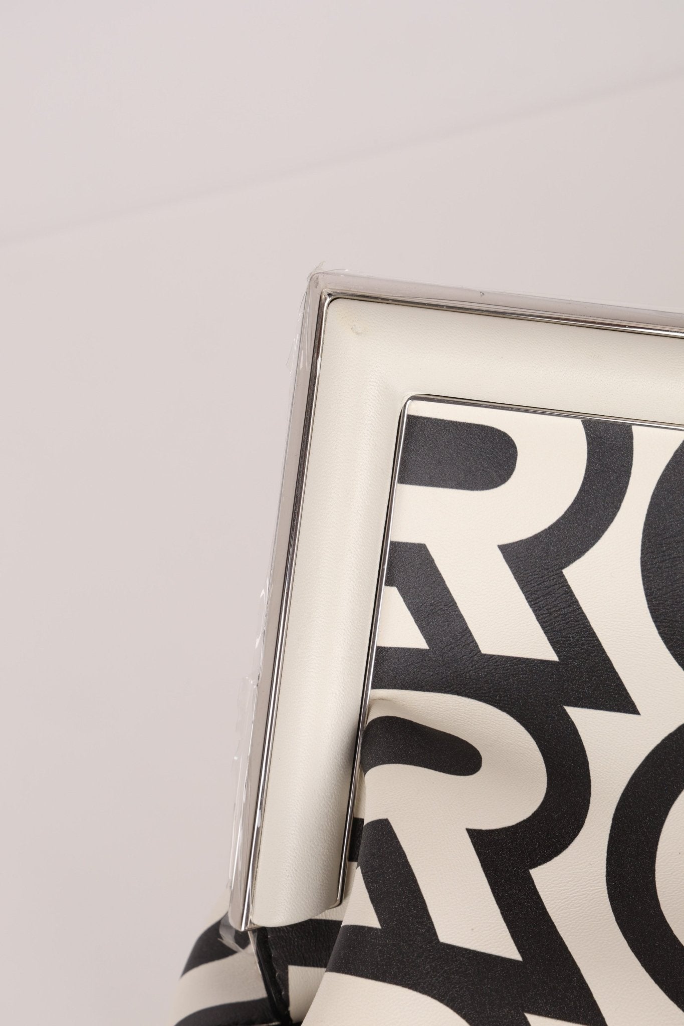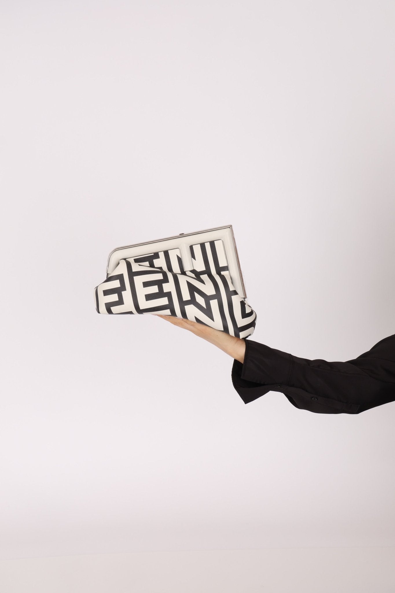 As a close friend and mentor to Kim Jones, Marc Jacobs worked with the house to create a special capsule collection, reimagining the FENDI ROMA logo in 2023. This Fendi First Clutch in small was one style chosen for the limited edition logo, featuring white and bold black lettering.