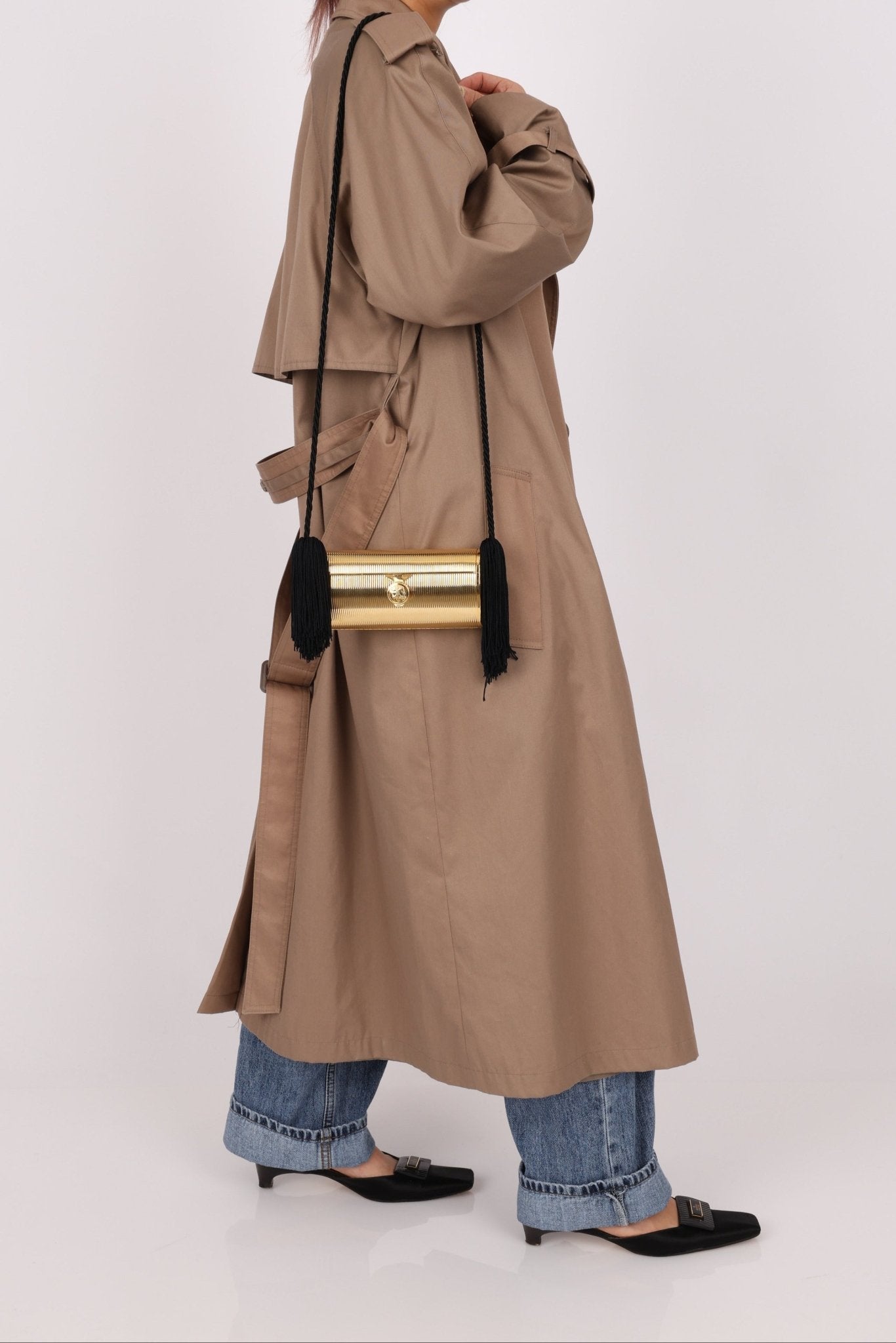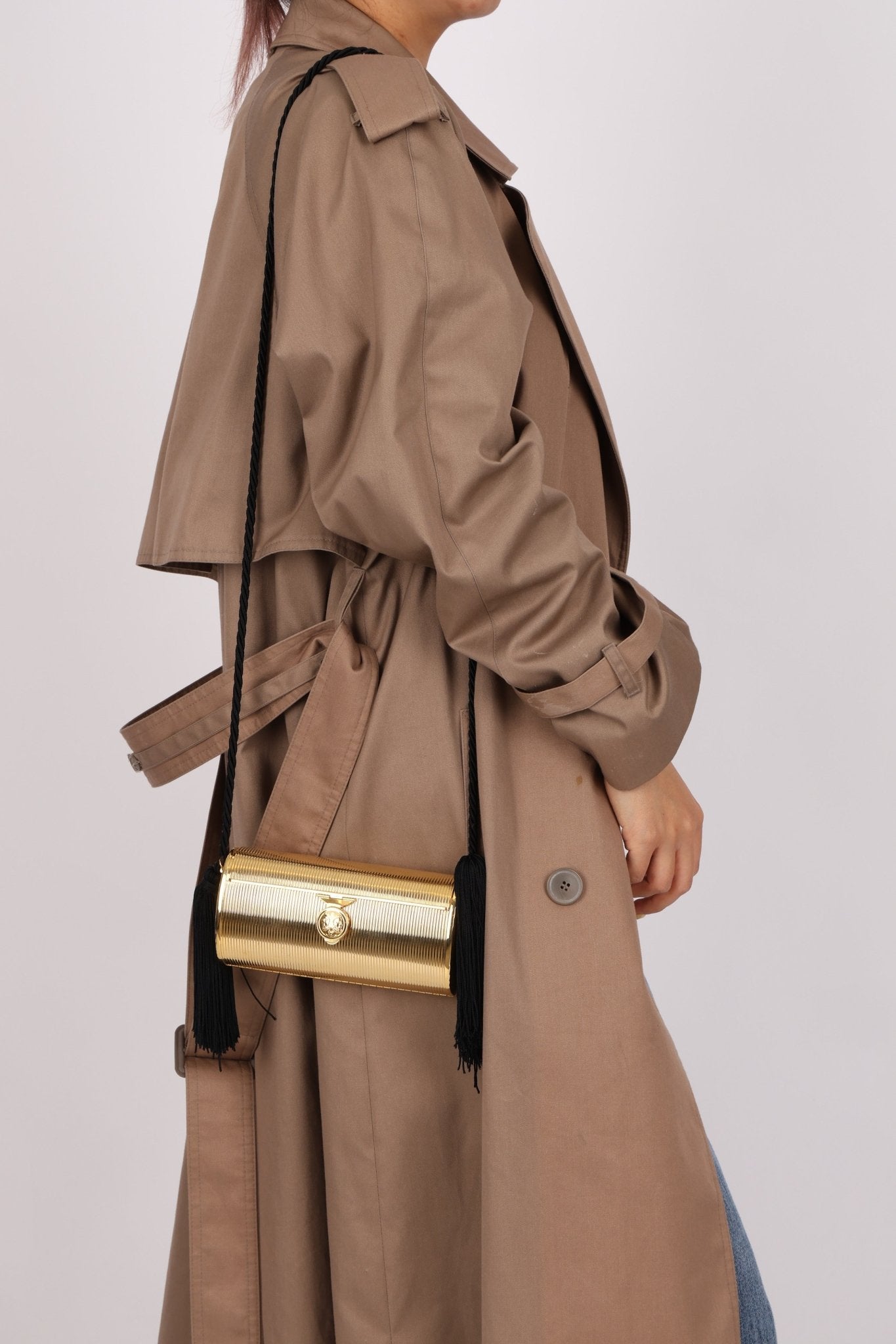 Radiating opulence, the metallic gold Fendi Roma Coin Clasp Clutch is a rare statement piece that doubles as a striking evening accessory. Finished with elegant tassel embellishments, it embodies uniqueness and timeless glamour in every detail.