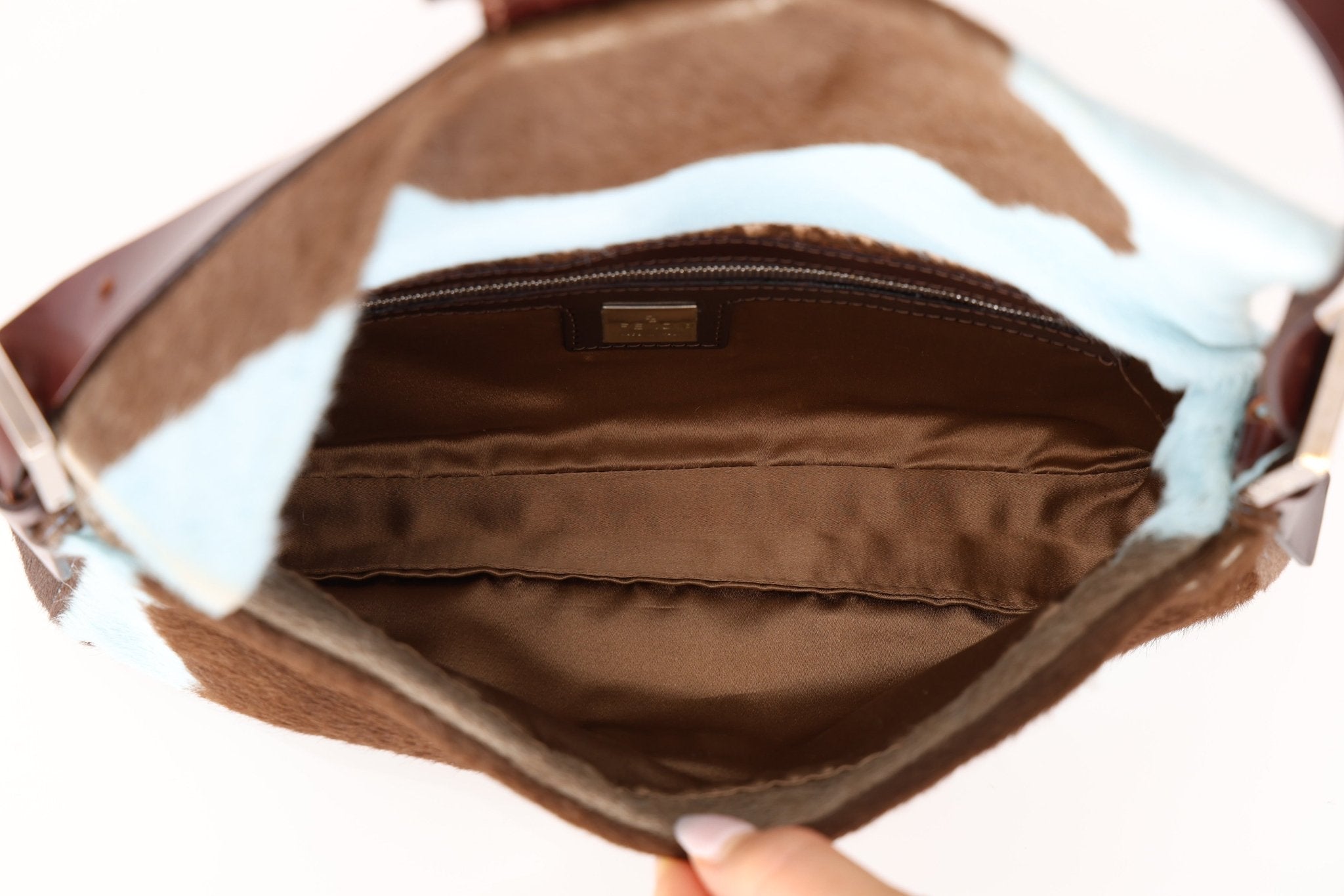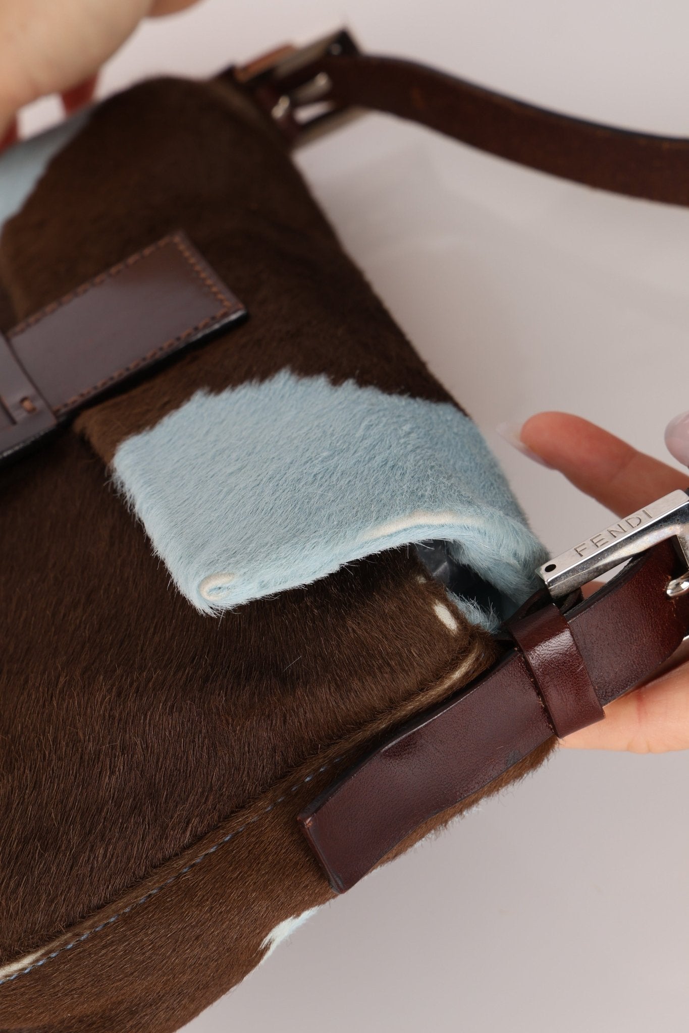 This Fendi Ponyhair Baguette features a bold contrast of chocolate brown and powder blue in luxe calf hair, making it a standout twist on the iconic silhouette. Finished with rich leather trim and a statement FF buckle, it's a collector’s dream with serious Y2K edge.