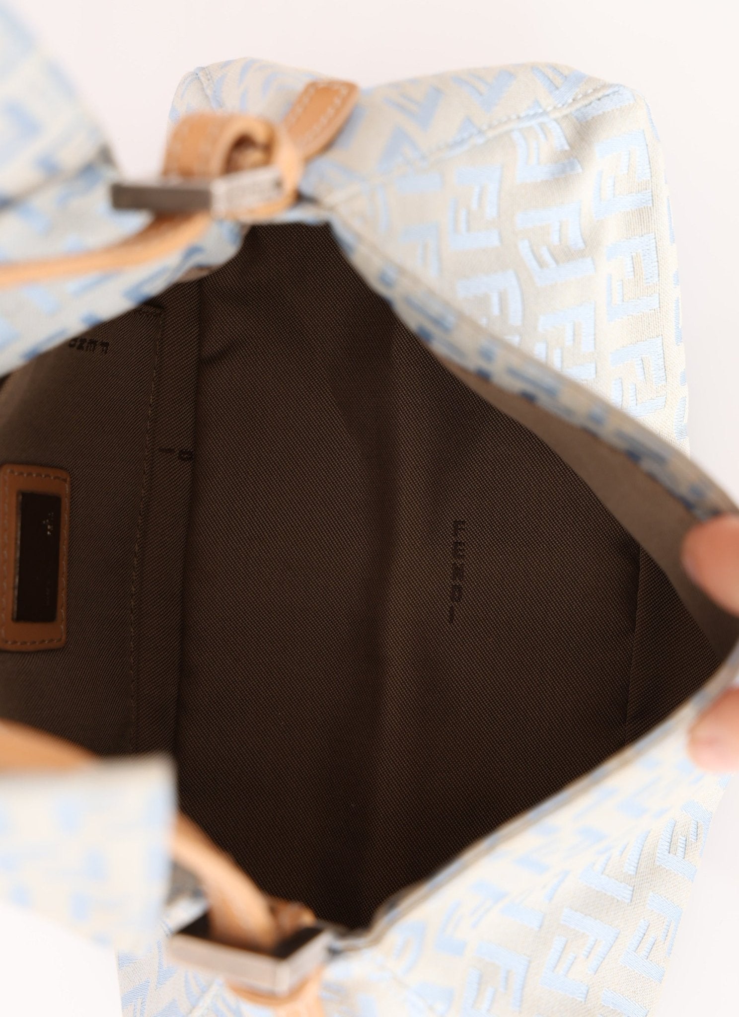 A stylish embodiment of the brand's bold, playful aesthetic, this Fendi Zucchino Canvas Mini Mamma Baguette features the iconic Zucchino monogram in a powdery baby blue. Featuring the brand's iconic Zucchino print that was introduced in 1965, this pochette is the cutest addition to any collection!