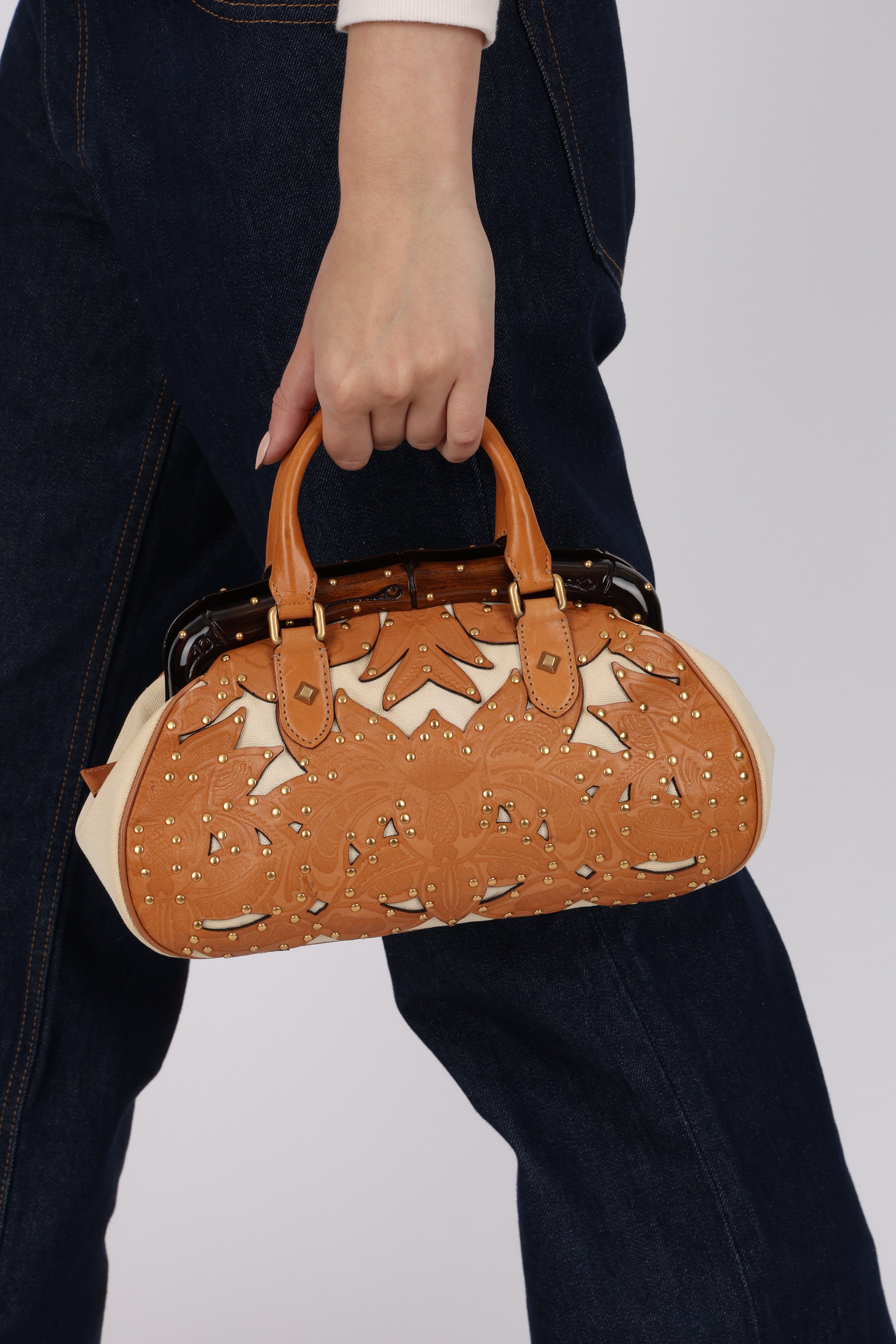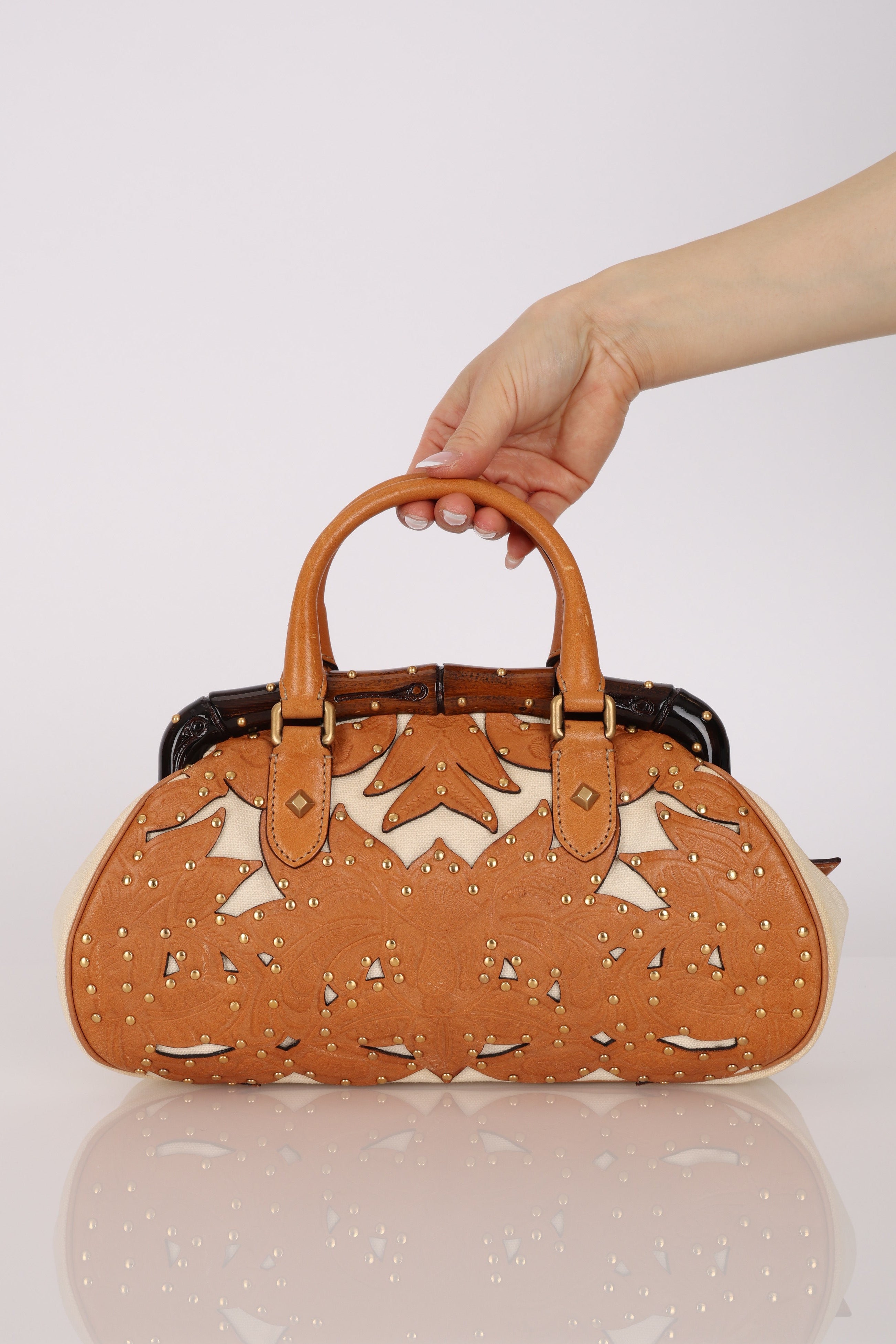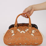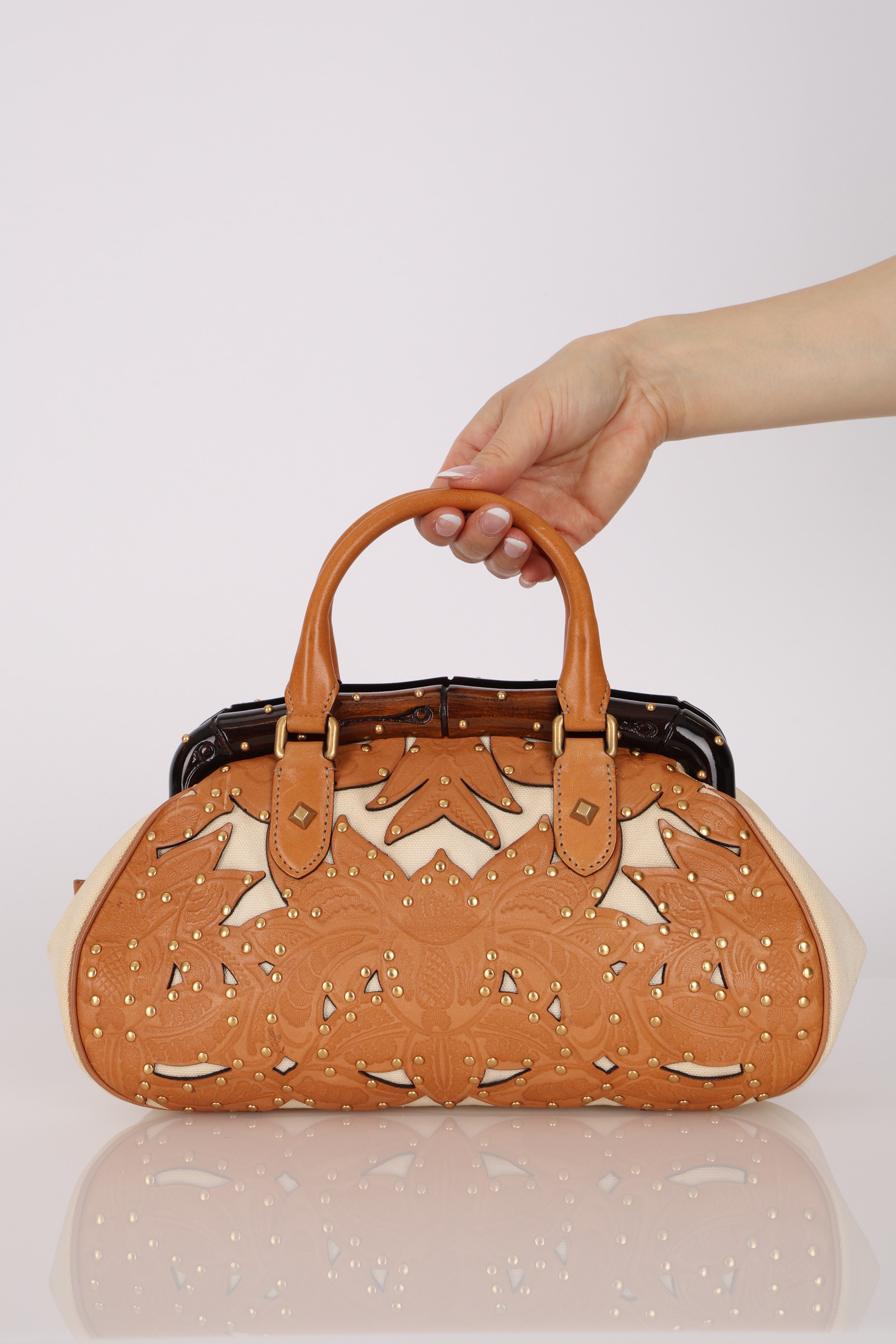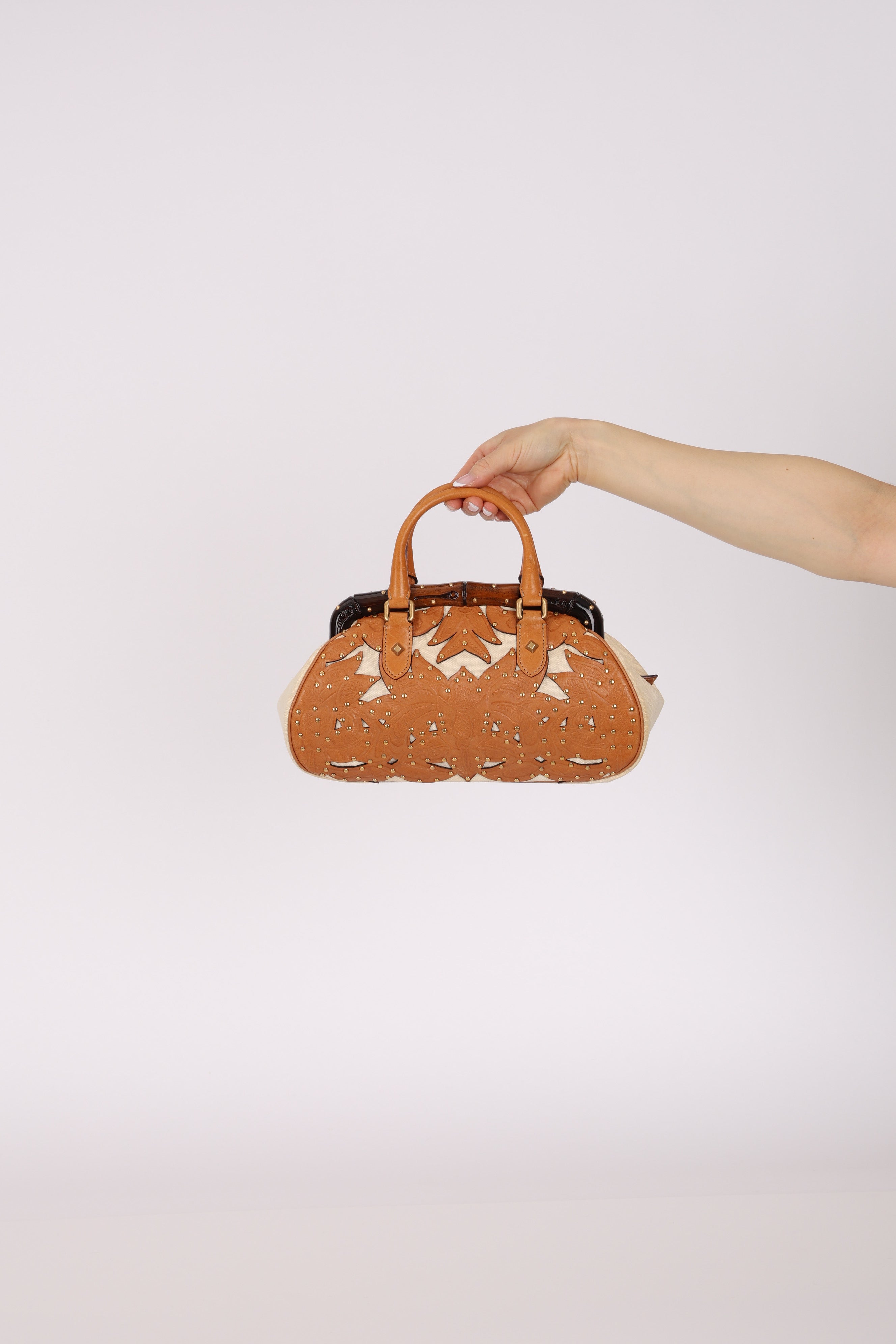 Rare Gucci Tan Lasercut-Leather Studded Bamboo Frame Bag