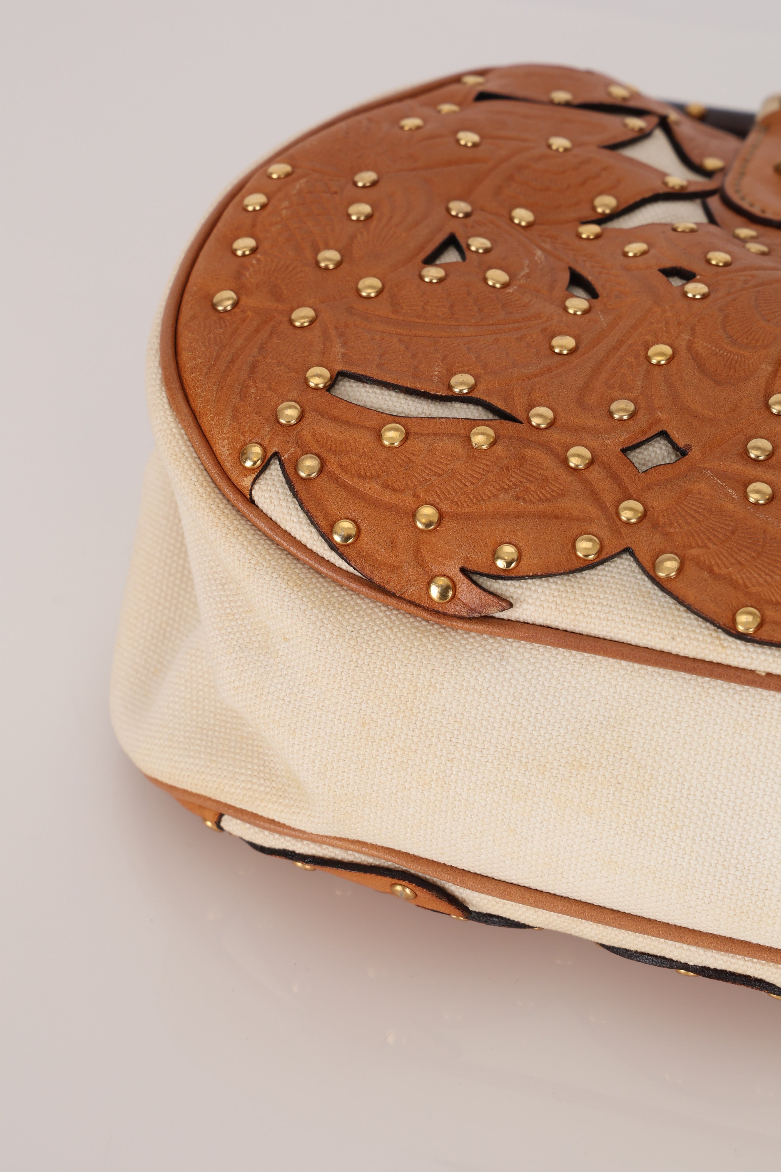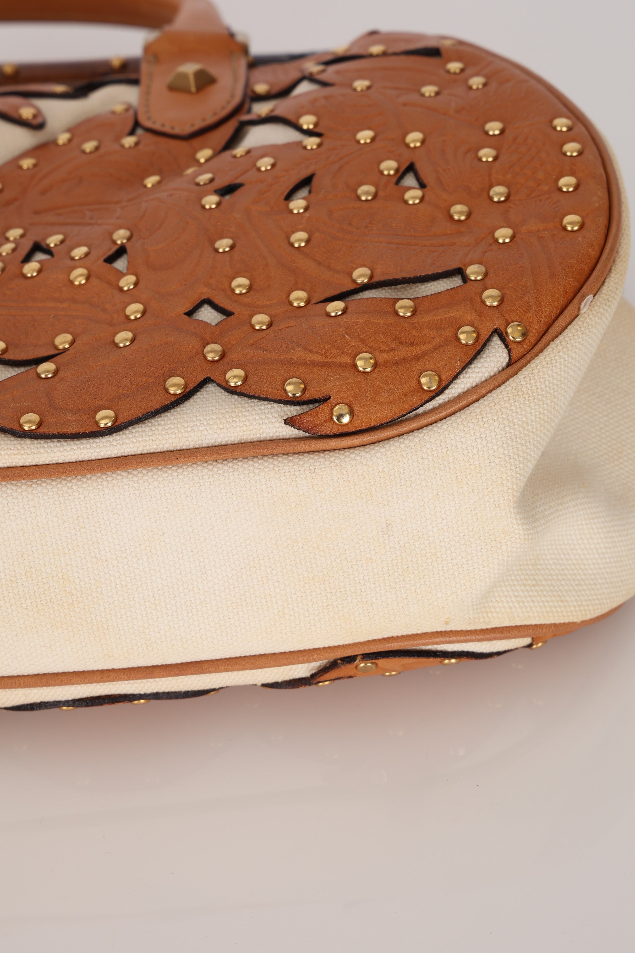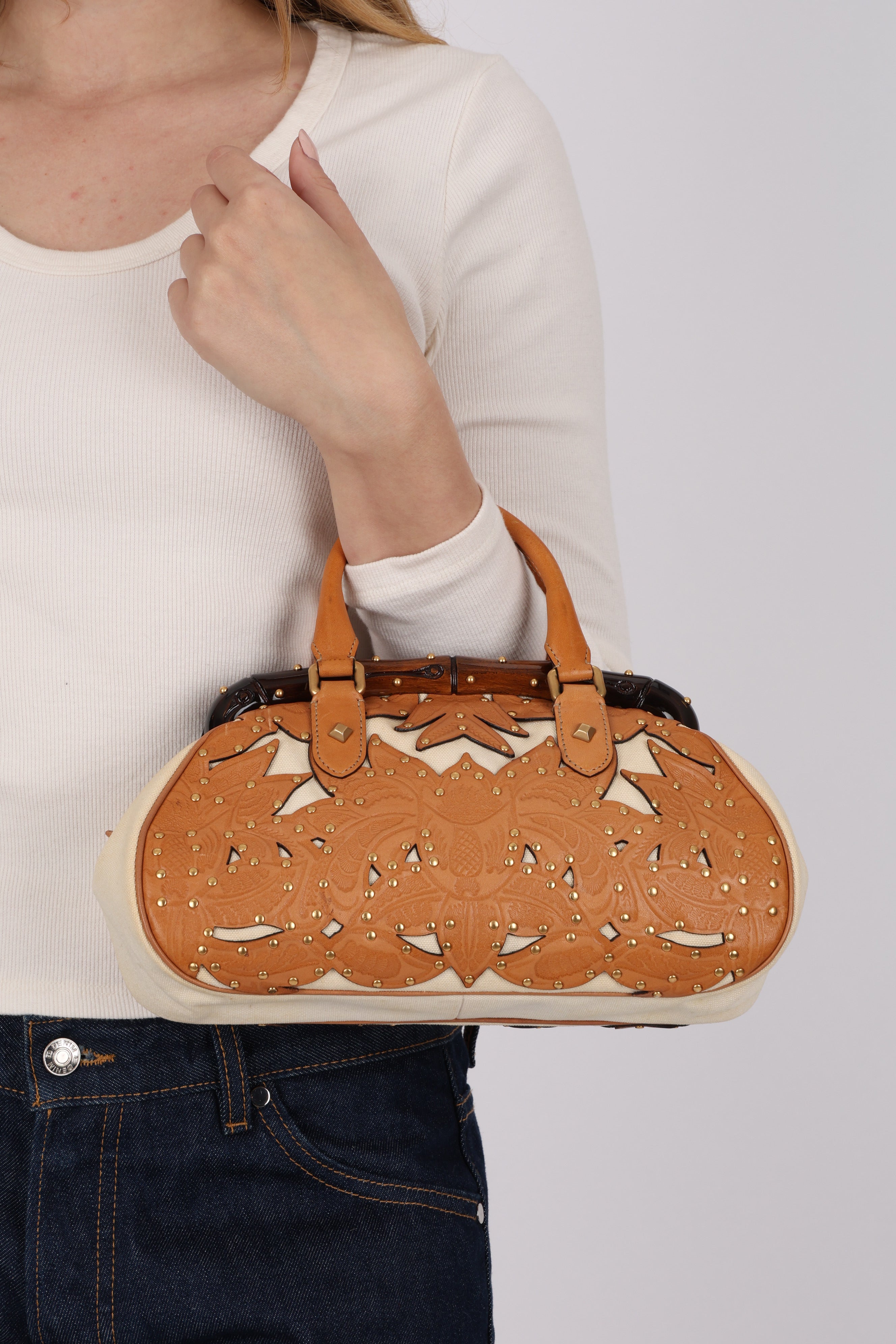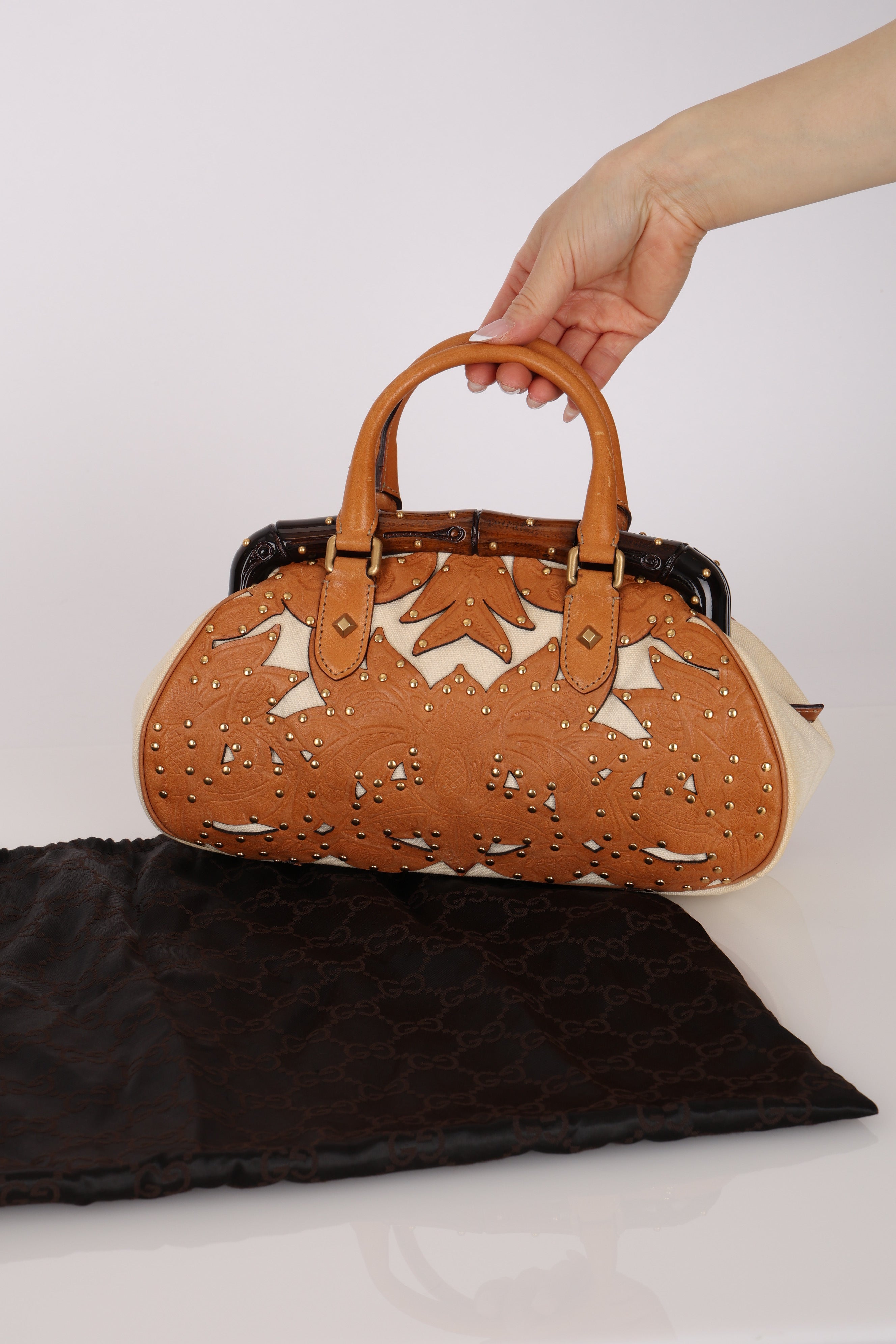Rare Gucci Tan Lasercut-Leather Studded Bamboo Frame Bag