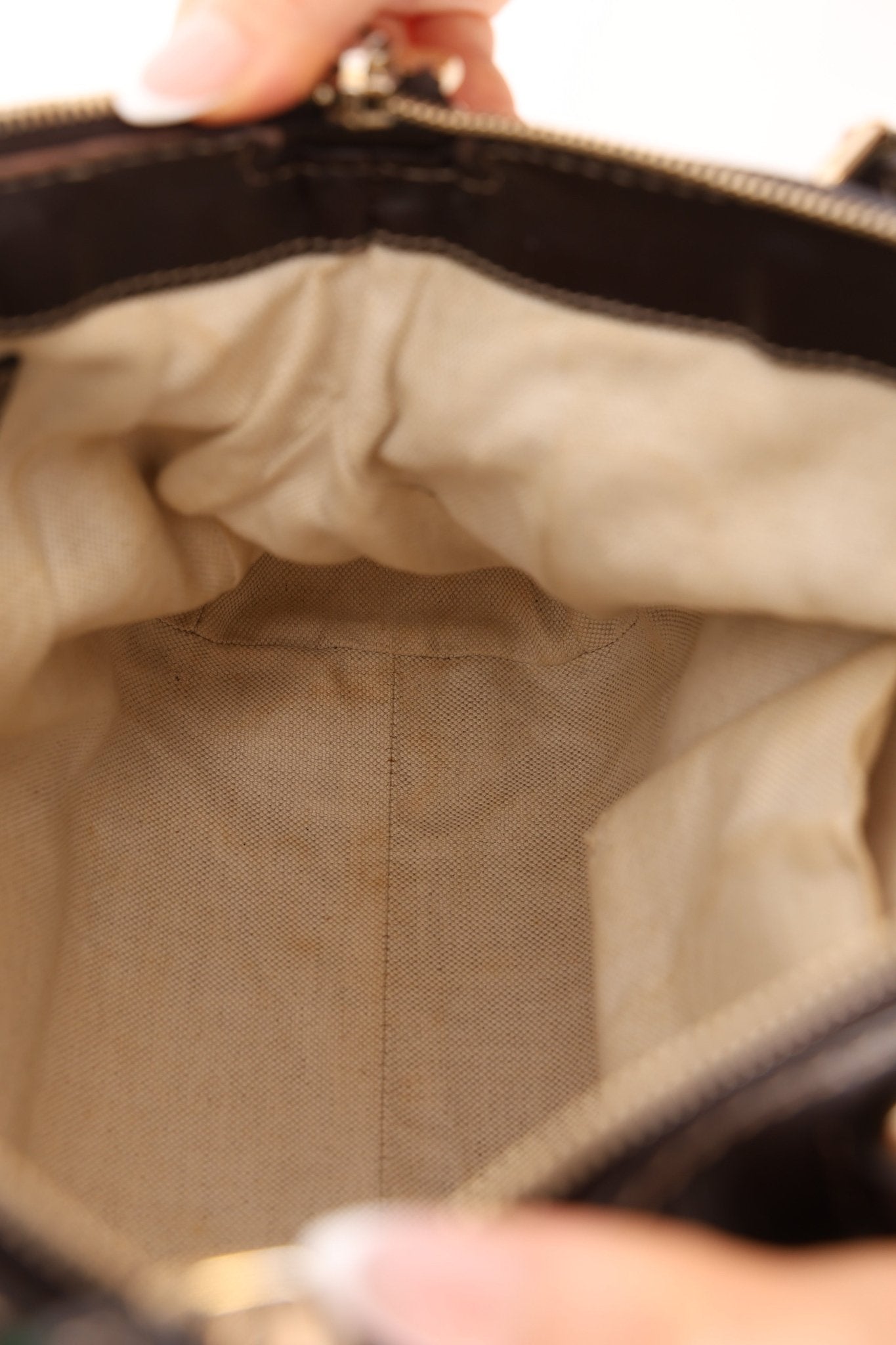 Light wear on edges. Wear in interior. Tiny fabric run near leather edge piping.