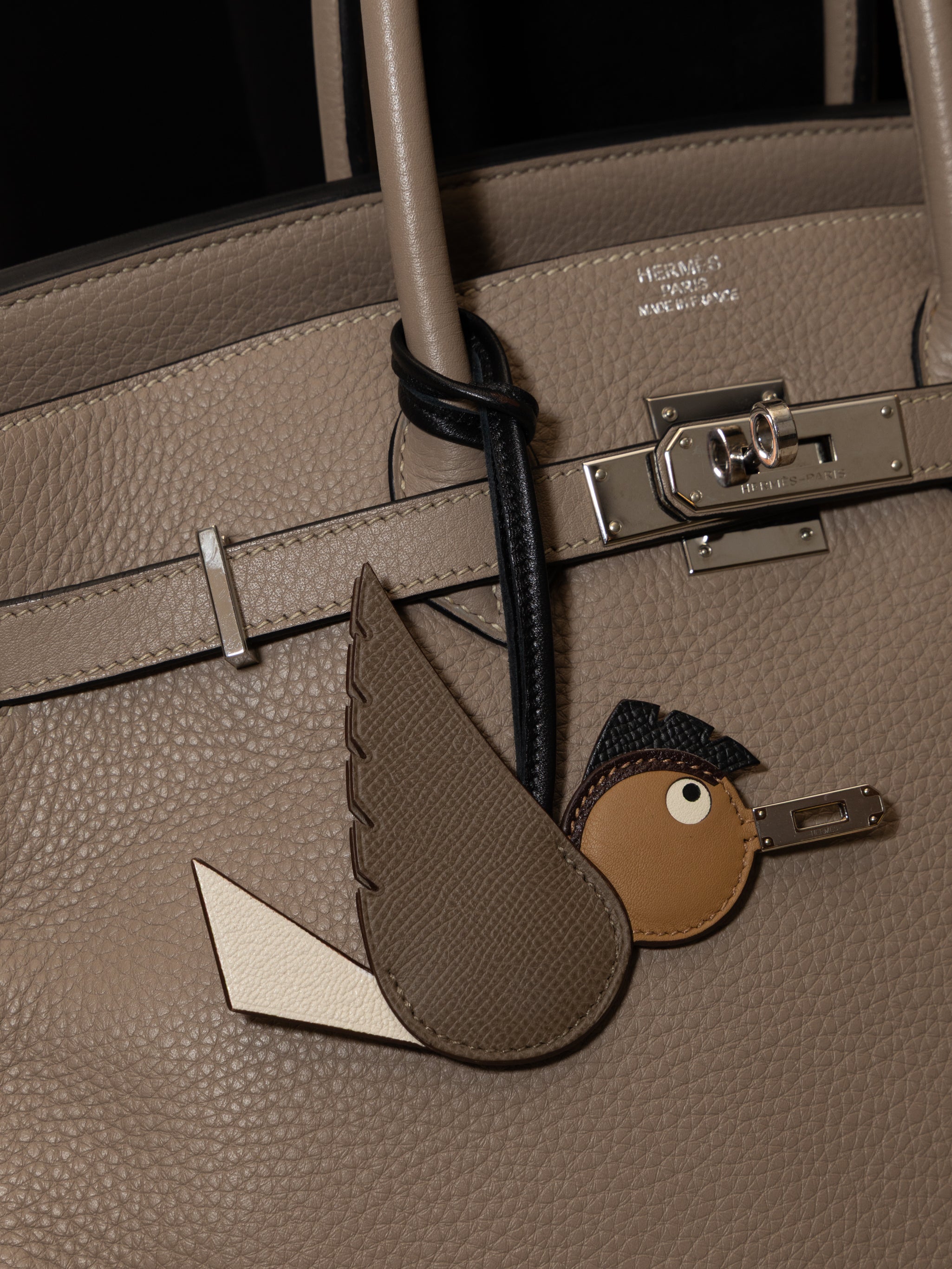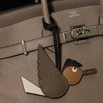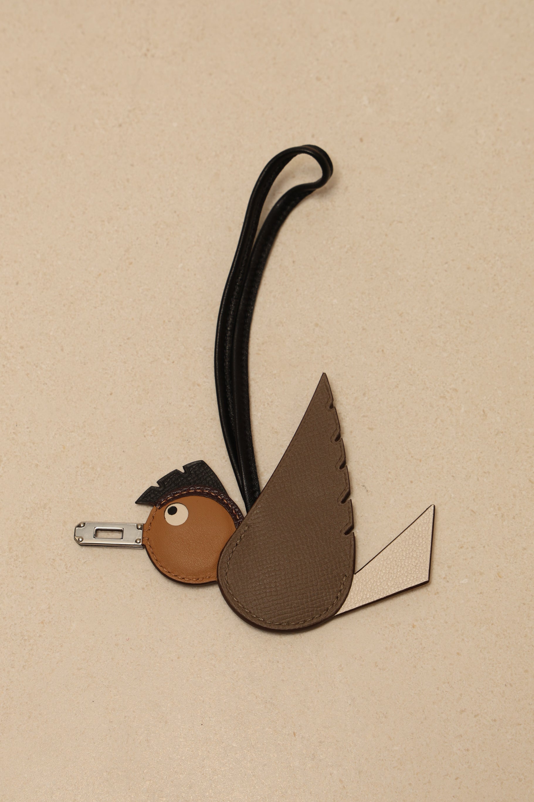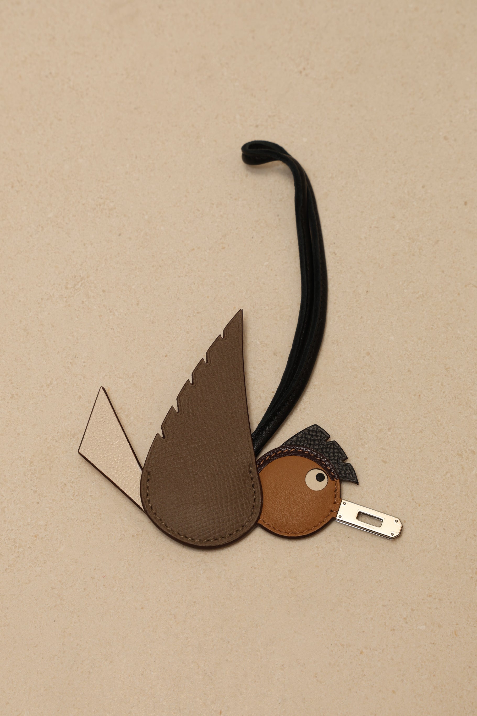 Crafted in a playful medley of iconic Hermès hues—etain, nata, biscuit, and noir—this little bird comes to life in Epsom, Chevre Mysore, and Swift leathers. The finishing touch? A beak fashioned from an authentic Hermès turnlock in sleek palladium hardware—an irresistible detail that makes this accessory truly unforgettable.