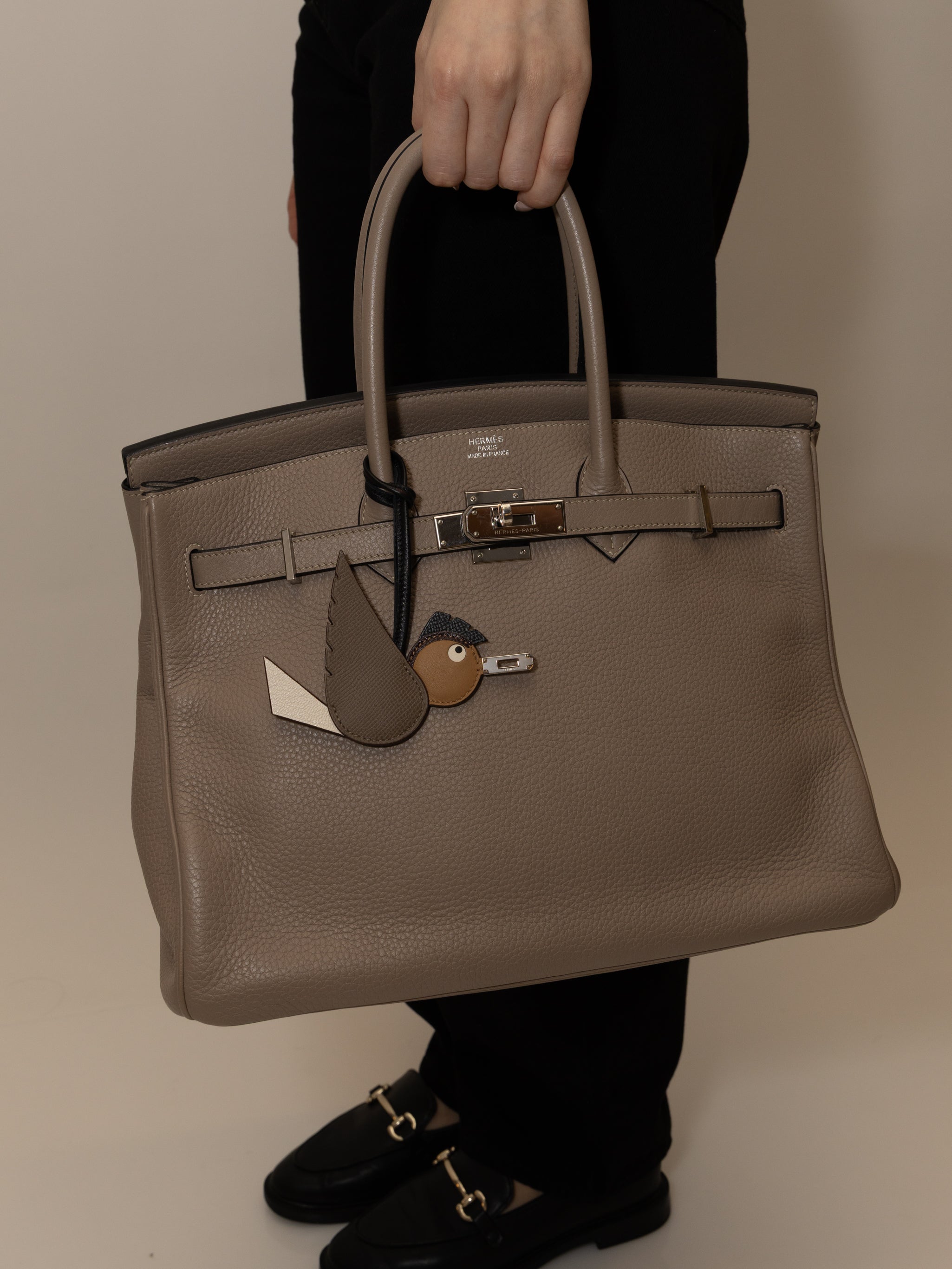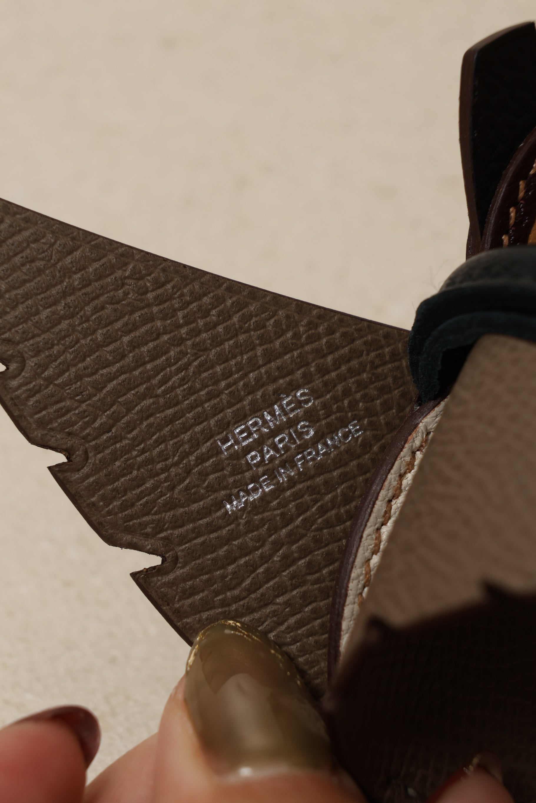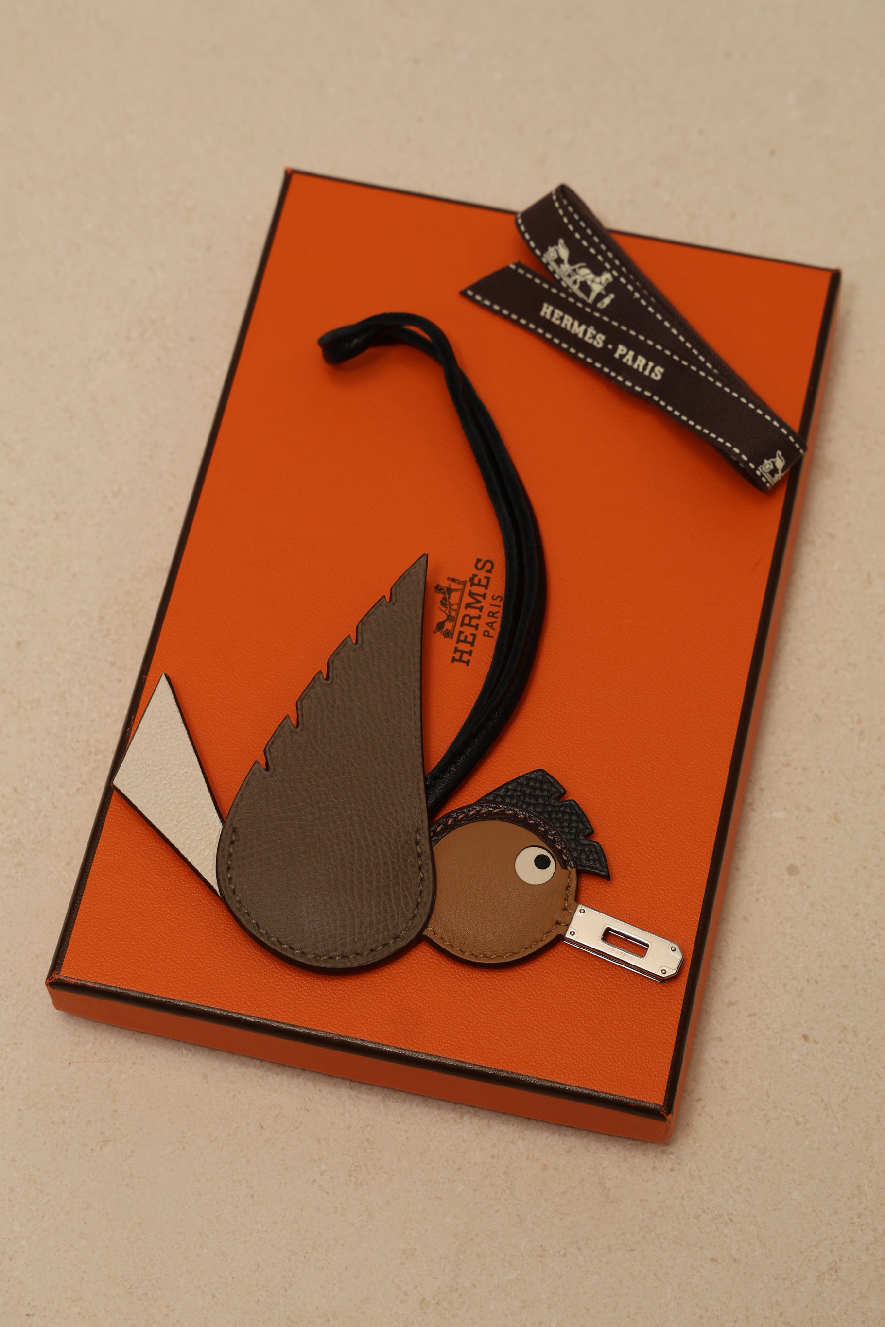Crafted in a playful medley of iconic Hermès hues—etain, nata, biscuit, and noir—this little bird comes to life in Epsom, Chevre Mysore, and Swift leathers. The finishing touch? A beak fashioned from an authentic Hermès turnlock in sleek palladium hardware—an irresistible detail that makes this accessory truly unforgettable.