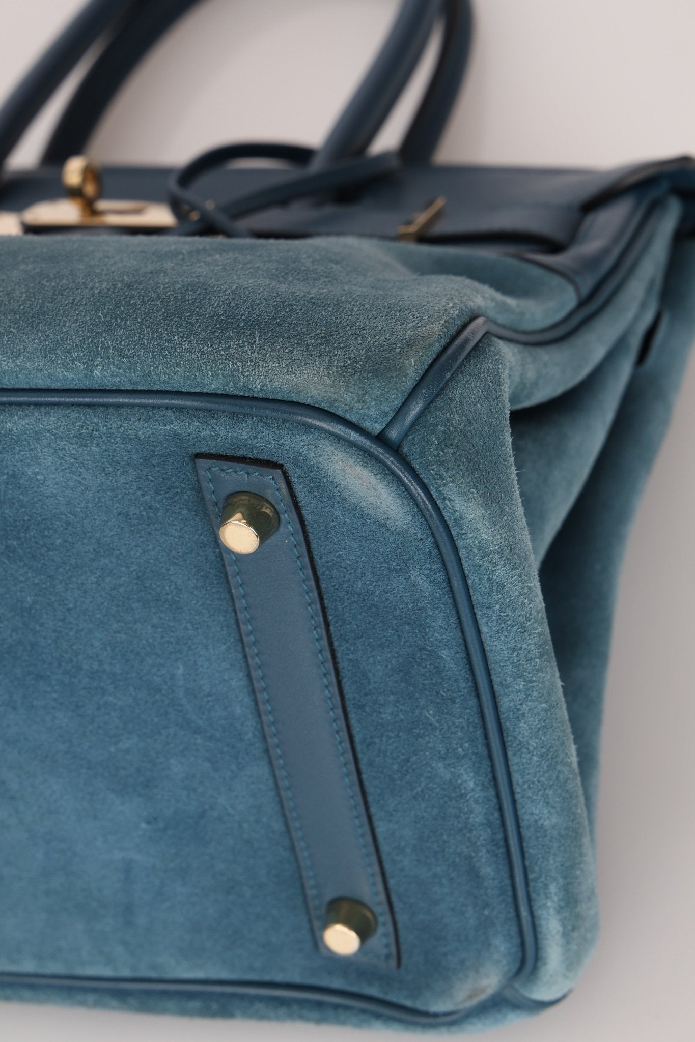 Light scratches on hardware. Normal wear throughout suede.