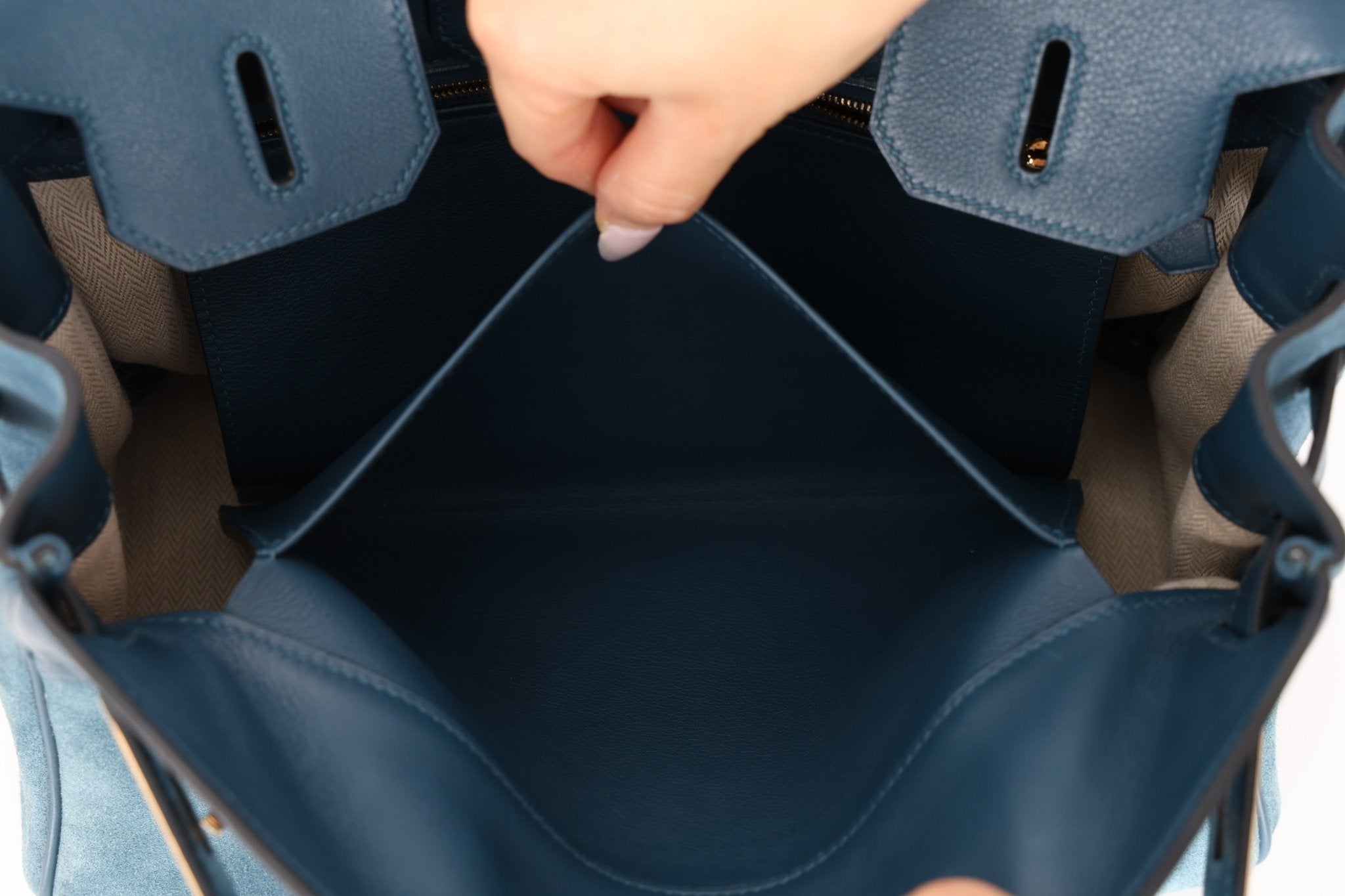 This Limited Edition 2012 Hermès Birkin 30 in the highly coveted rare color combo (Bleu Tempête + gold hardware) this color pairs plush Veau Doblis suede with smooth Swift leather in the rare Retourne style, finished with Gold hardware. The tonal contrast and supple structure create a quietly luxurious statement that feels both elevated and effortless. A coveted collector’s piece in an exceptional colorway that rarely surfaces on the market.
