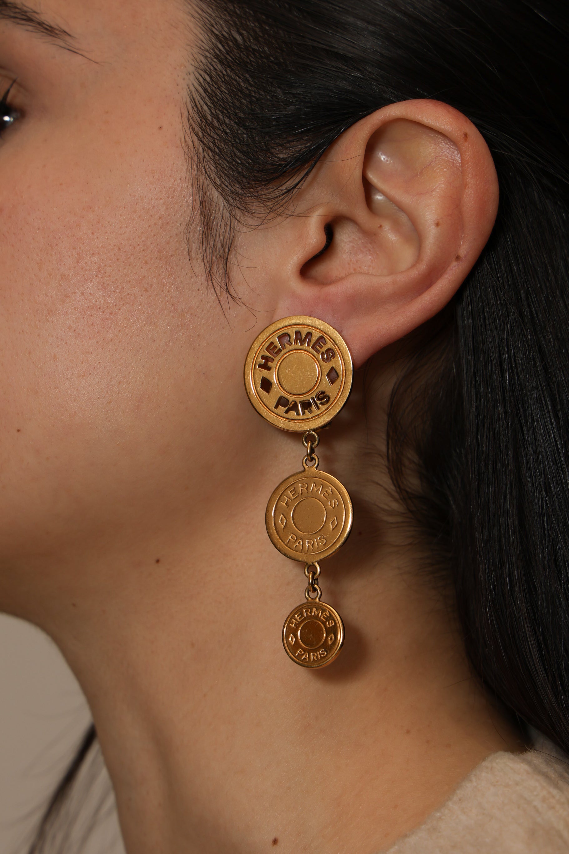 The classic clou de selle, times three! Inspired by their equestrian heritage, the Clou de Selle motif originates from saddle nails. Seen here in three different sizes all cascading down the ear.