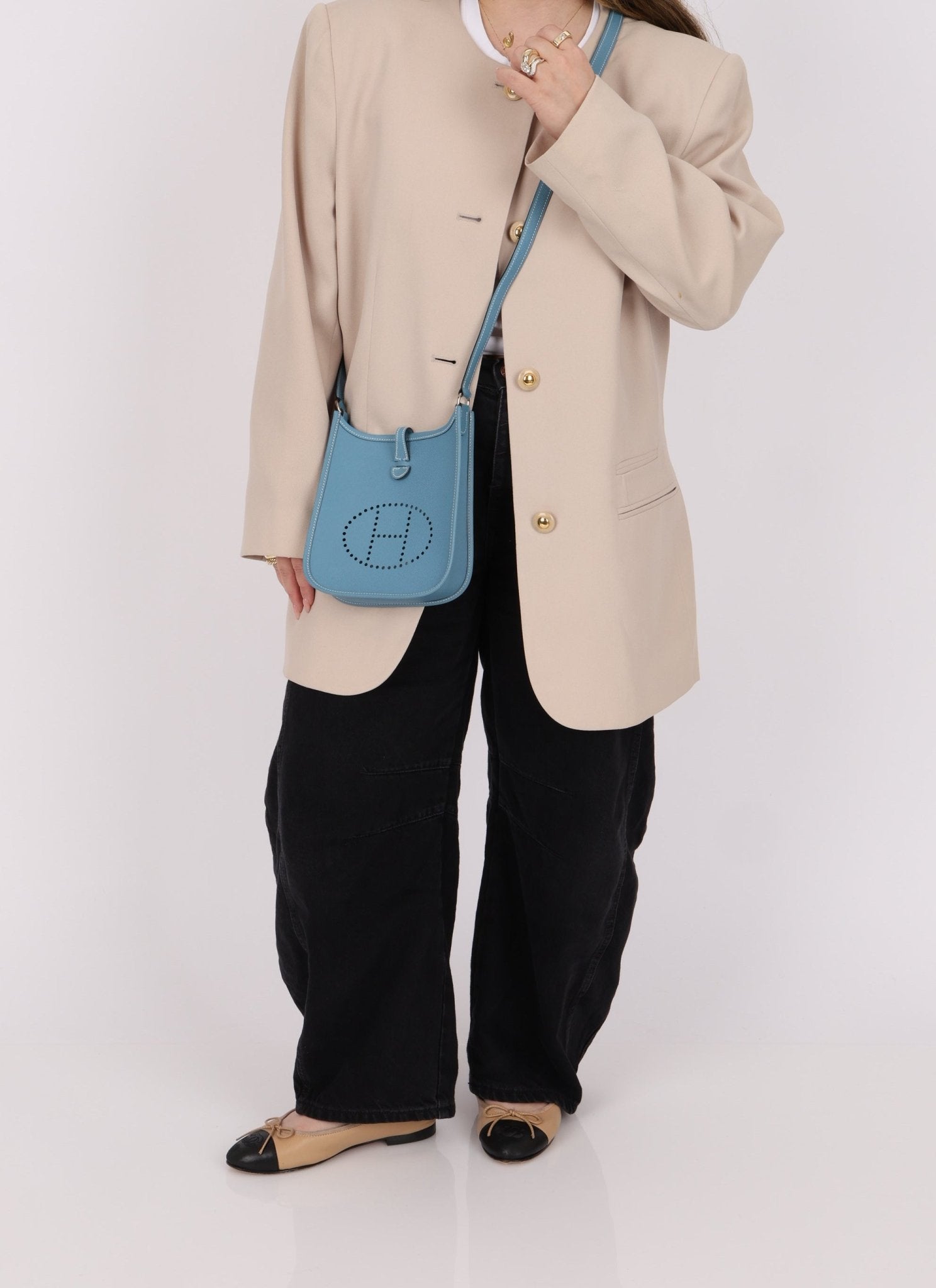 The Evelyne, specifically in the TPM size, has become one of Hermès' most popular bags due to its perfectly compact and functional design. This particular piece is a rare gem due to the matching Bleu Jean Epsom leather crossbody strap for a sleek monochrome look.