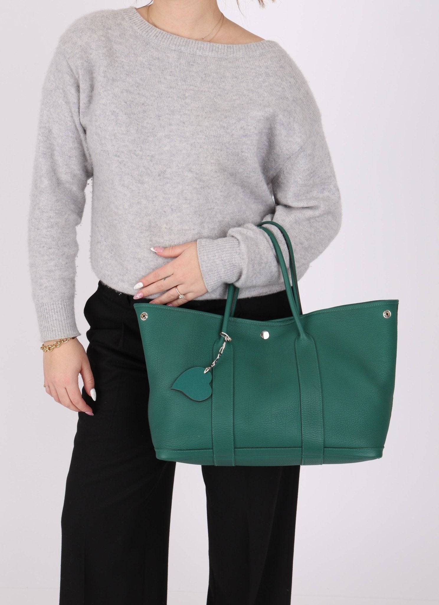 The Hermès 2013 Malachite Negonda Garden Party 36 is a timeless and elegant tote bag that epitomizes understated luxury. Its compact size makes it ideal for everyday use, offering ample space for essentials while remaining lightweight and easy to carry. The fact that this one comes with an Hermés heart charm makes this bag truly a standout!