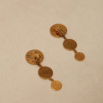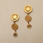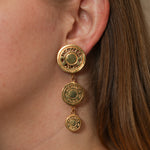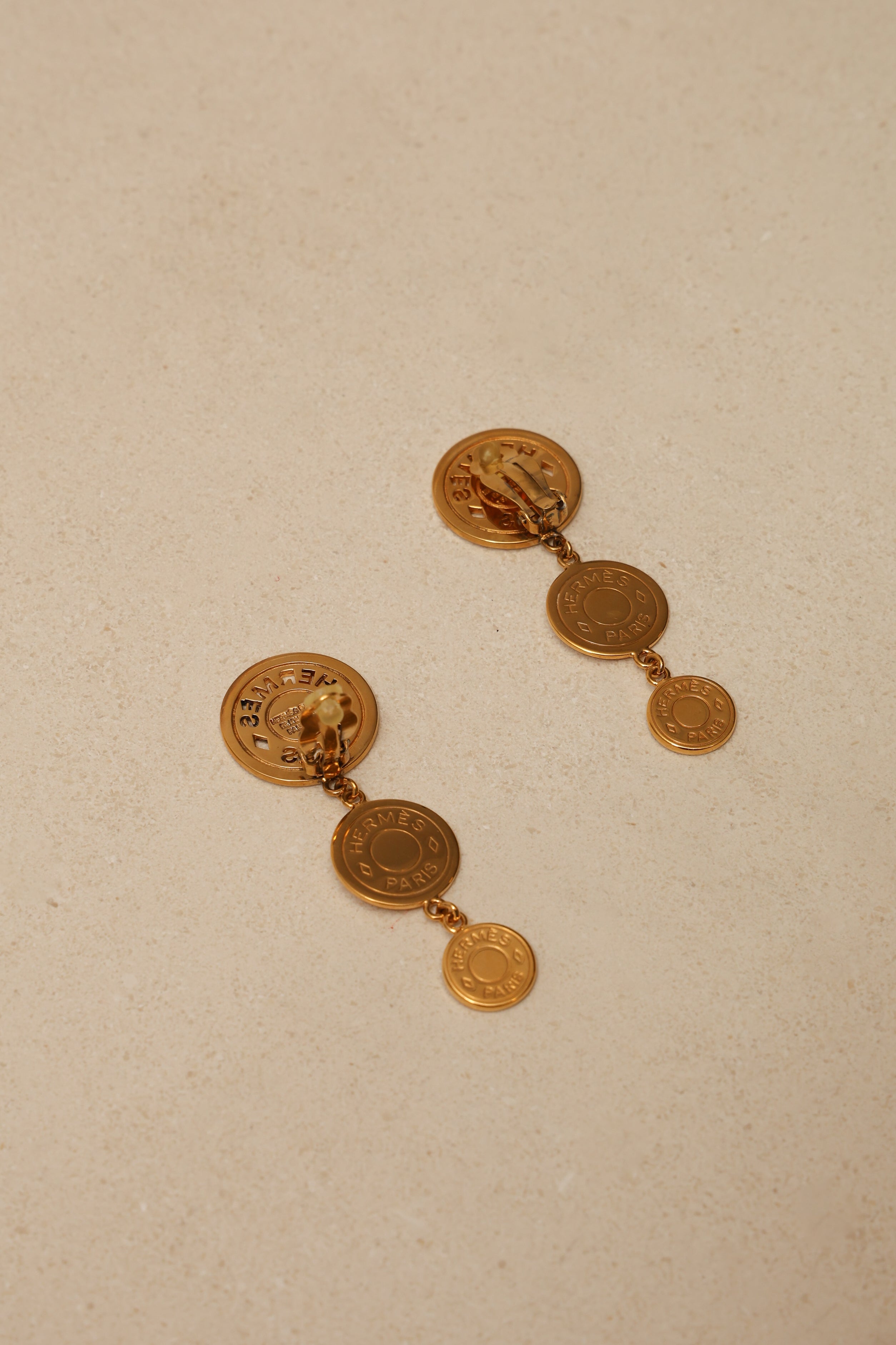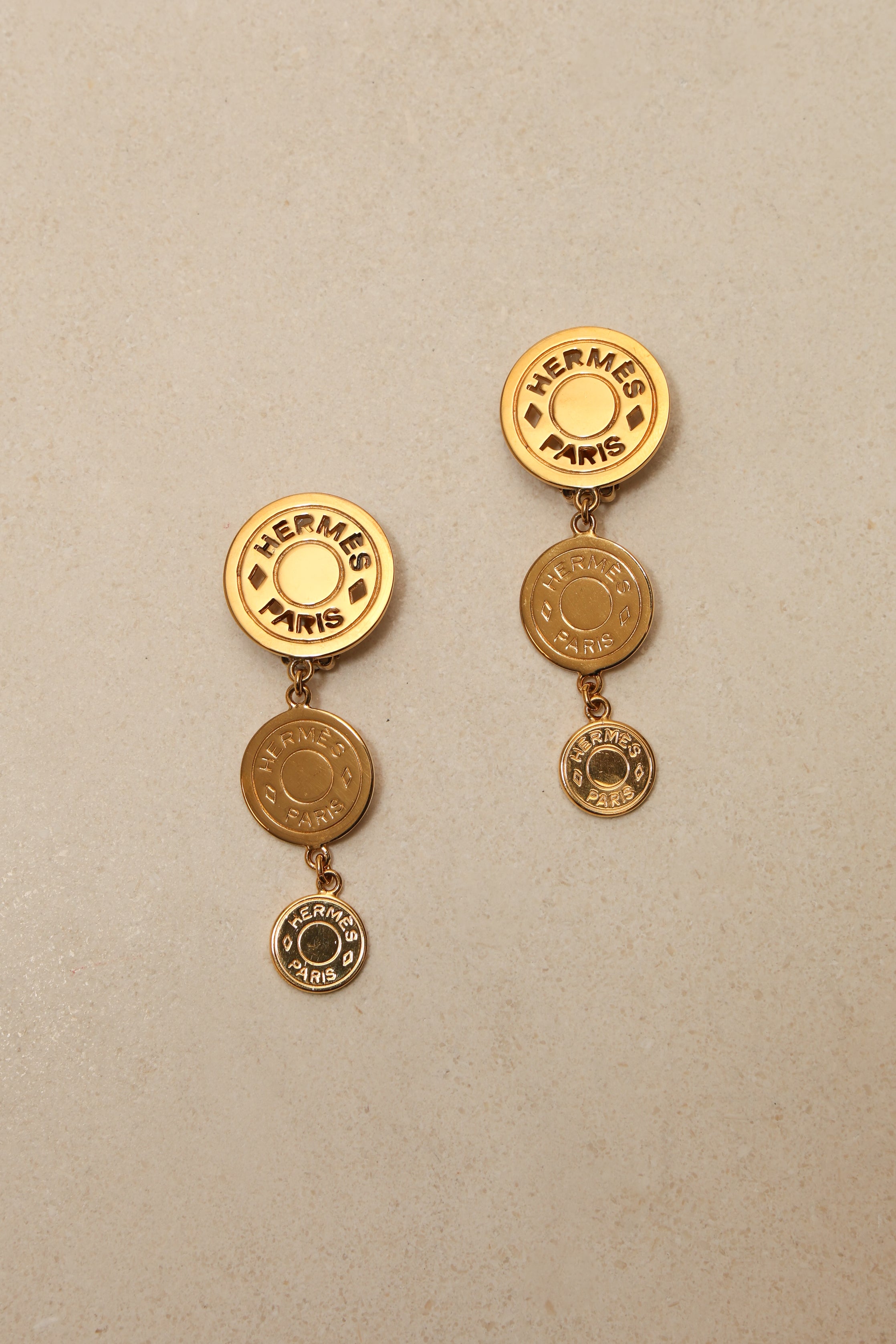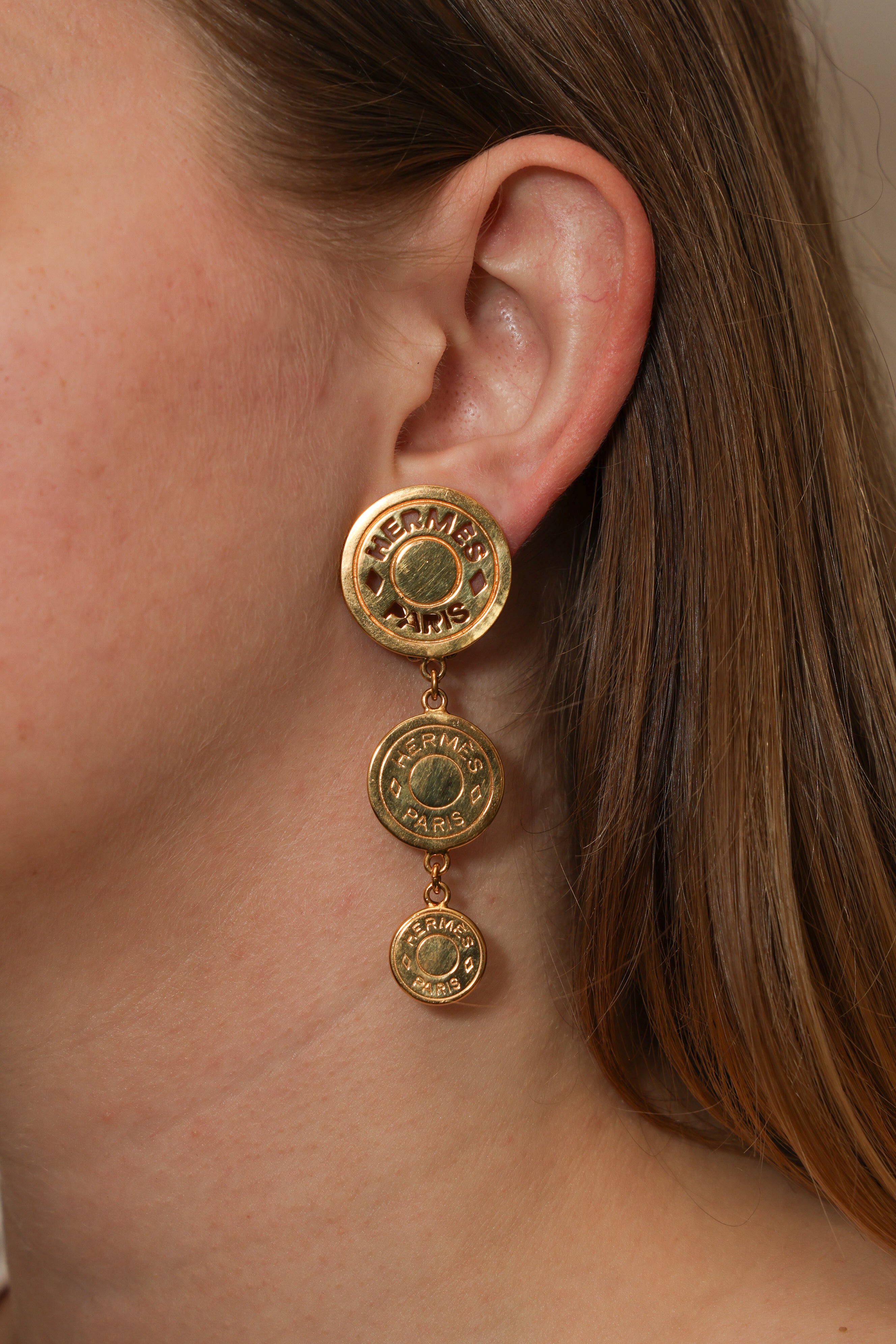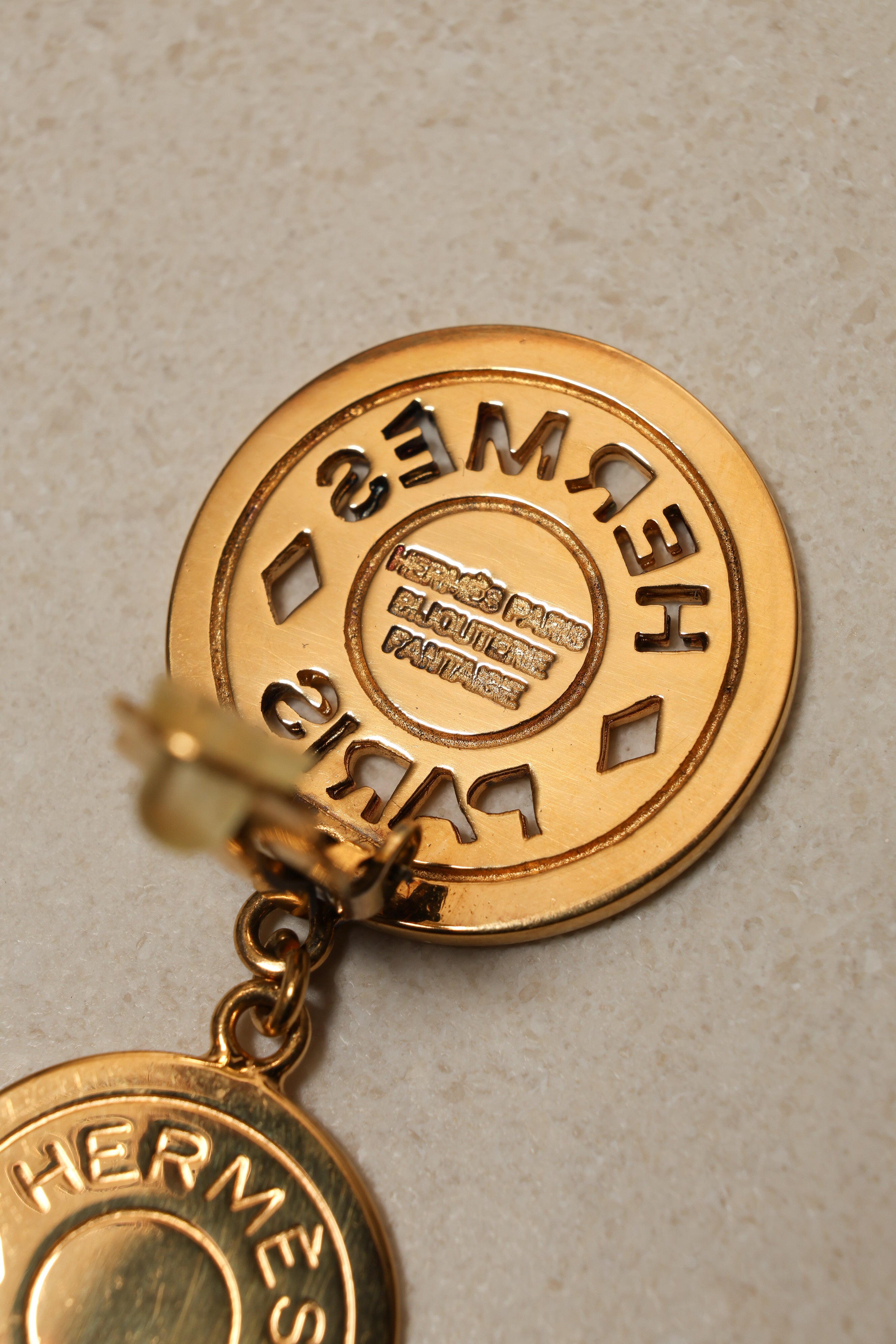 Clou times three! Directly translated to "nail of the saddle", the Hermès Clou de Selle motif showcases the brands creativity imagining saddle materials into pieces of luxury fashion. These earrings feature the brands script upon tiered gold plated medallions as a versatile and elegant statement.